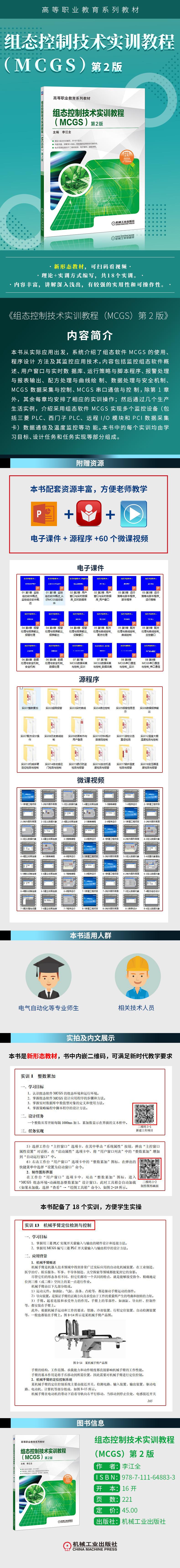 Partindo da aplicação prática, este livro apresenta sistematicamente o uso do software de configuração MCGS, métodos de programação e sua tecnologia de aplicação de monitoramento. O conteúdo inclui uma visão geral do software de configuração de monitoramento, janela do usuário e banco de dados em tempo real, estratégia de operação e programa de script, processamento de alarmes e saída de relatórios, processamento de receitas e desenho de curvas, processamento de dados e mecanismo de segurança, aquisição e controle de dados MCGS, comunicação serial e controle MCGS. Com exceção do Capítulo 1, cada capítulo possui operações de treinamento prático correspondentes; finalmente, por meio de vários exemplos de produção e vida útil, apresenta o uso do software de configuração MCGS para realizar funções de comunicação de dados e monitoramento de temperatura de múltiplos dispositivos de monitoramento (incluindo CLP Mitsubishi, CLP Siemens, módulo de E/S remota e placa de aquisição de dados PCI). Cada treinamento prático neste livro consiste em objetivos de aprendizagem, tarefas de projeto e implementação de tarefas. Este livro é rico em conteúdo, fácil de entender e possui forte praticidade e operabilidade. Pode ser usado por alunos de graduação e ensino superior profissionalizantes com foco em aplicação, com especialização em automação elétrica, mecatrônica, aplicação de computadores e outras áreas, e por pessoal de engenharia e técnico para aprendizado e referência.