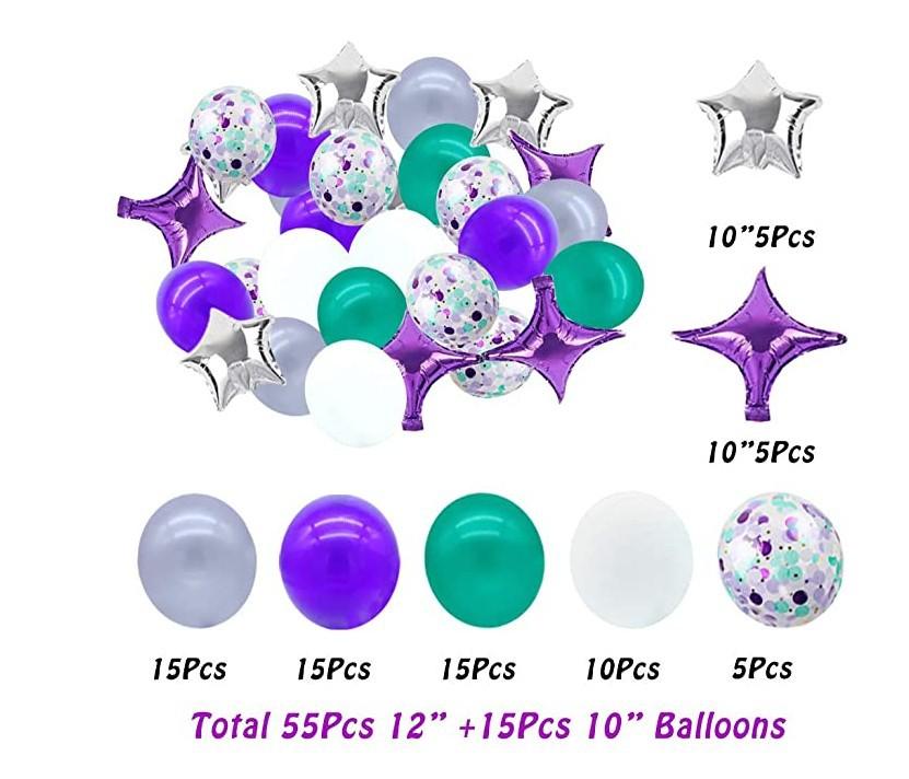 Um conjunto inclui: balões de látex de 12 polegadas e 2,8 g, 15 balões de papel, 15 balões roxos, 15 balões Tiffany e 15 balões rosa claro.