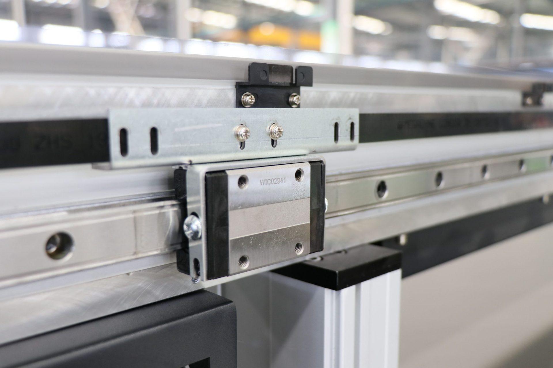 Viga principal extra larga e extra grossa com trilhos-guia duplos THK silenciosos de alta precisão. |