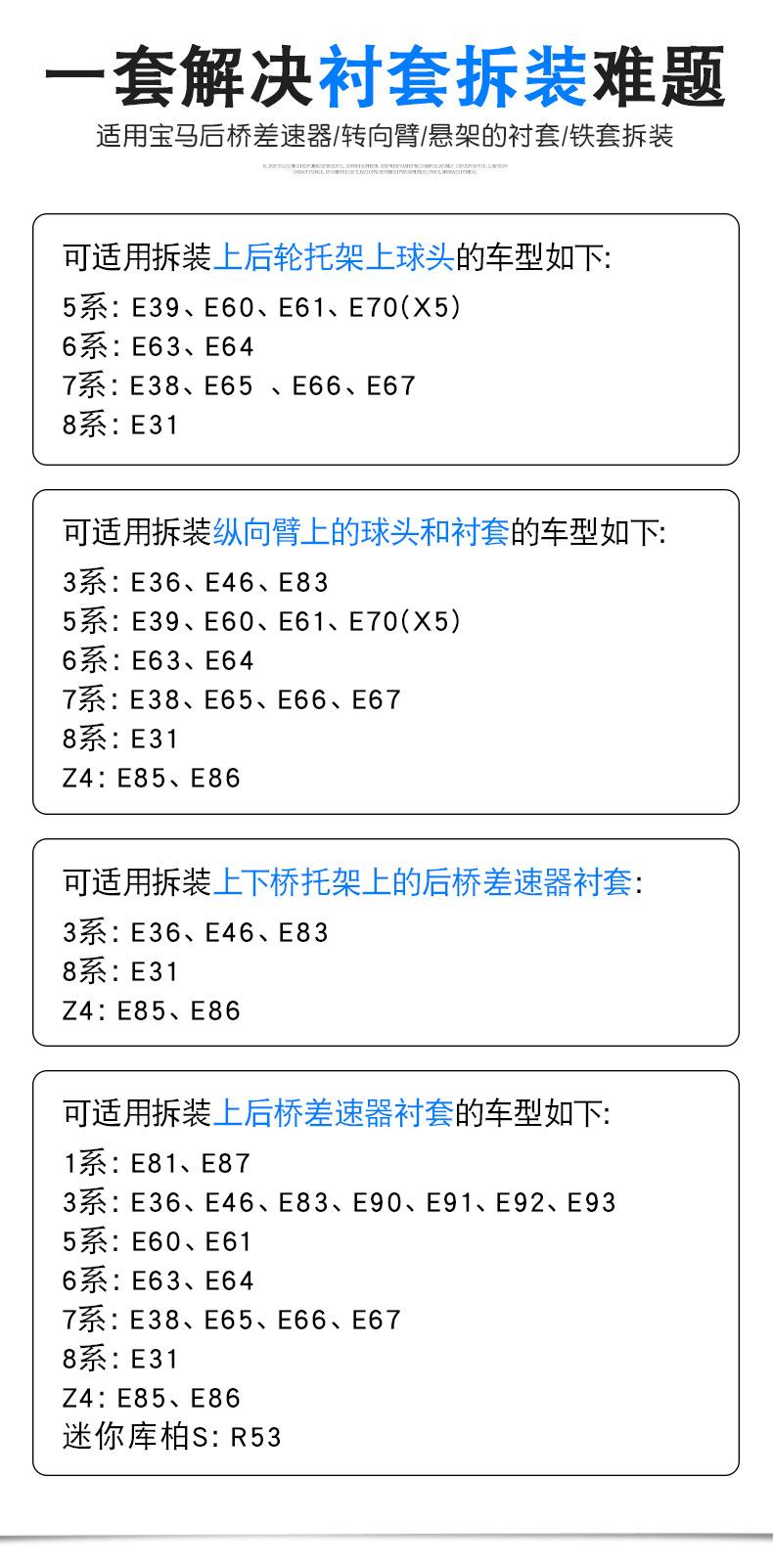 Ferramenta de substituição de bucha de manga de borracha para suspensão do braço de direção diferencial do eixo traseiro BMW E36E463839