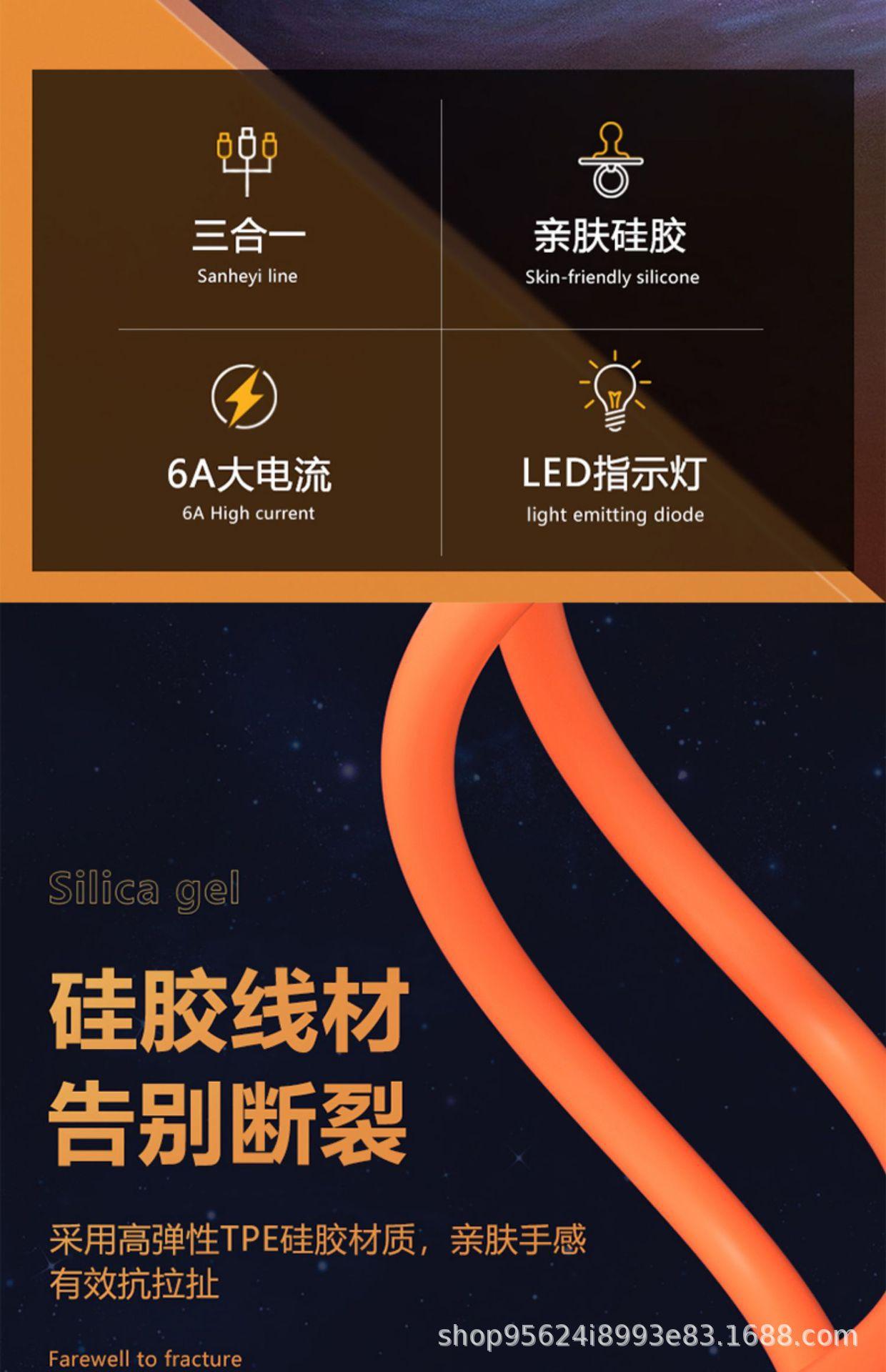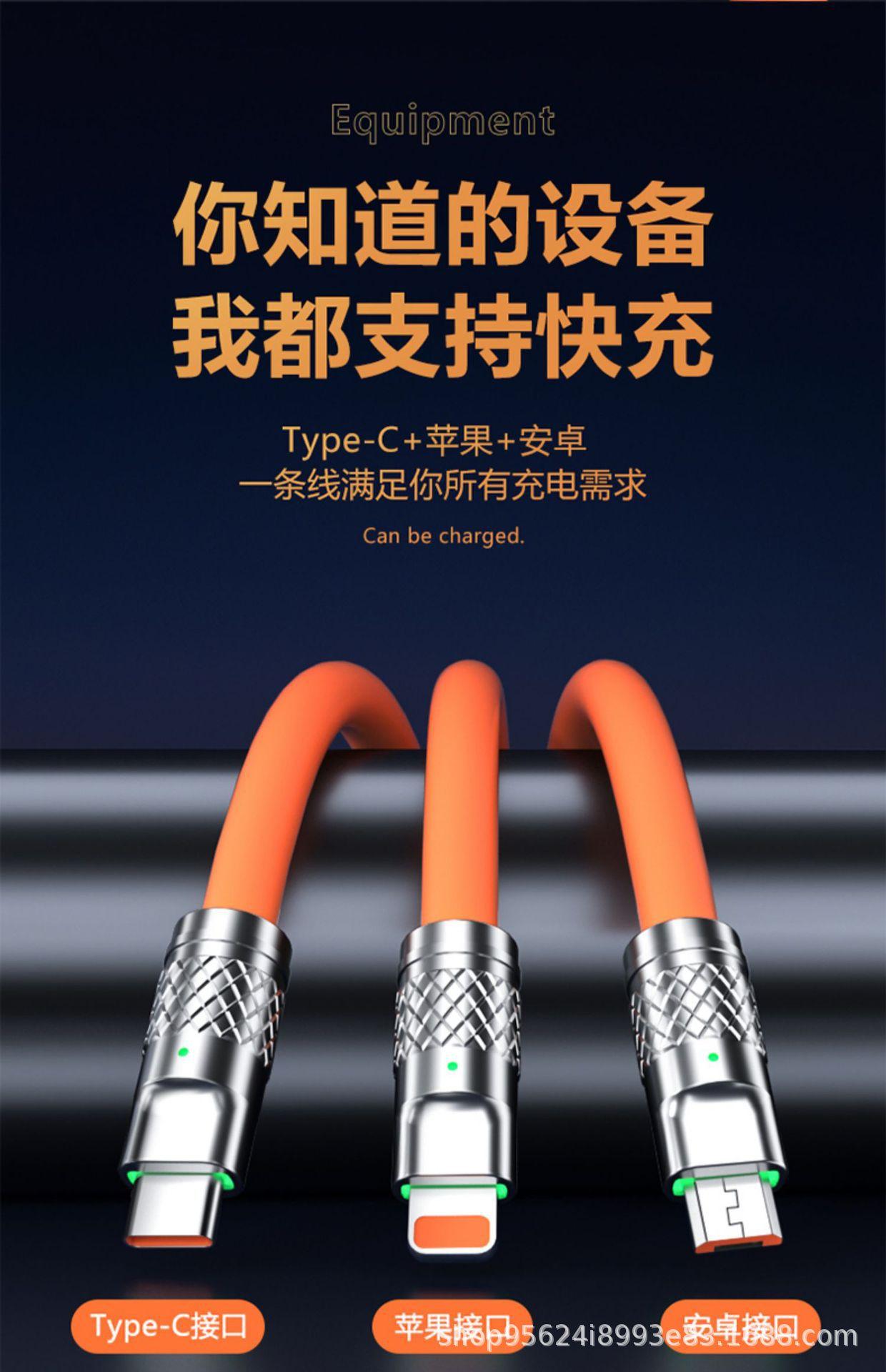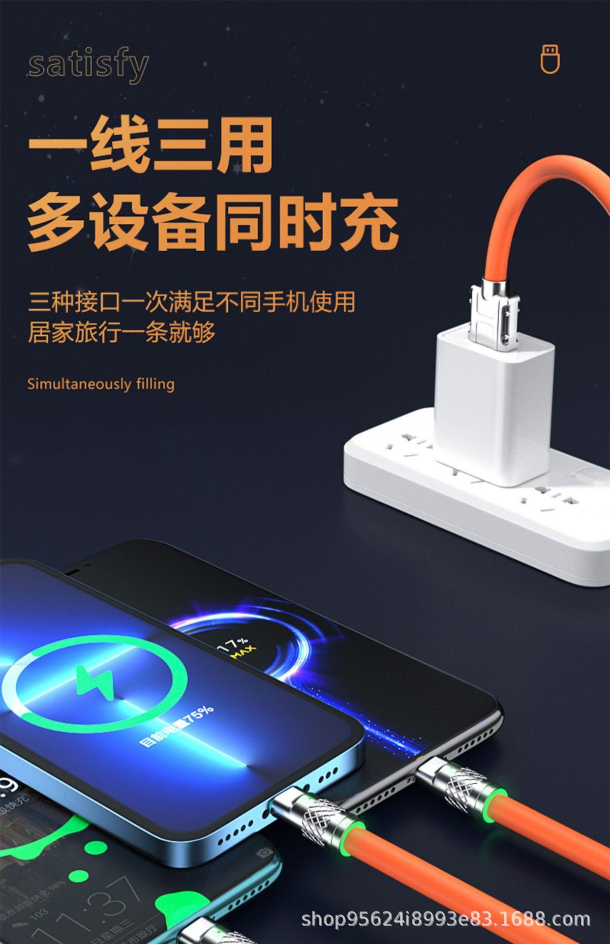 O cabo de dados de celular de carregamento super rápido de um para três é adequado para carregamento multicabeças três em um Apple Huawei Android.