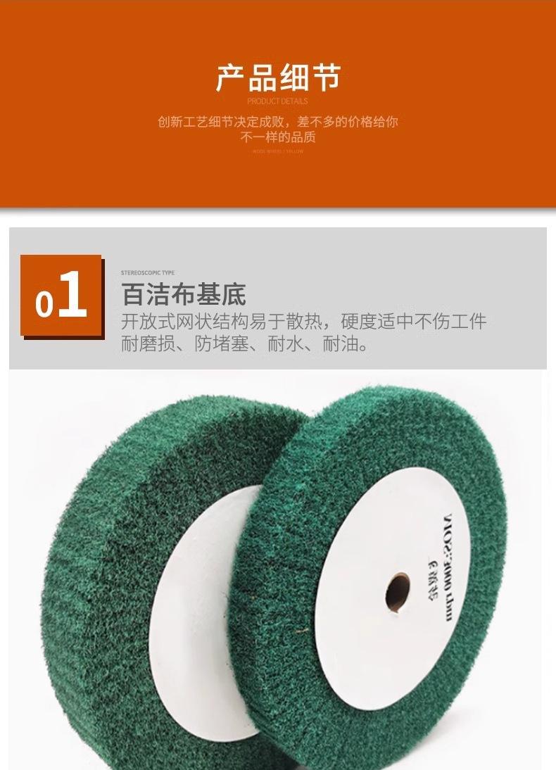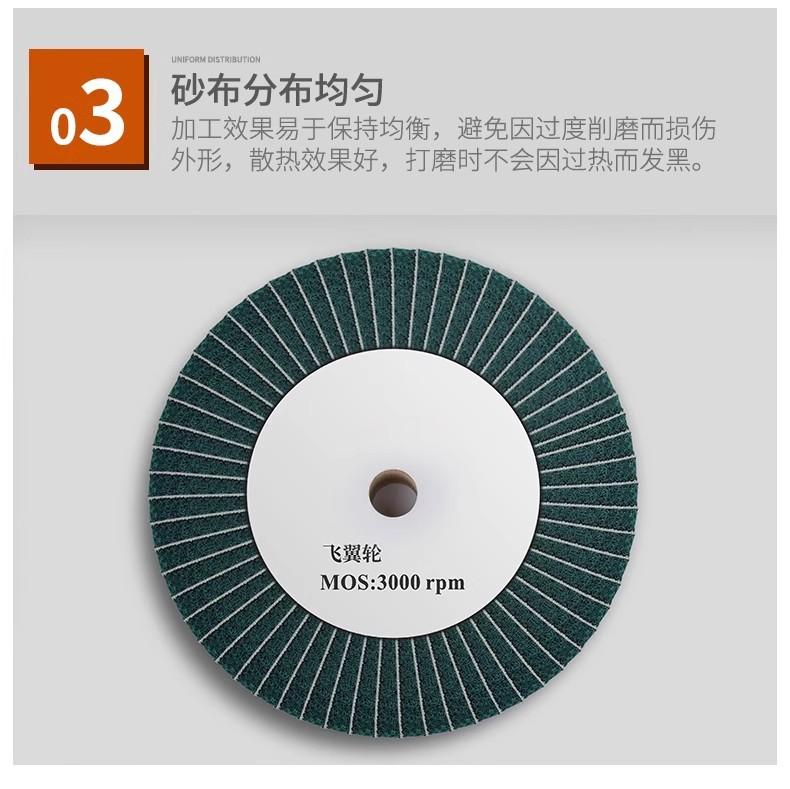 usar:É adequado para tratamento de superfície de formas especiais e tem excelente desempenho em lixamento fino e uniforme, escovação, remoção de riscos finos em peças metálicas e decoração requintada de perfis de alumínio, latão, aço inoxidável e metais macios. Além disso, a superfície da peça de trabalho não ficará preta nem queimará em equipamentos de polimento de alta velocidade. Tem um bom efeito no polimento de alta velocidade, rebarbação e limpeza de superfícies de materiais metálicos.