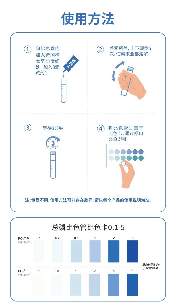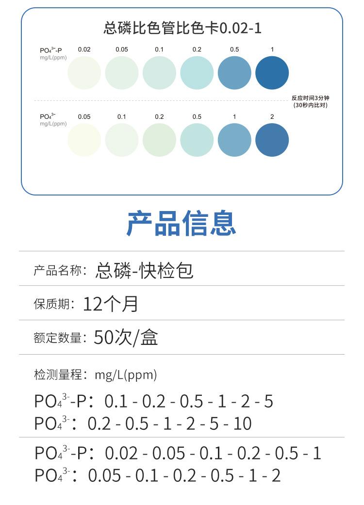 Phosphorus 0.02-0.05-0.1-0.2-0.5-1mg/l 50 times/box, Calculated as phosphate root 0.05-0.1-0.2-0.5-1-2mg/l 50 ...