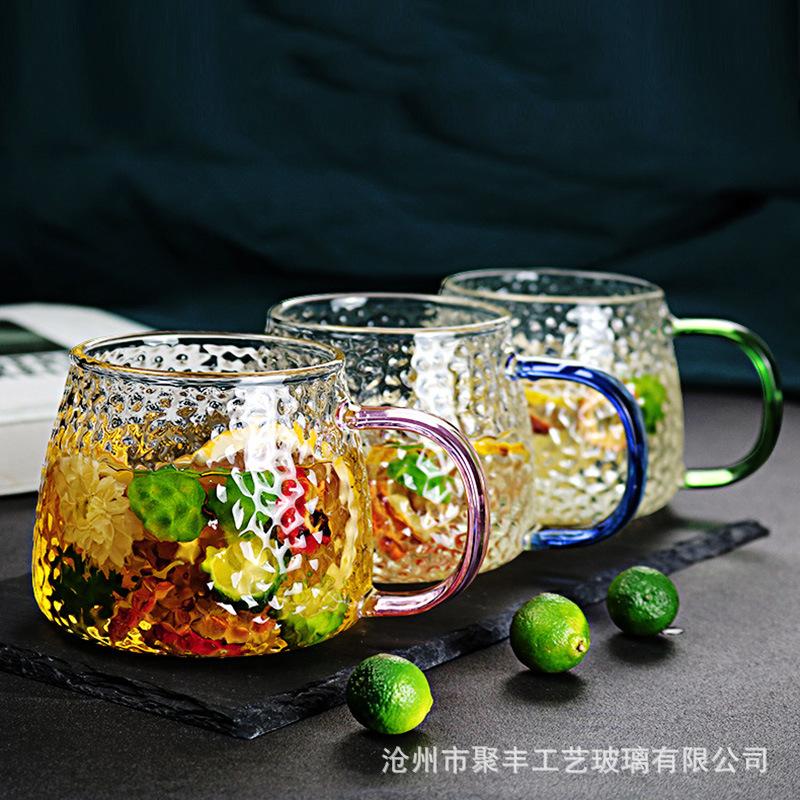 | Copo de água de vidro de borosilicato alto em cinco cores, copo de chá de flores doméstico, copo de café da manhã resistente a altas temperaturas, copo de vidro com padrão de martelo¥7,5Compre agora |