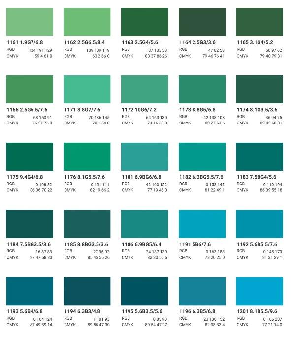Standard green, White, Yellow, Off-white, Dark green, Emerald green, Khaki, Light gray, Medium gray, Lake blue...