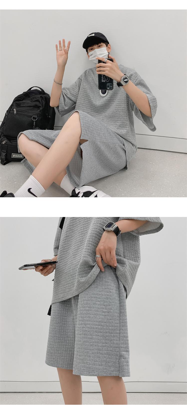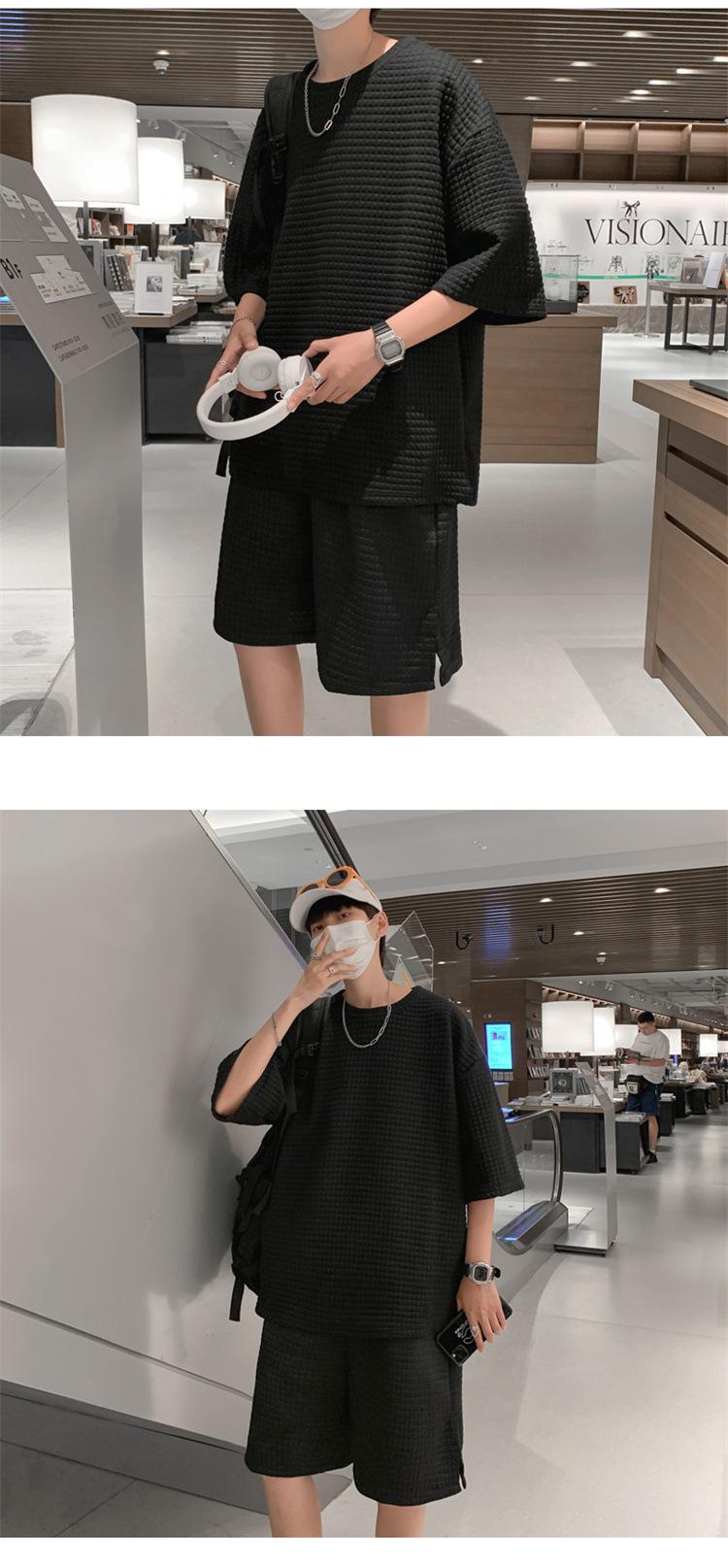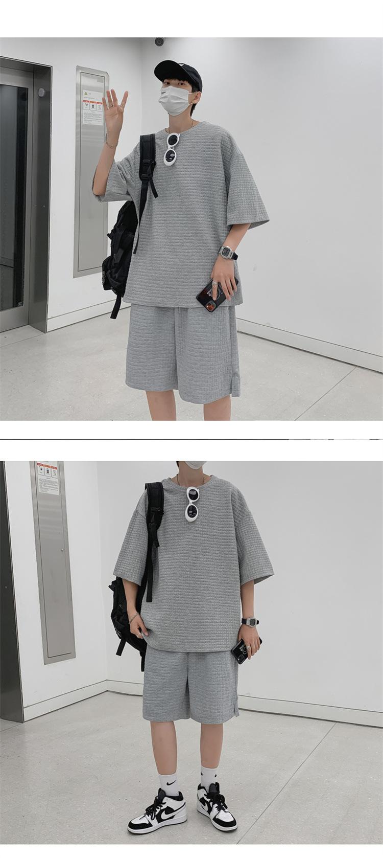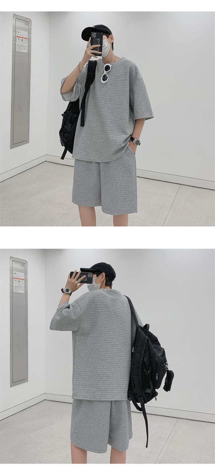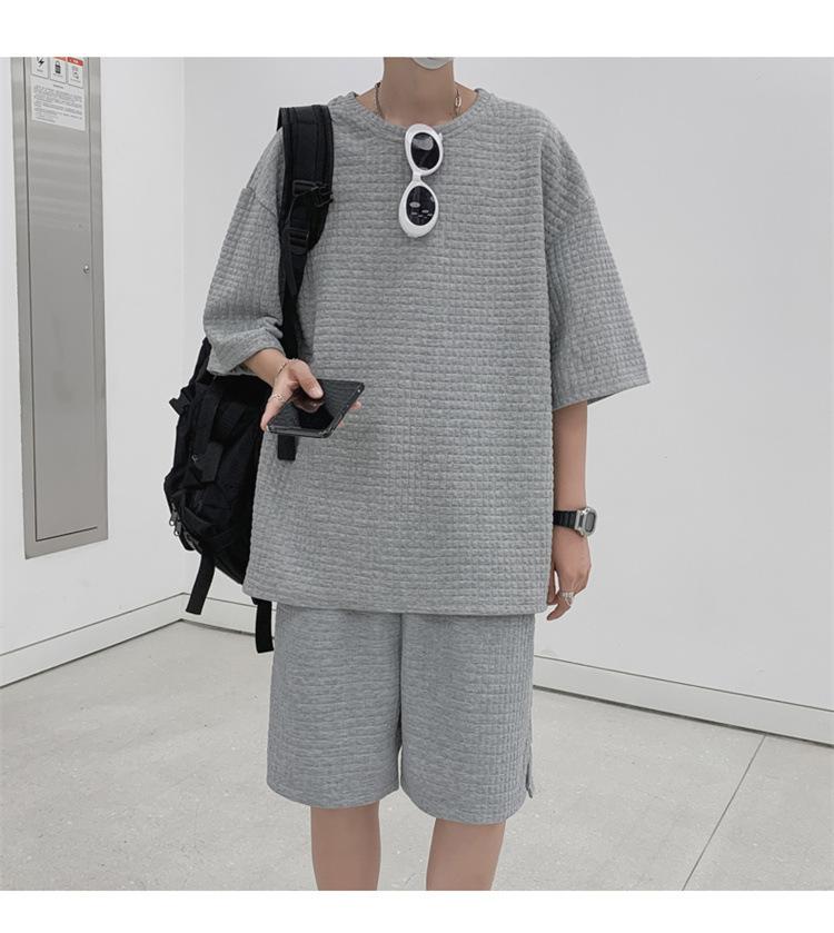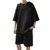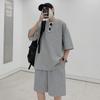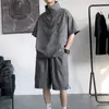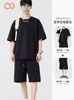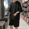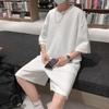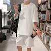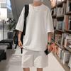 Terno masculino de verão Marca de moda coreana solta 2024 casual cor sólida gola redonda manga curta shorts de perna larga conjunto de duas peças