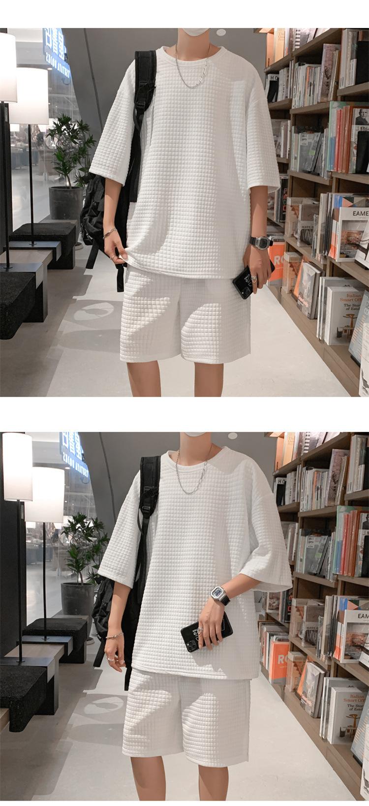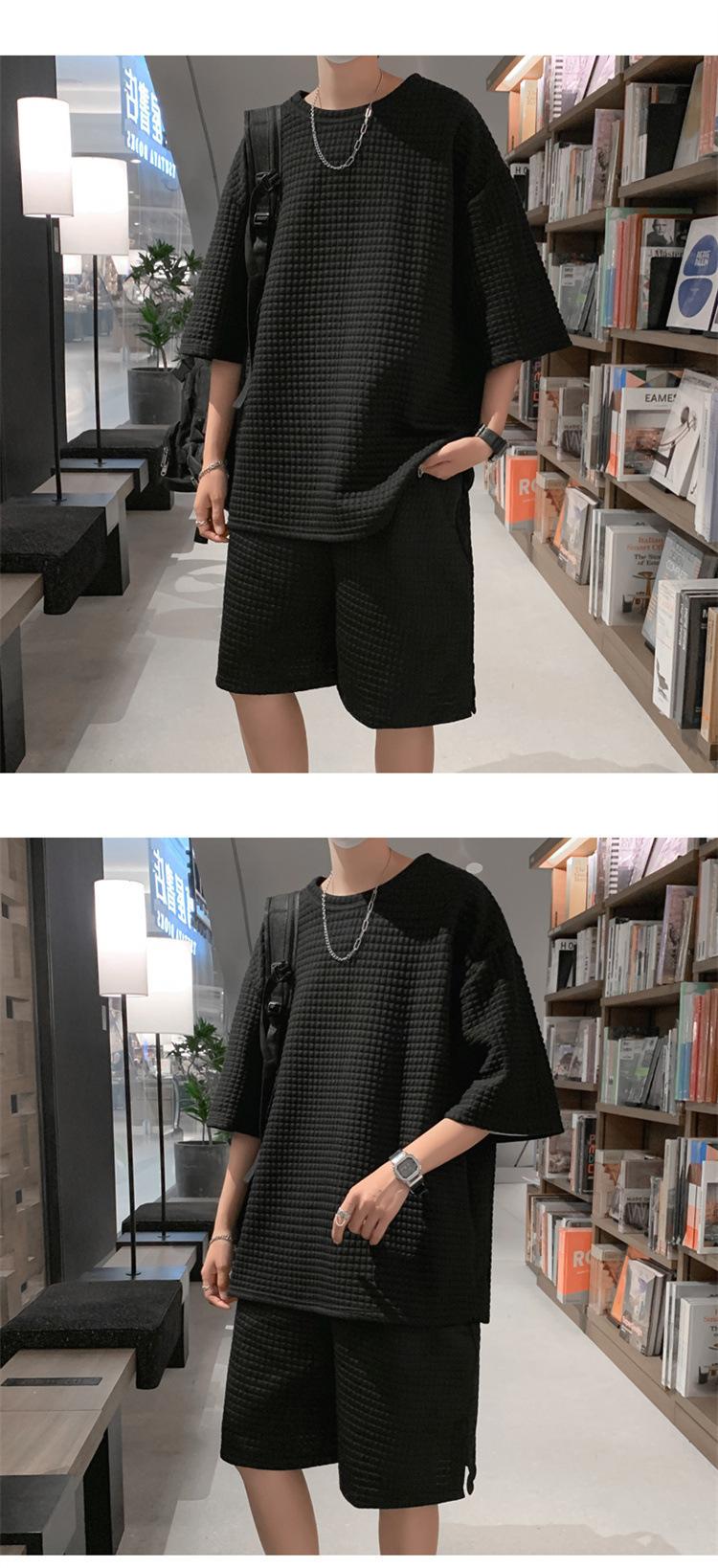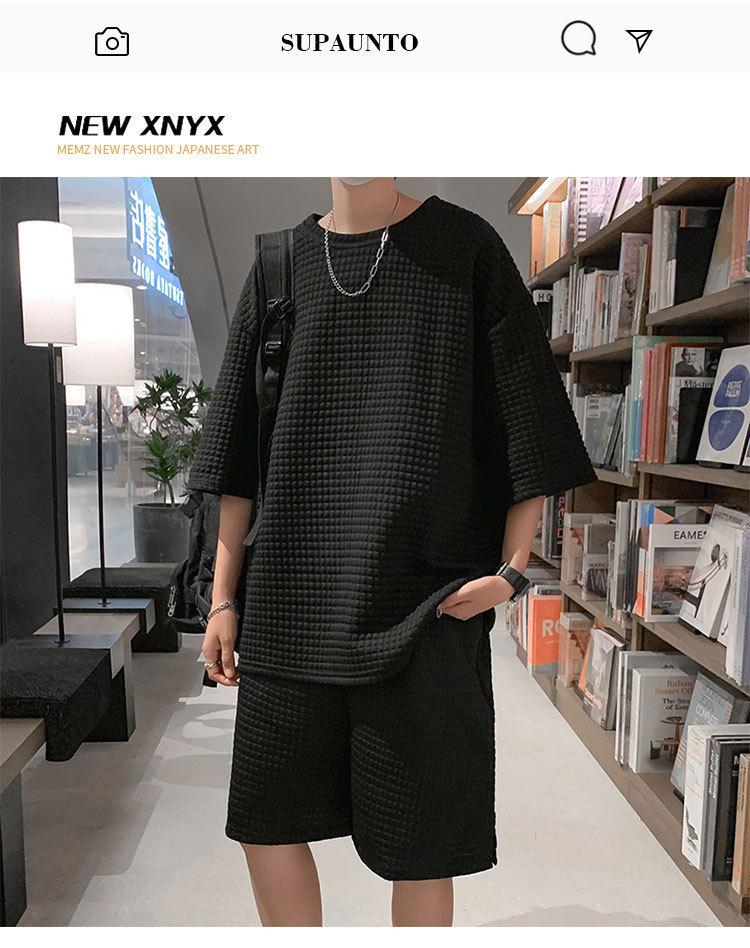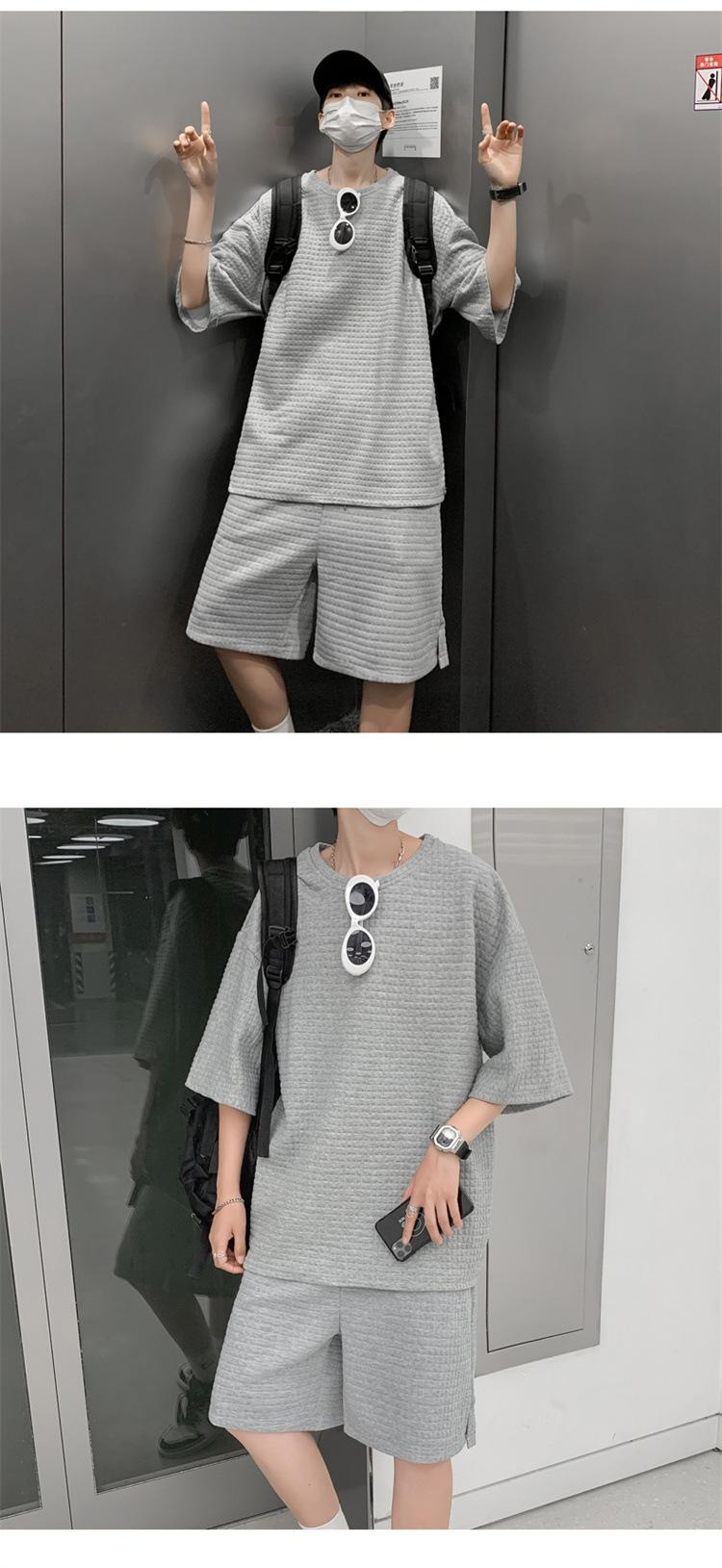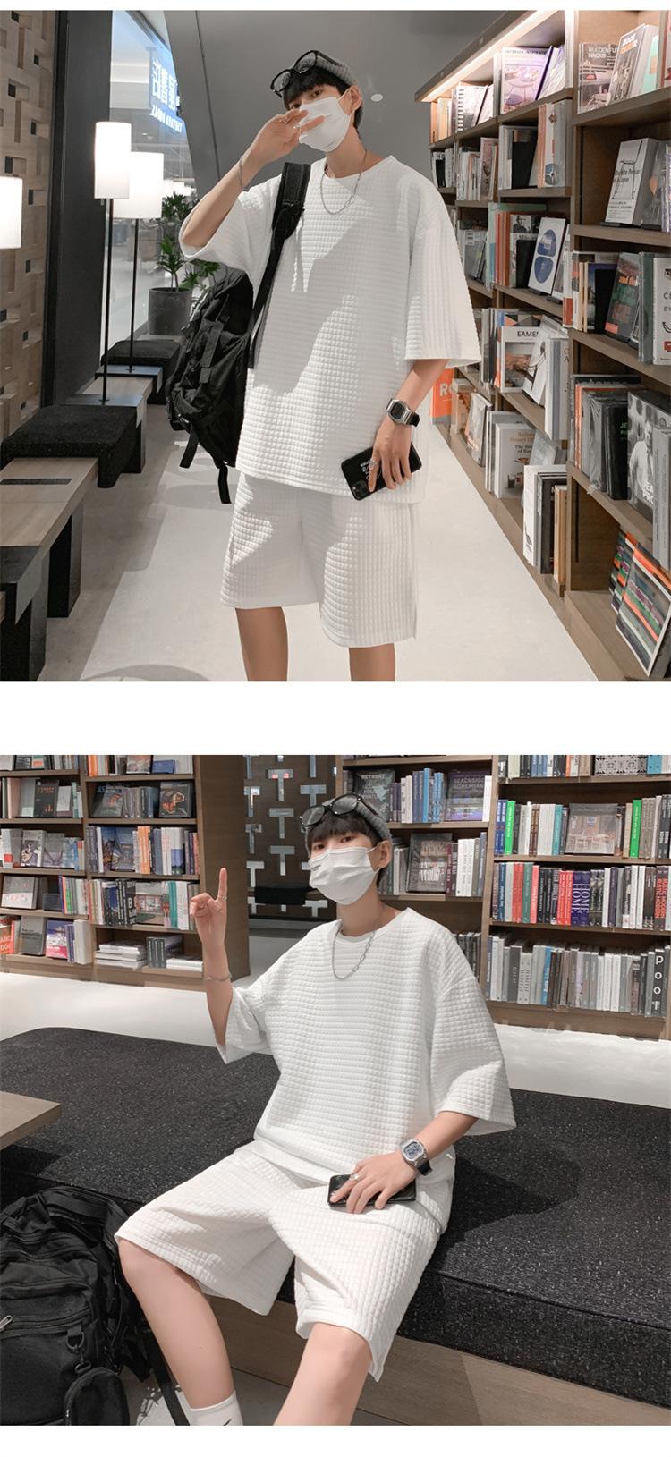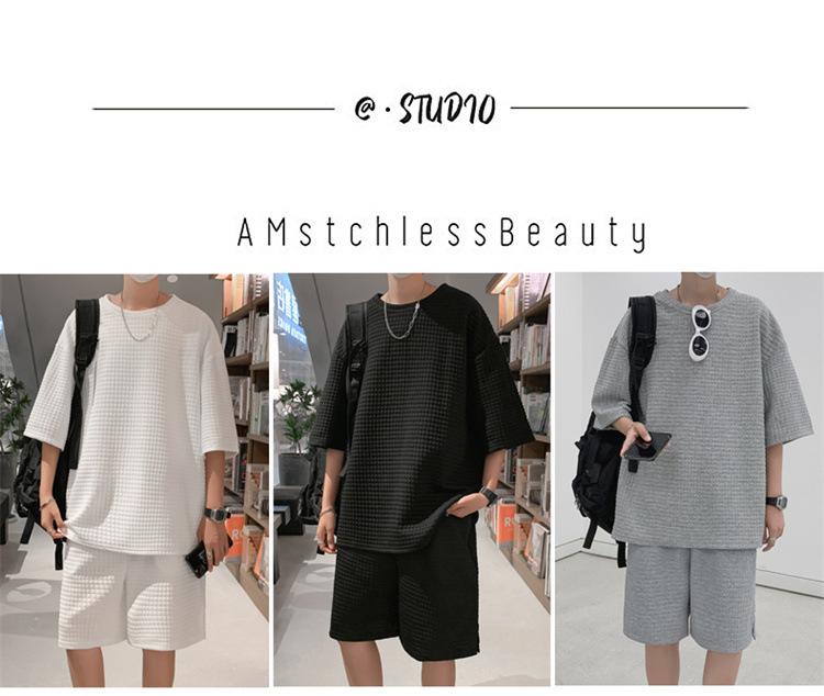 Terno masculino de verão Marca de moda coreana solta 2024 casual cor sólida gola redonda manga curta shorts de perna larga conjunto de duas peças
