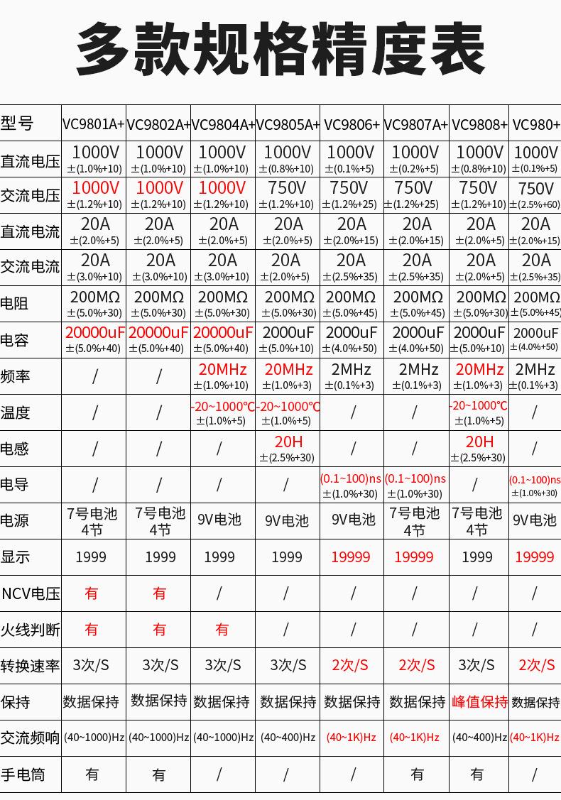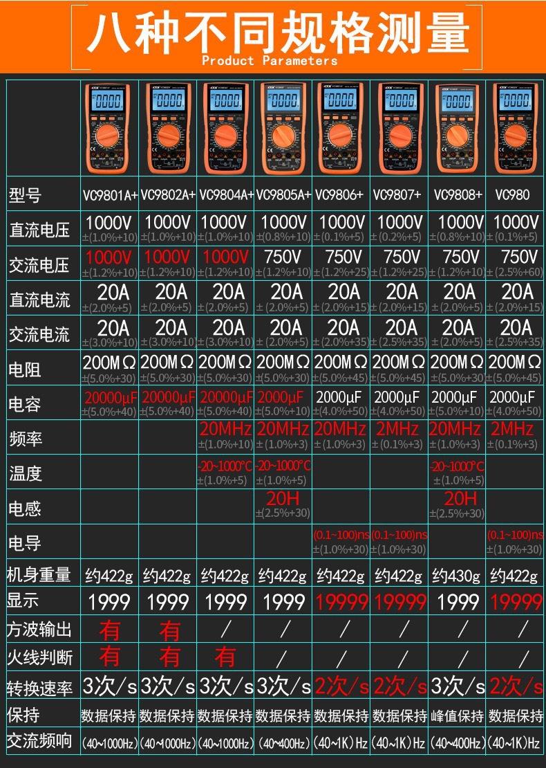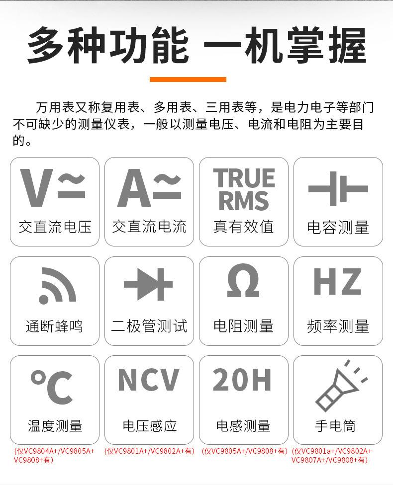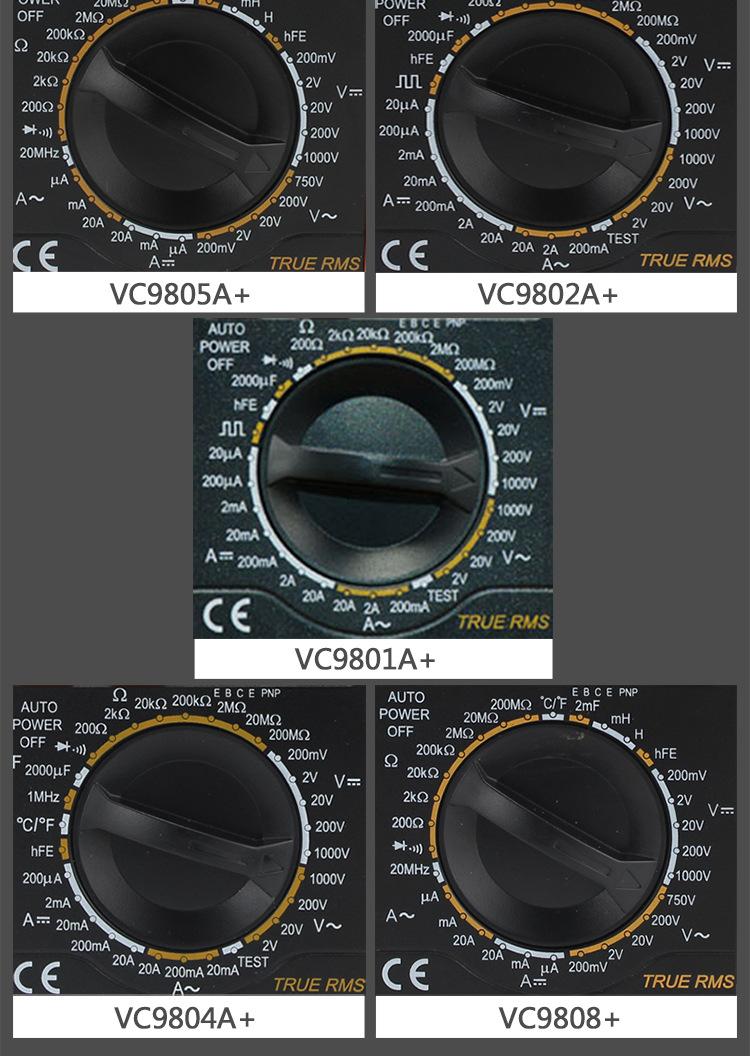 Vc9801a+ (basic type), Vc9802a+ (live line judgment), Vc9803a+ (led test), Vc9804a+ (temperature test), Vc9805...