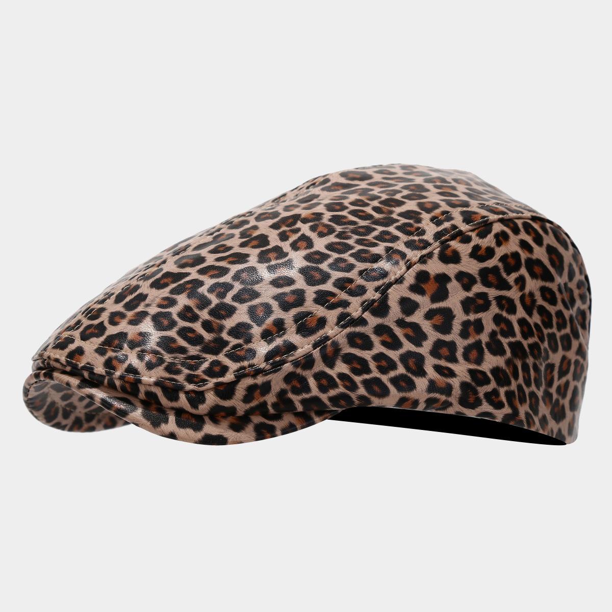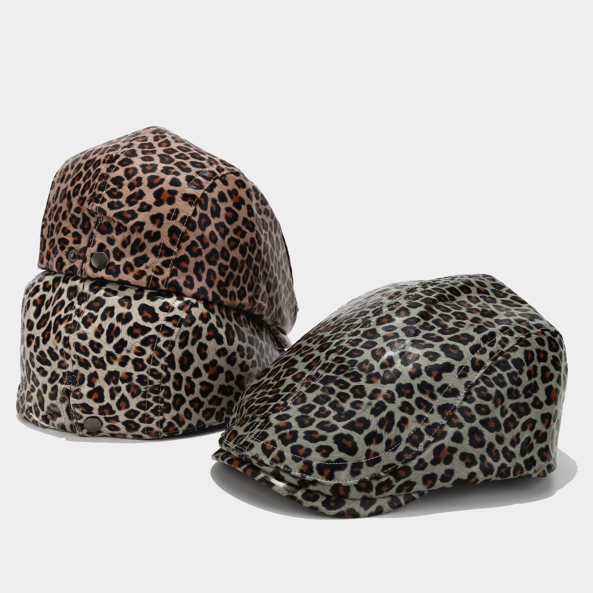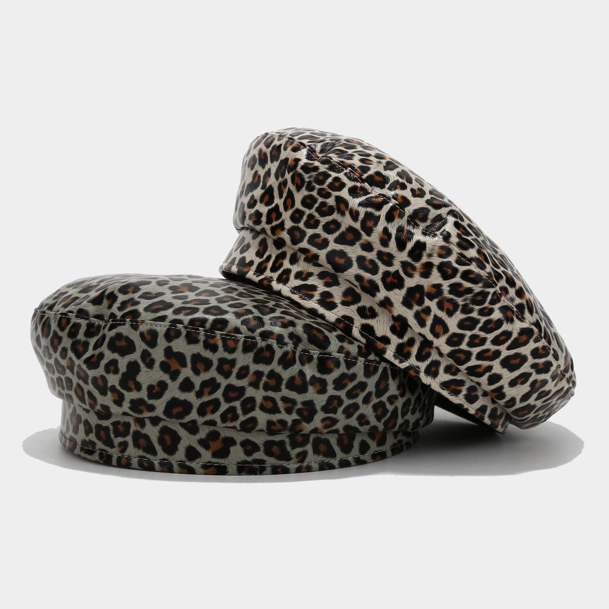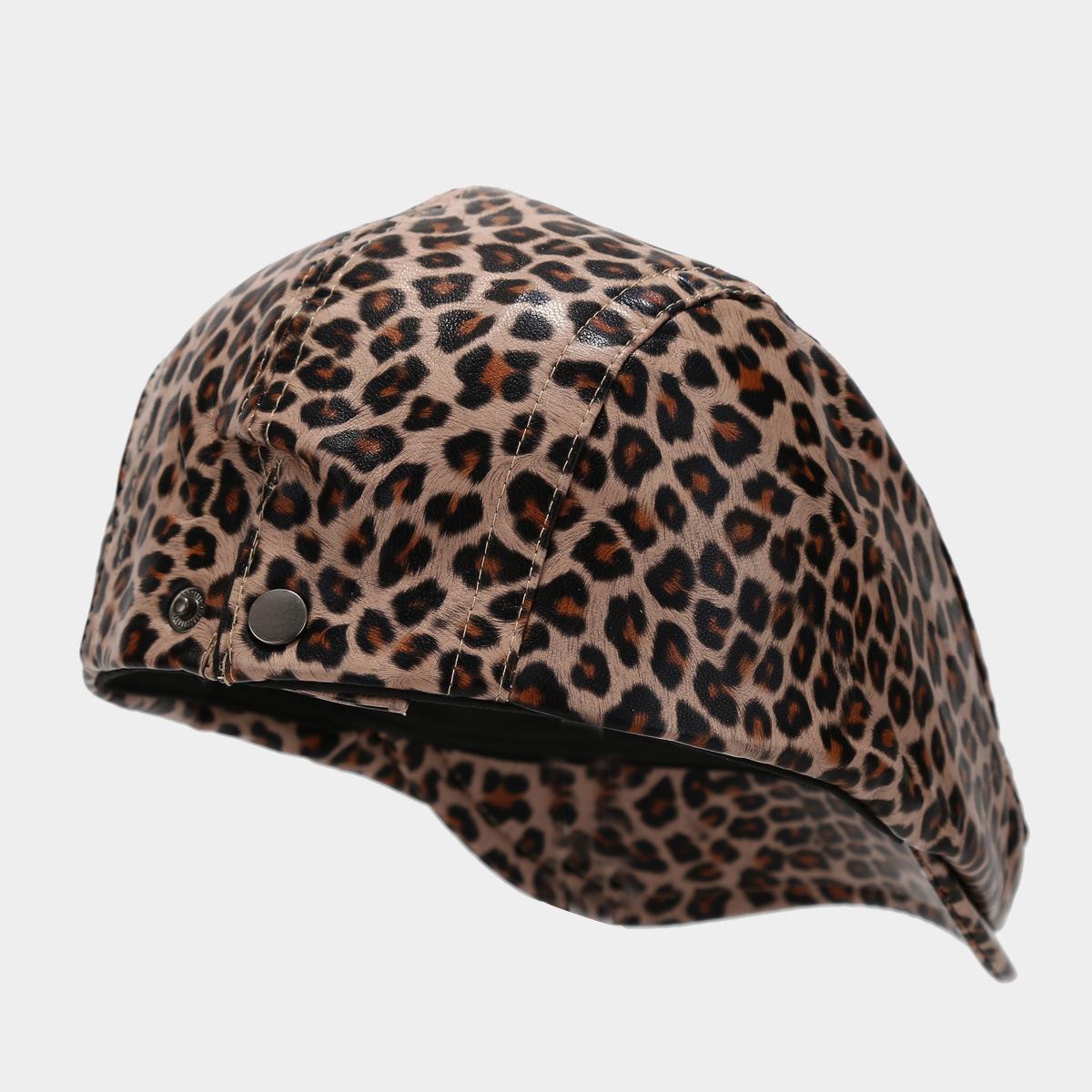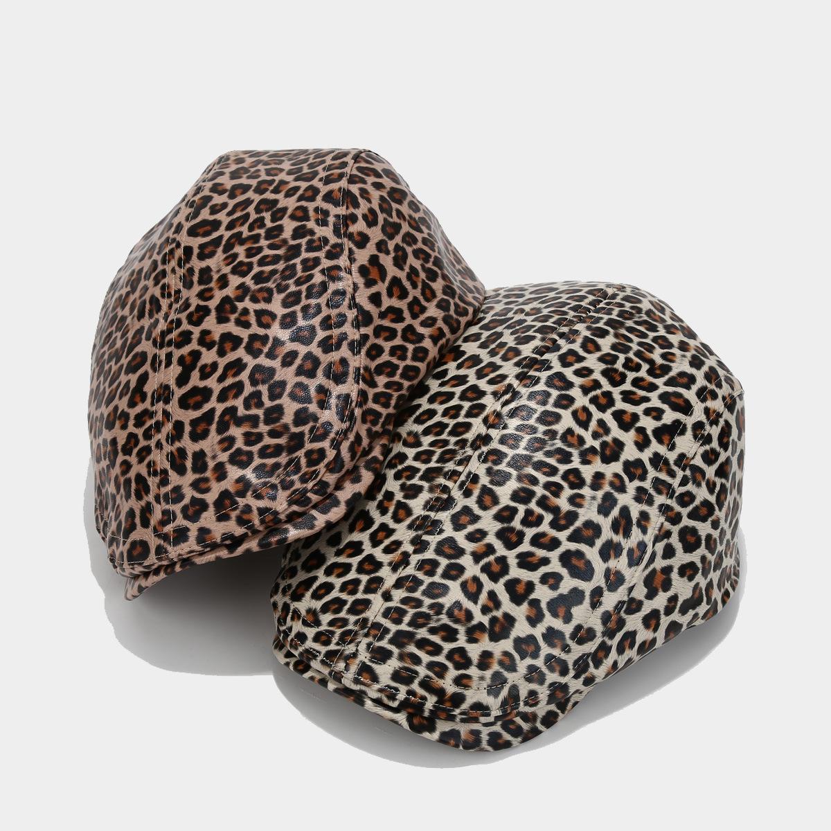 Boné progressivo de PU com estampa de leopardo da moda europeia e americana, personalidade feminina, moda retrô, boina, outono e inverno, chapéu de pintor de rua, maré