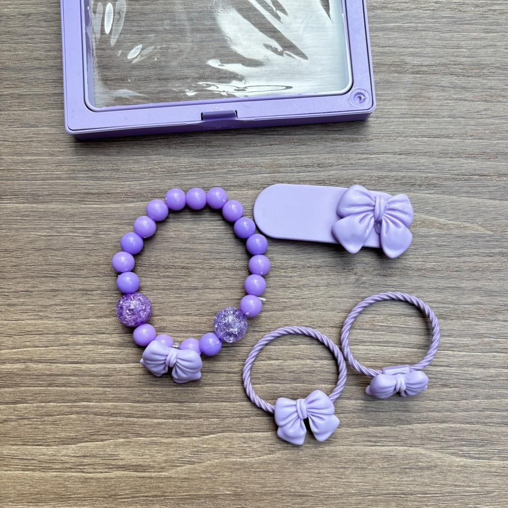 Ele contém uma pulseira, um grampo de cabelo e um par de elásticos de cabelo.