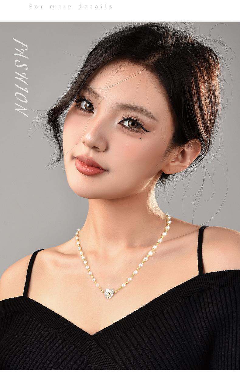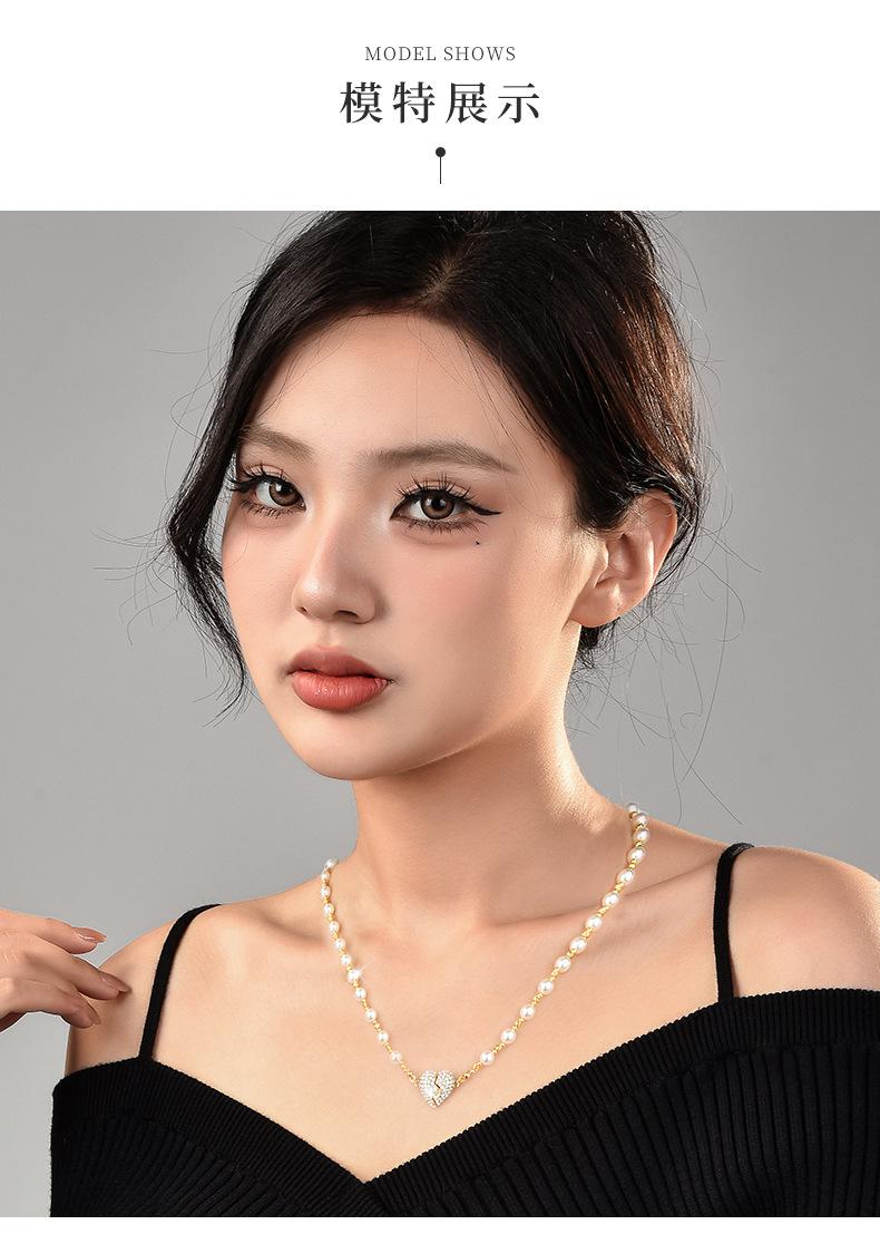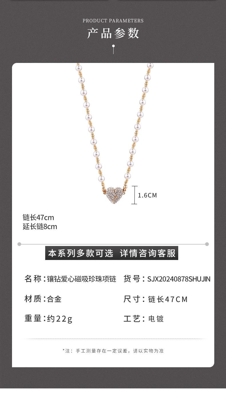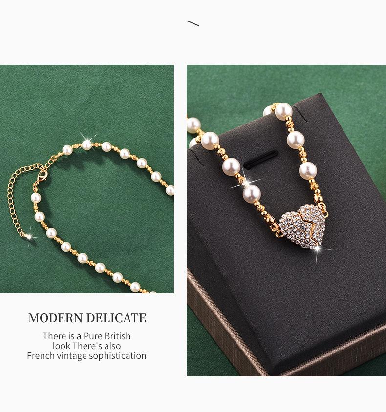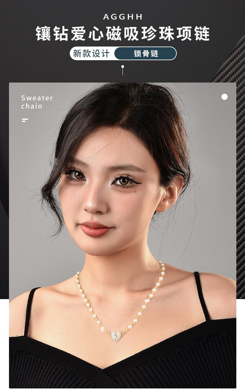Colar de pérolas com pingente magnético em forma de coração, incrustado de diamantes de alta qualidade, design de nicho de luxo leve, temperamento versátil, corrente de clavícula