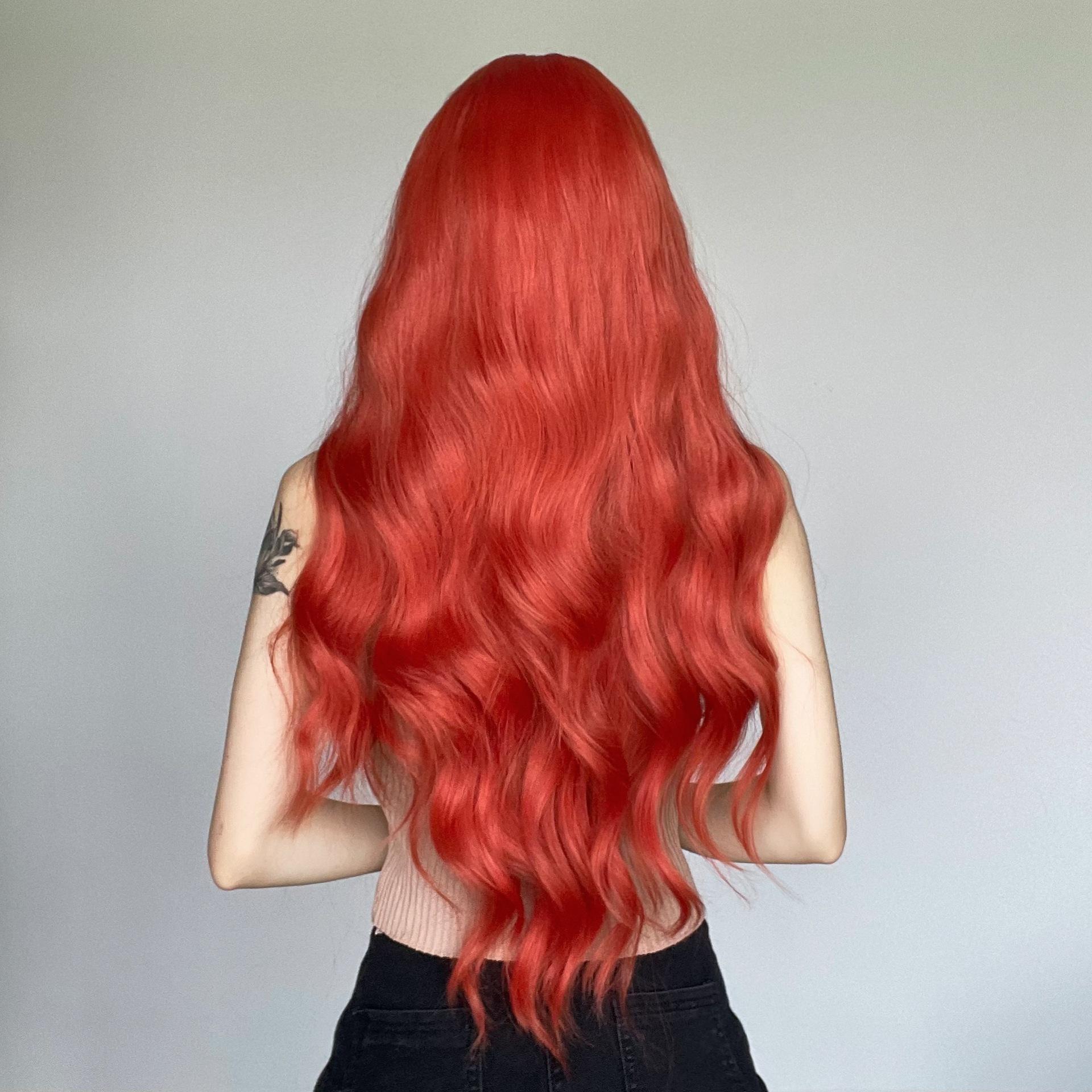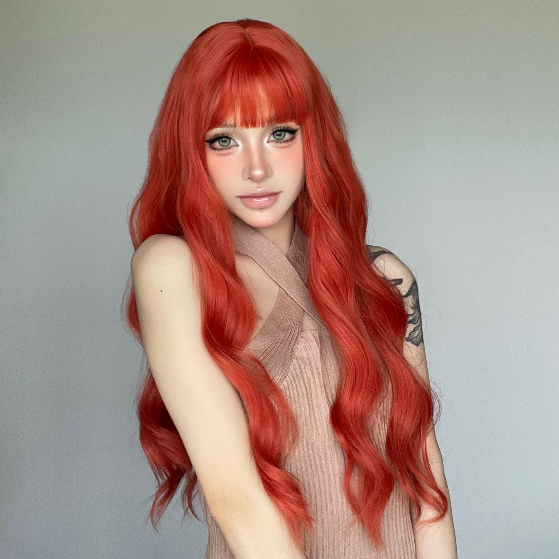 Peruca feminina completa headgear net vermelho sujo laranja qi franja cabelo longo grande onda cabelo cacheado fábrica direta peruca