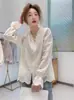 Camisa Branca Feminina de Manga Longa em Cetim com Decote V para Primavera e Outono, Design Francês Nicho, Top Profissional para o Dia a Dia