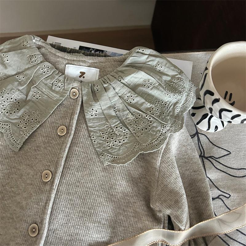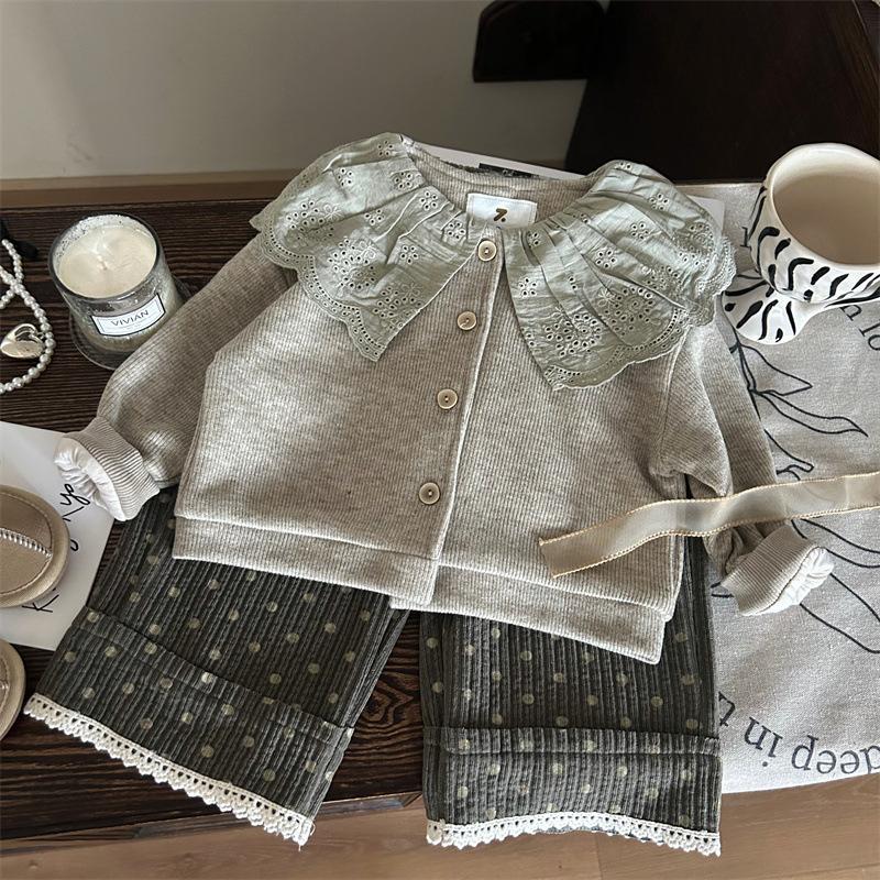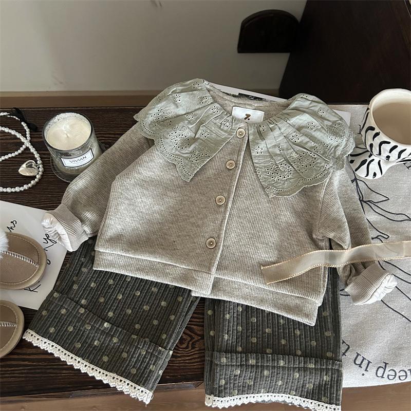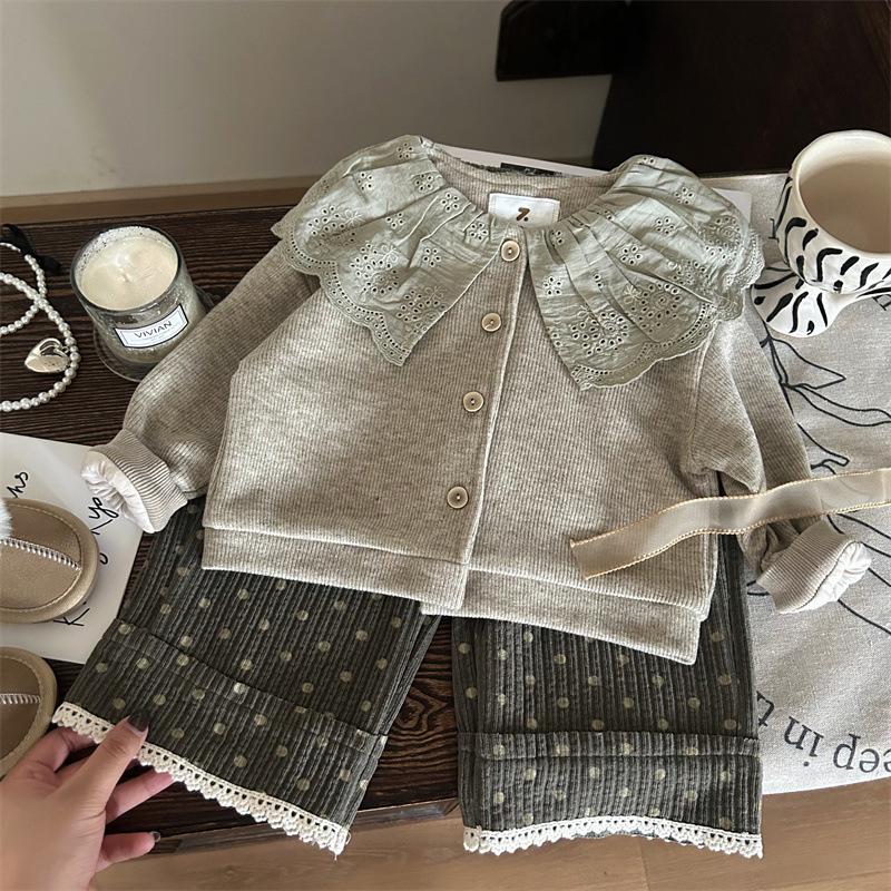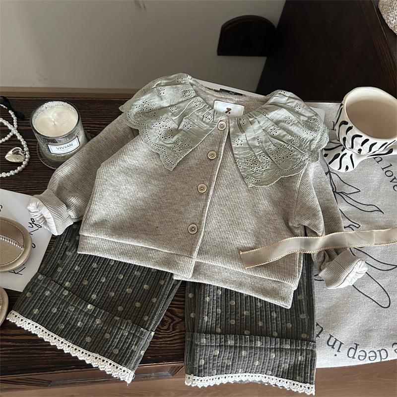 Liquidação não devolve não troca [pedido racional] outono meninas gola de renda cardigã tricotado chenille calças de bolinhas
