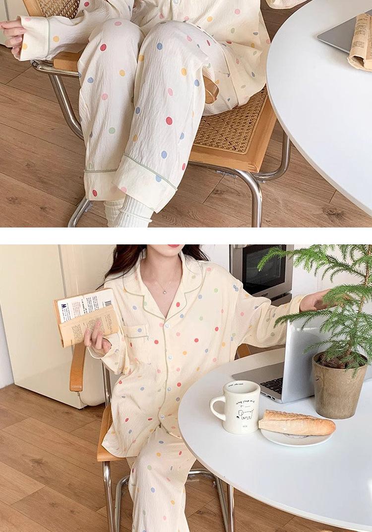 Compre Coreano ins cor pijama de ponto de onda pequena outono das mulheres terno de manga comprida pequeno fresco roupas de casa terno solto atacado no atacado no Joom.pro