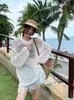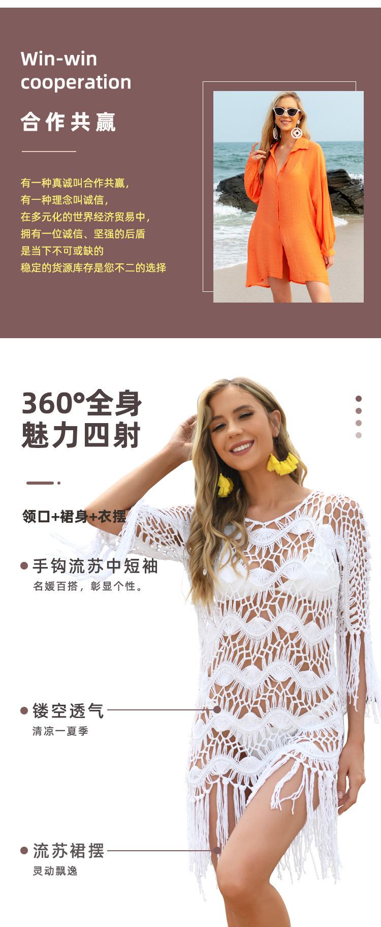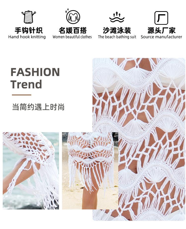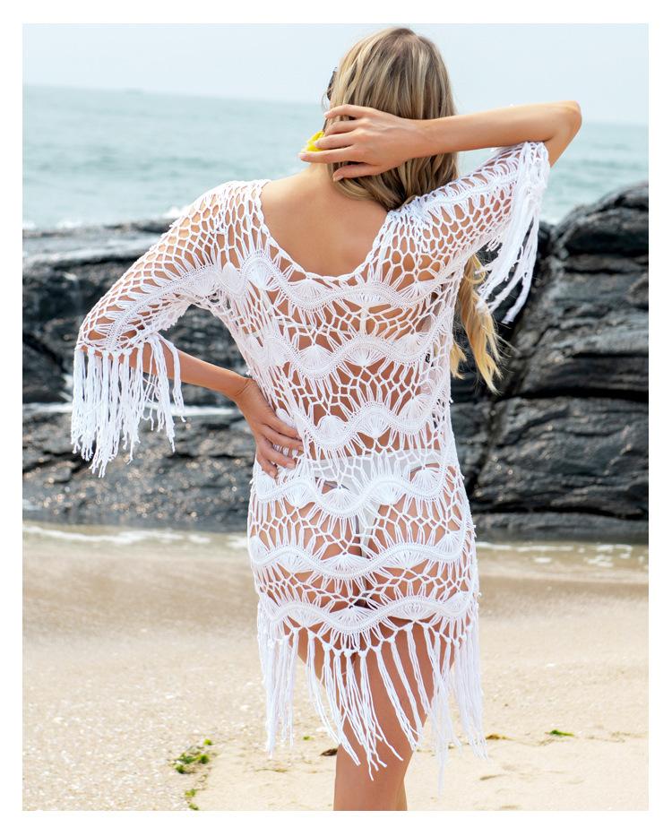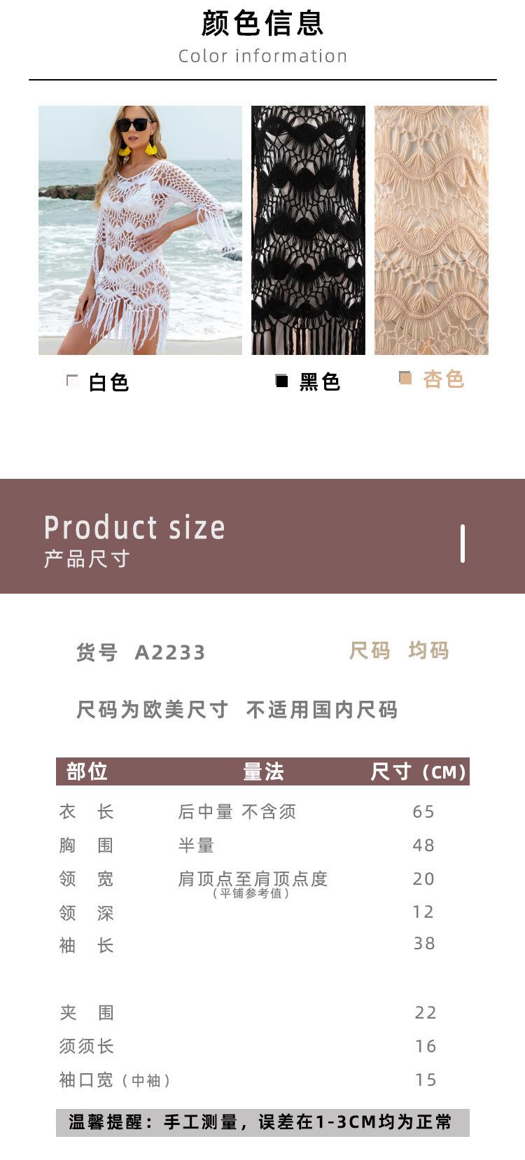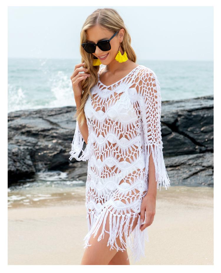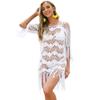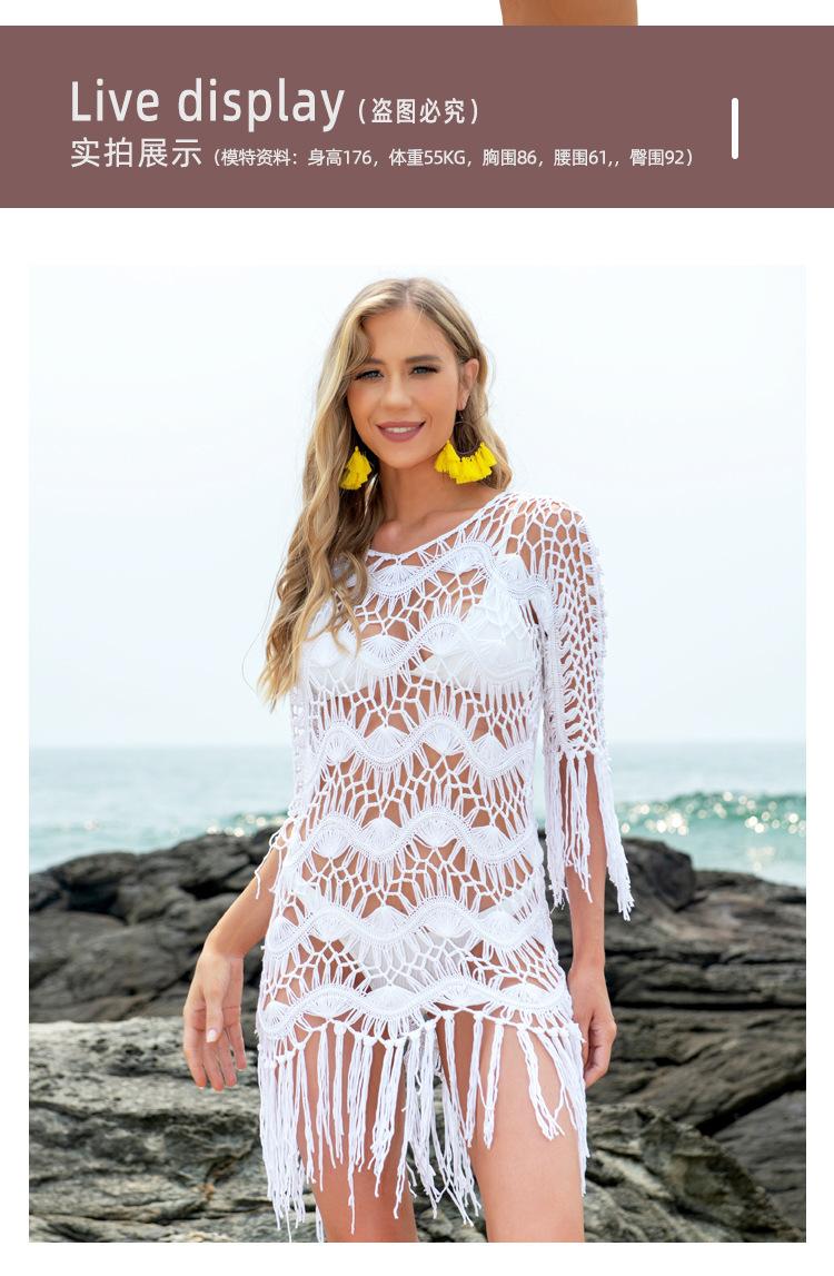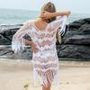 Blusa de protetor solar de borla de cor sólida europeia e americana estrela à beira-mar vestido de praia de água oca maiô de malha externa tecida para mulheres