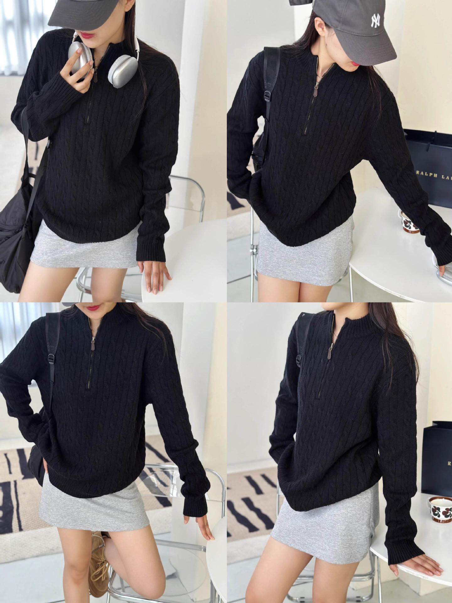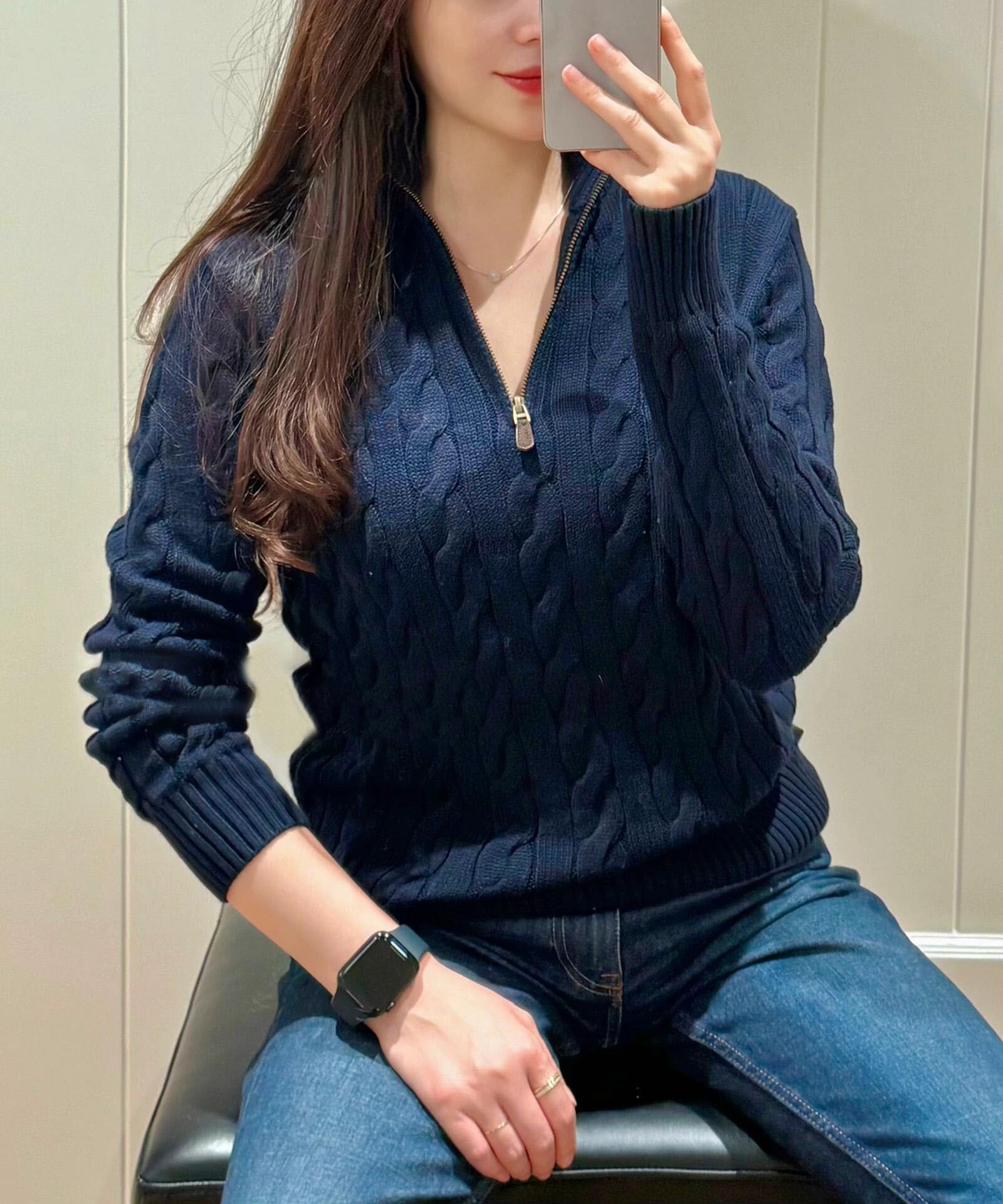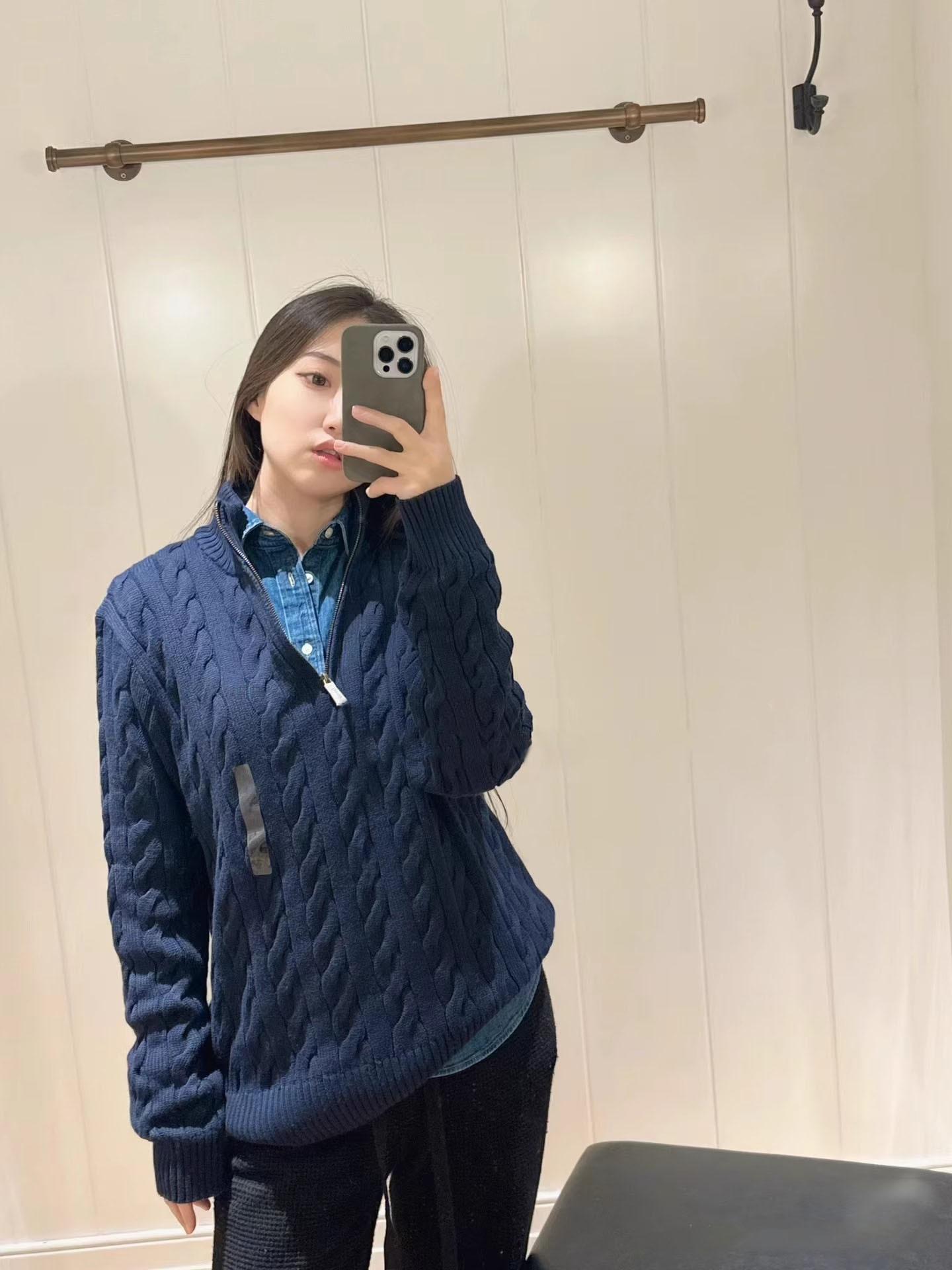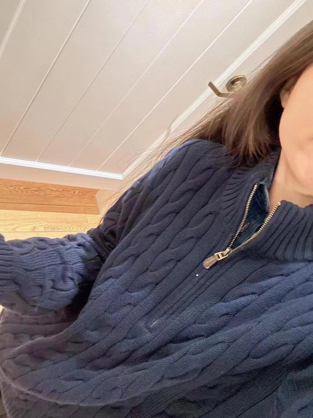 Tamanho de varredura RL Ruff Pony bordado malhas masculinas outono e inverno gola vertical torção meio zíper suéter feminino quente