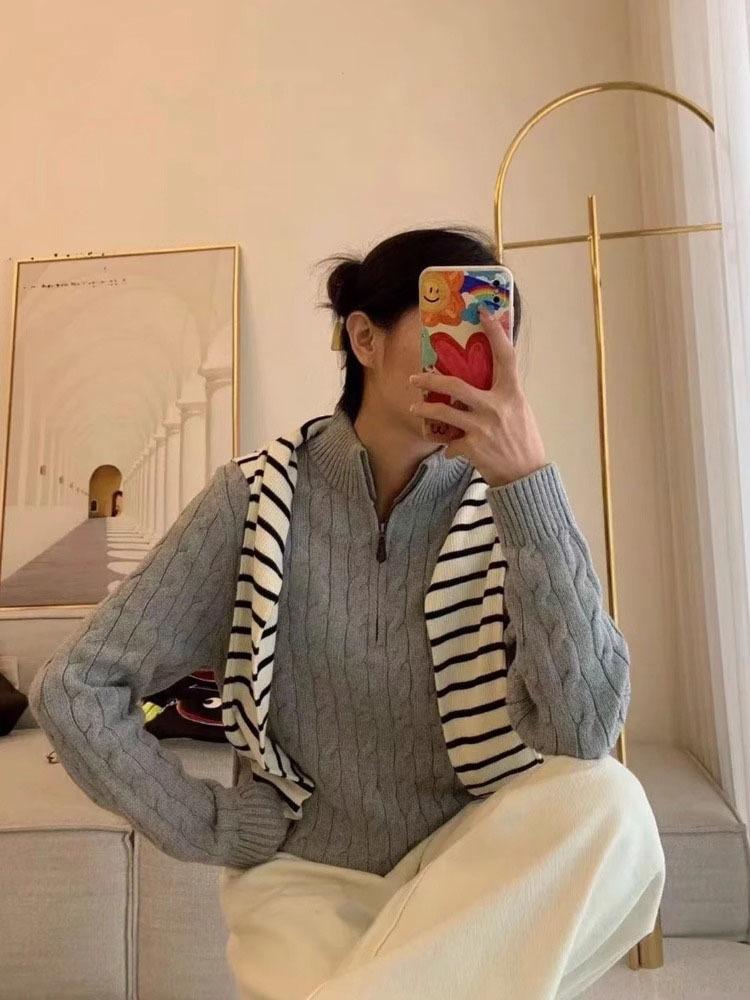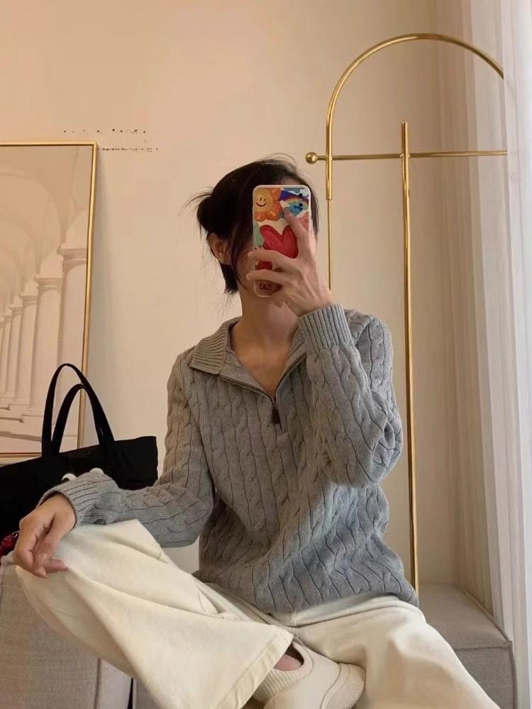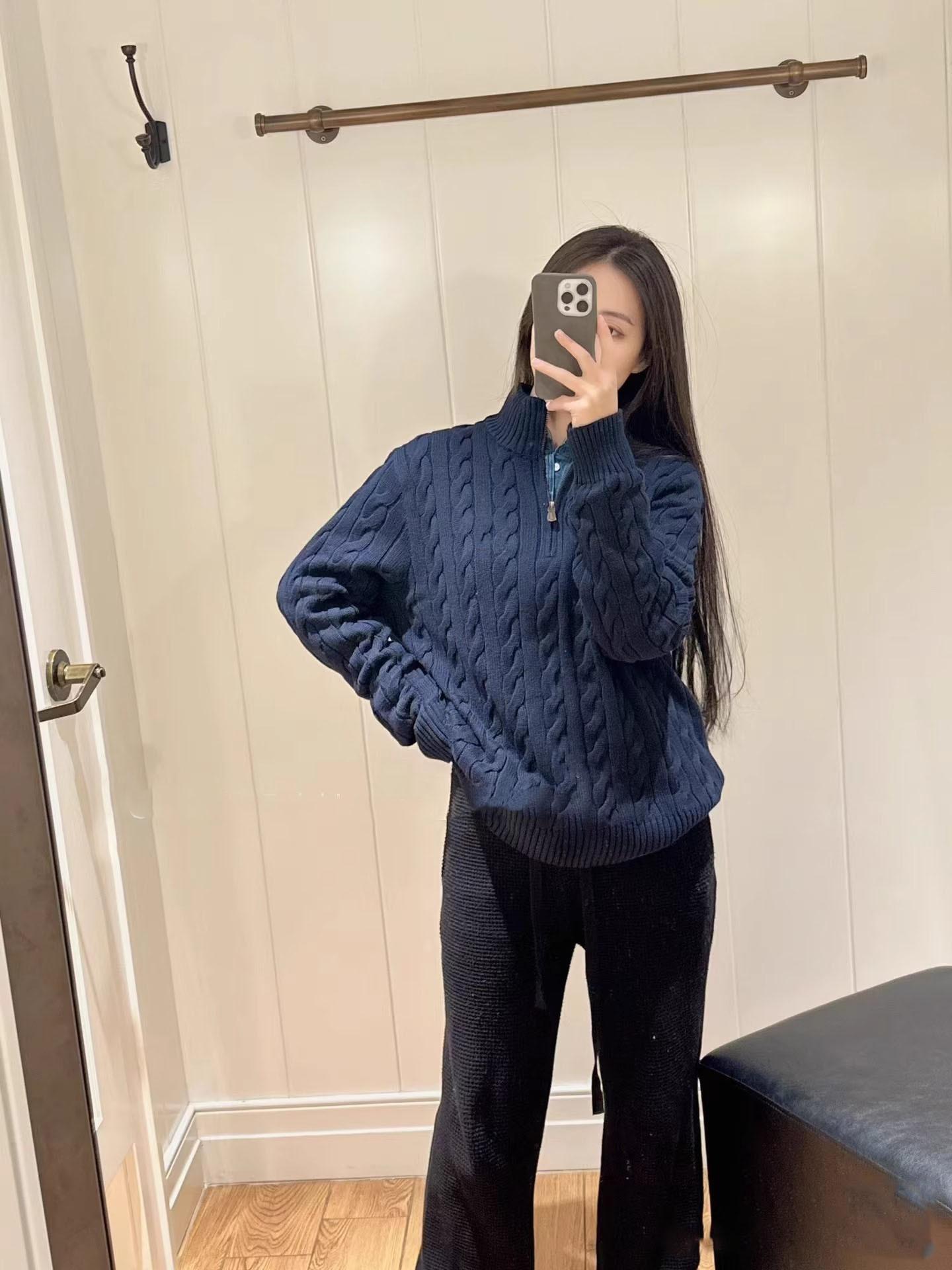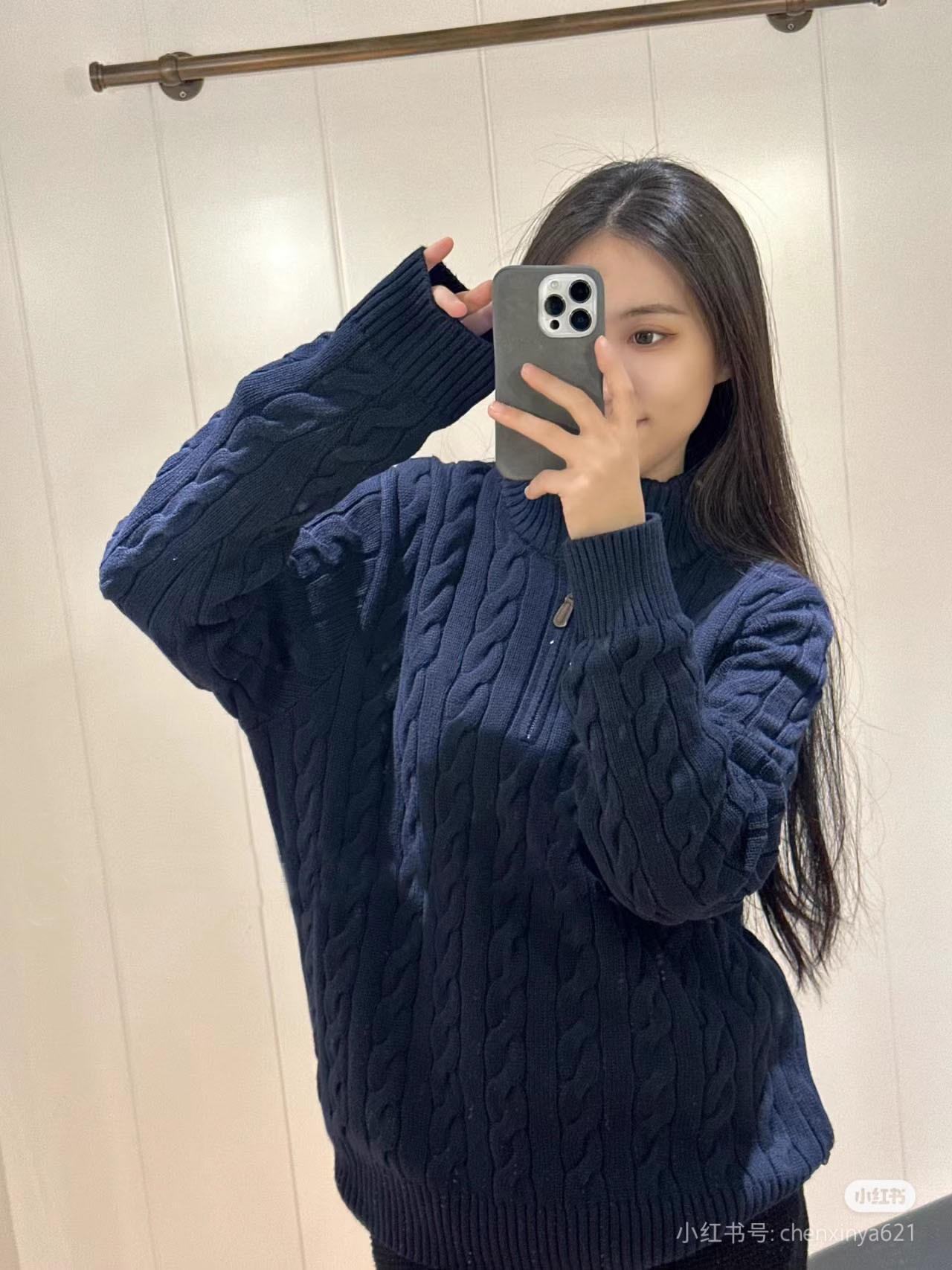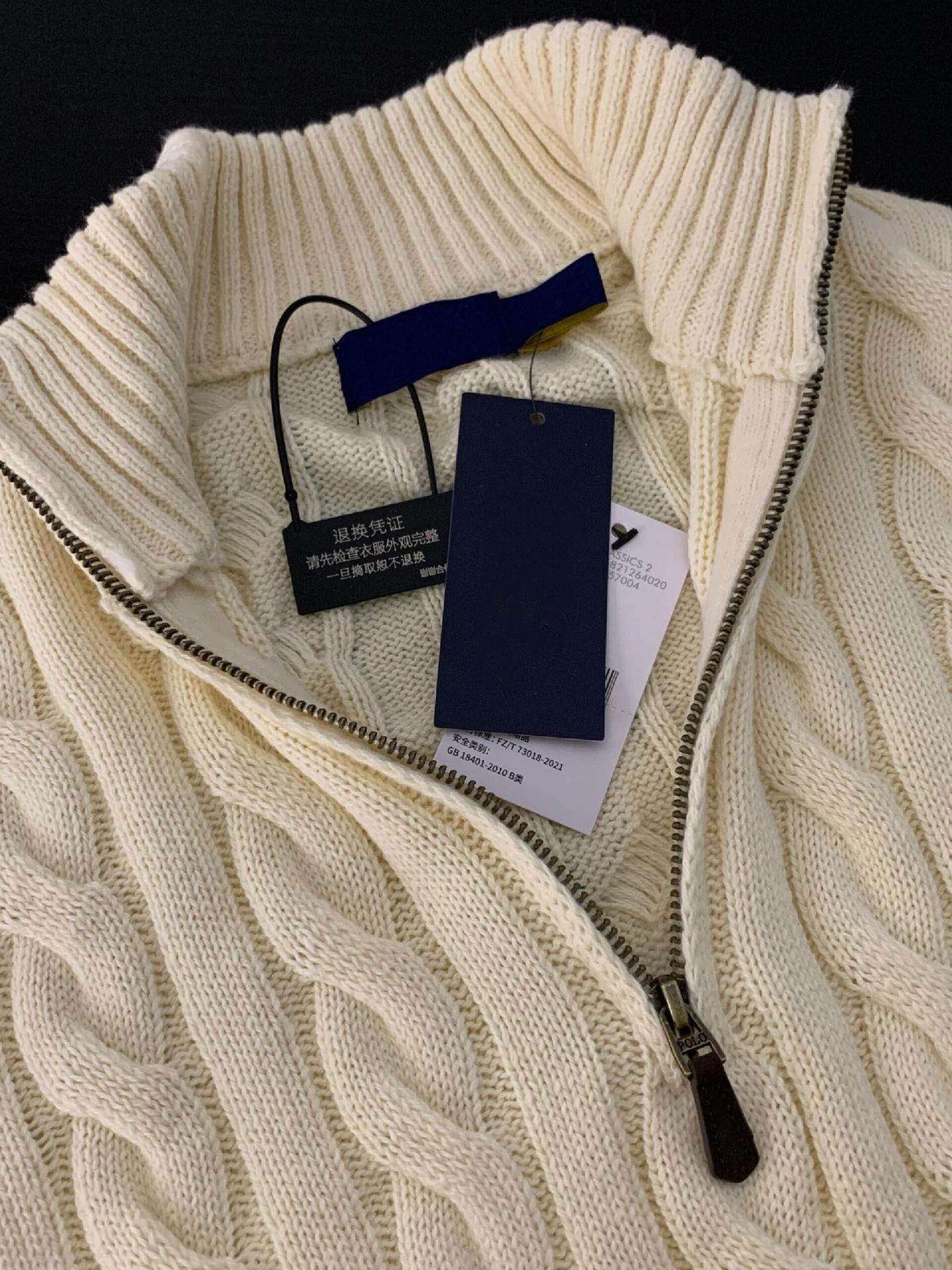 Tamanho de varredura RL Ruff Pony bordado malhas masculinas outono e inverno gola vertical torção meio zíper suéter feminino quente