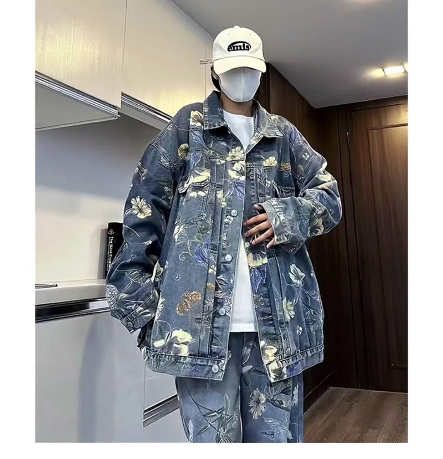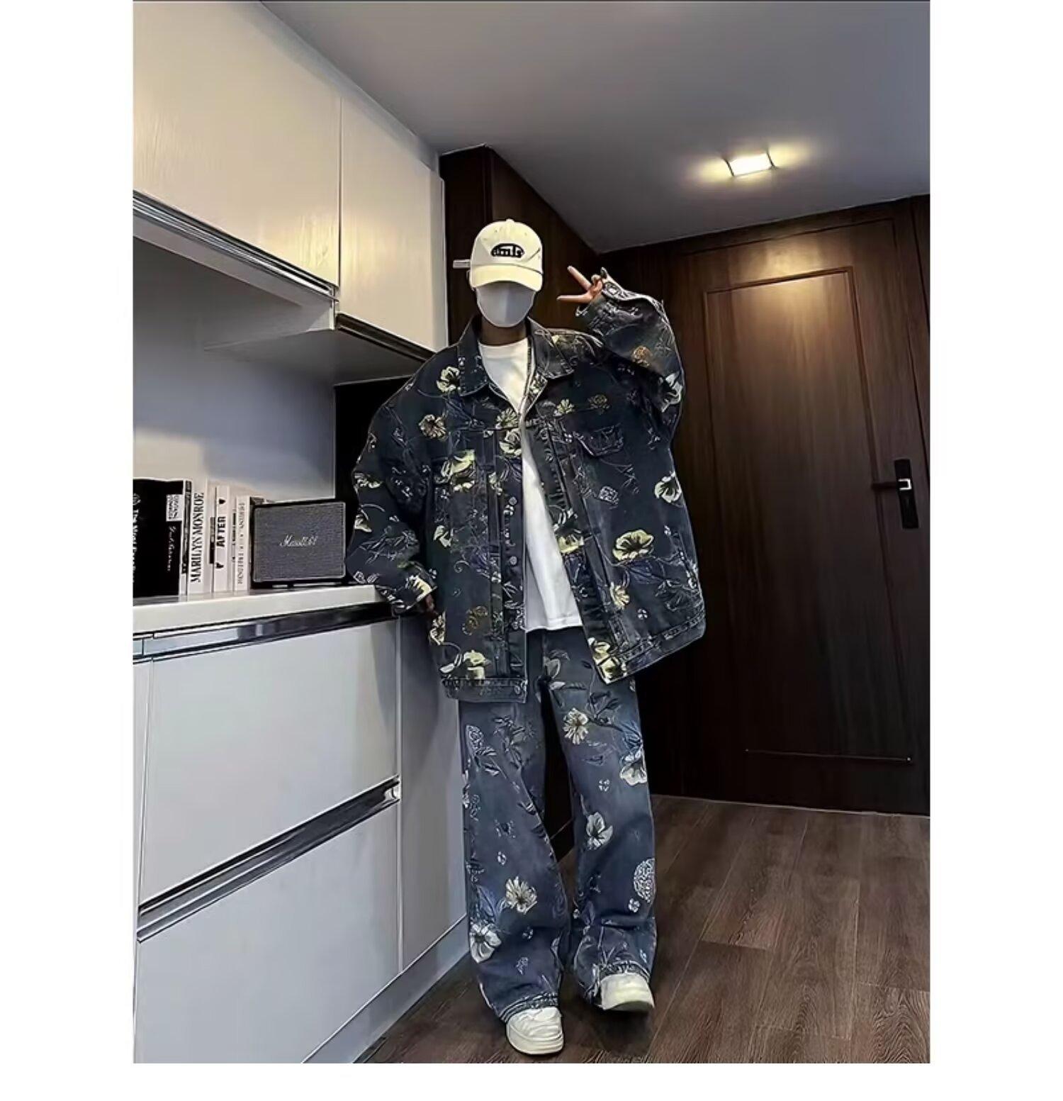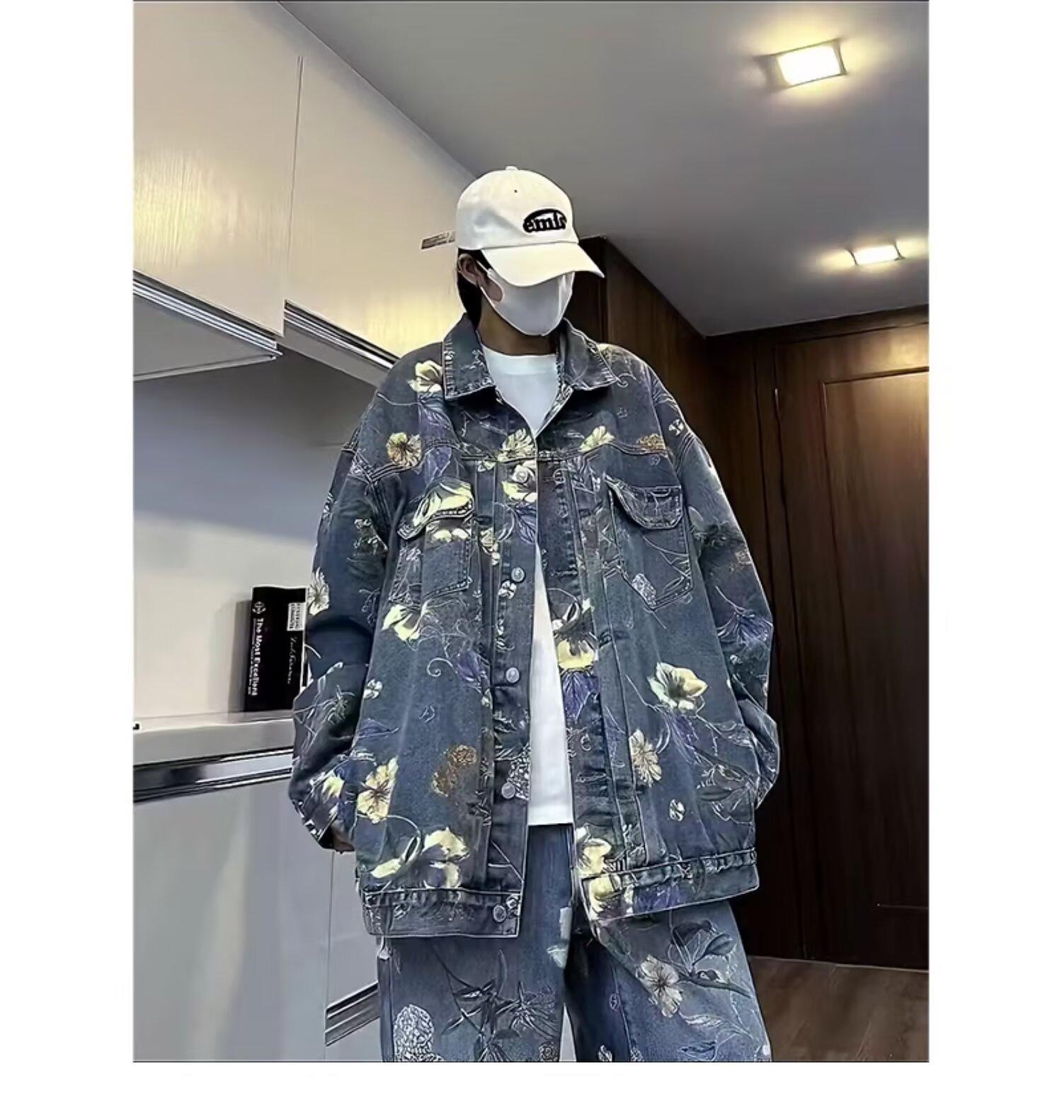 Compre Jaqueta jeans estampada completa masculina primavera e outono casual solta jaqueta jeans na moda para adolescentes no atacado no Joom.pro