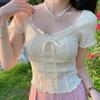 Camisa de chiffon com babados e decote em V de cor pura com manga de sino para mulheres 2022 verão novo solto tamanho grande manga curta top fino