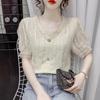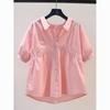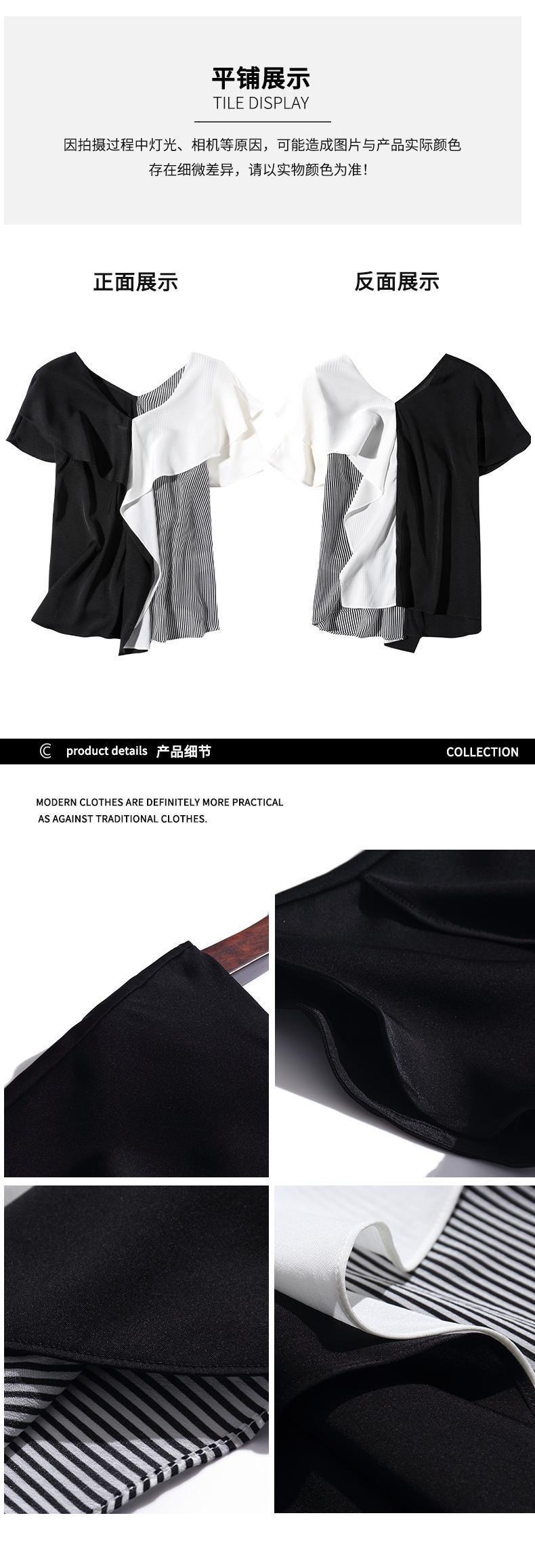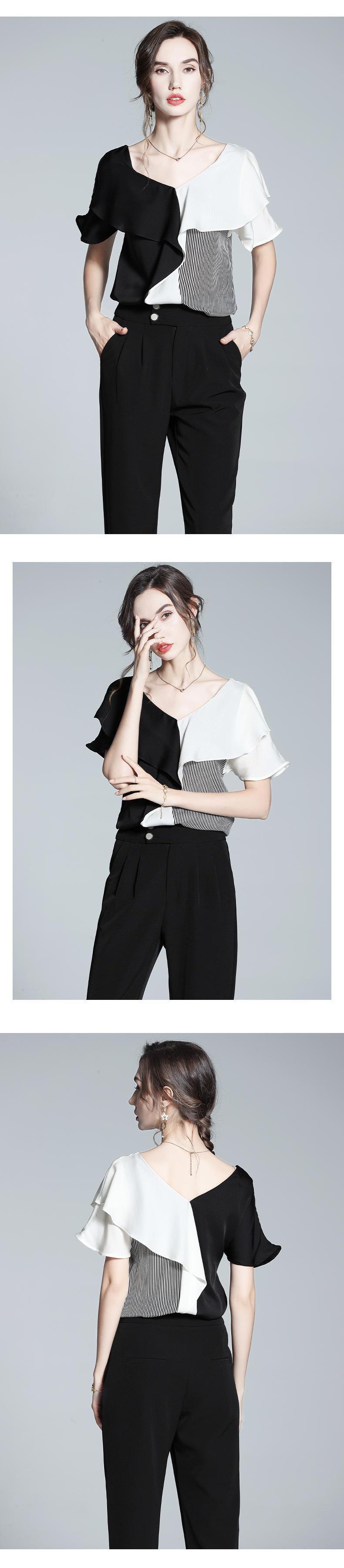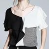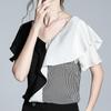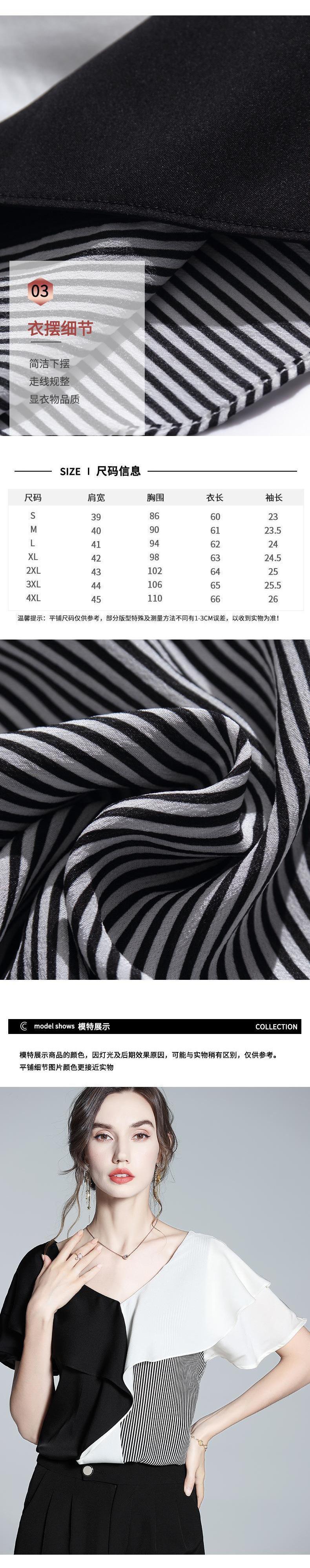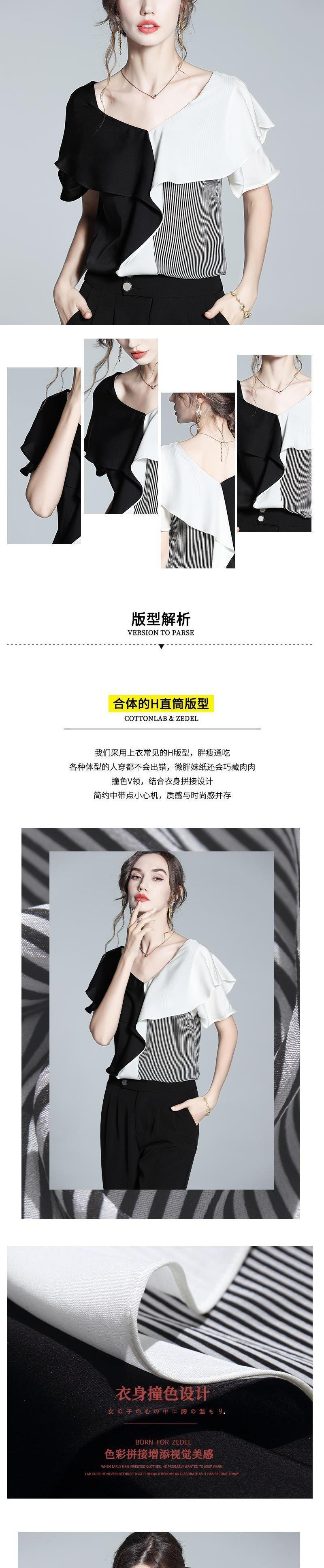Blusas de Chiffon para Mulheres 2024 Verão Novo Design Costura Babados Manga Curta Contrastante Francesa Redutora de Idade