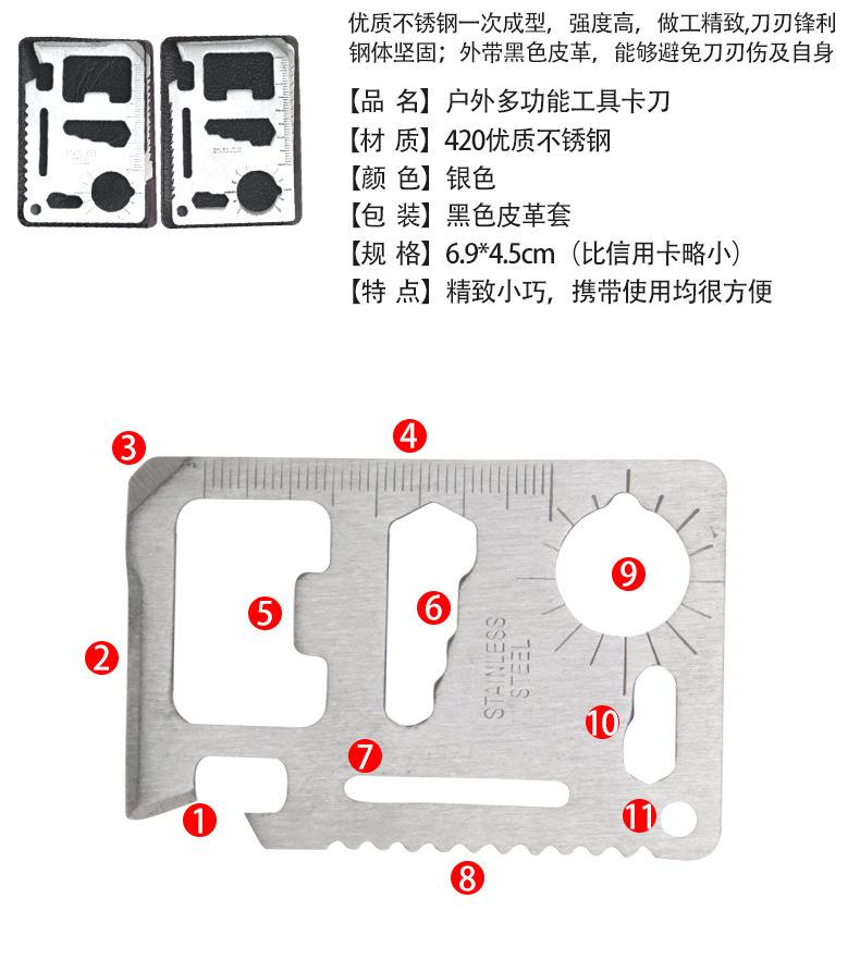 Visão Geral do Produto: Feito inteiramente de aço inoxidável 420 de alta qualidade, com acabamento requintado, tanto a frente quanto o verso são brilhantes e planos. É um produto de exportação, acompanhado de um diagrama para explicação. A lâmina é afiada, o corpo de aço é robusto e as serrilhas no cartão fino são dentes escalonados em fileira dupla. A peça inteira de aço inoxidável de alta dureza é formada em uma única etapa, com alta resistência e uma borda afiada. O tamanho é semelhante ao de um cartão de crédito e vem com um estojo protetor de couro preto para evitar que a lâmina cause ferimentos e pode ser carregado na carteira. Um cartão de sobrevivência tão pequeno e prático, seja para guardar um na carteira ou pendurar um no chaveiro, é como carregar uma caixa de ferramentas simples consigo o tempo todo, seja para o dia a dia ou para viagens, pesca ou acampamento. Você não gostaria de experimentar?