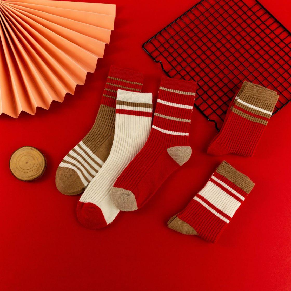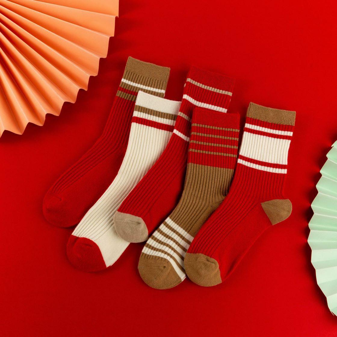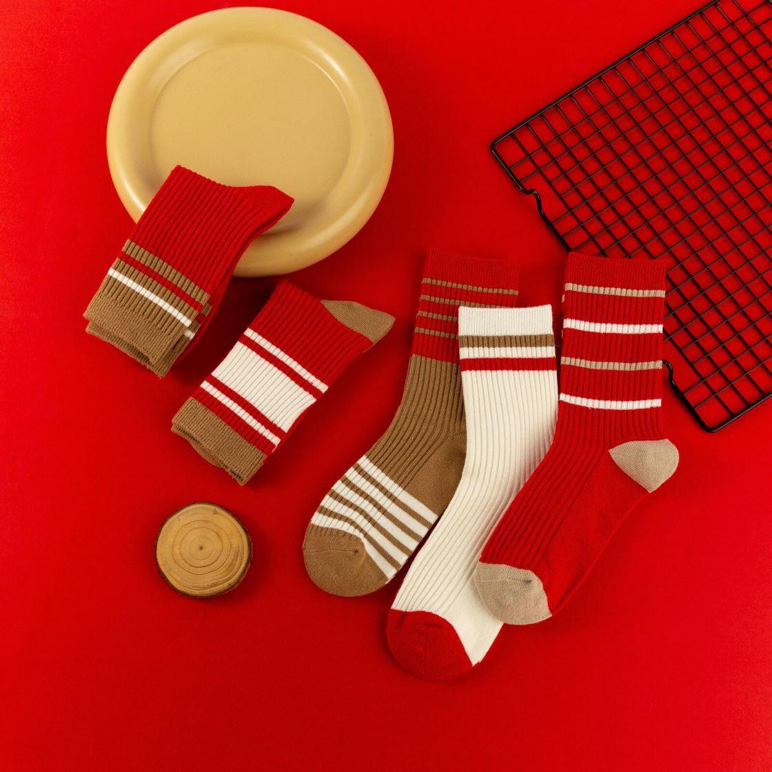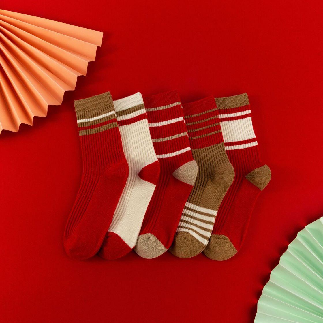 Nova chegada Ano Novo Vermelho Festivo Cano Alto Ano Novo Meias de Tamanho Médio Meias de Algodão Confortáveis Respiráveis Casamento Listrado All-match Feminino