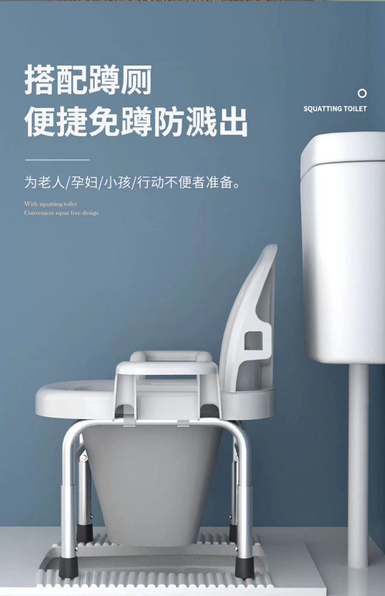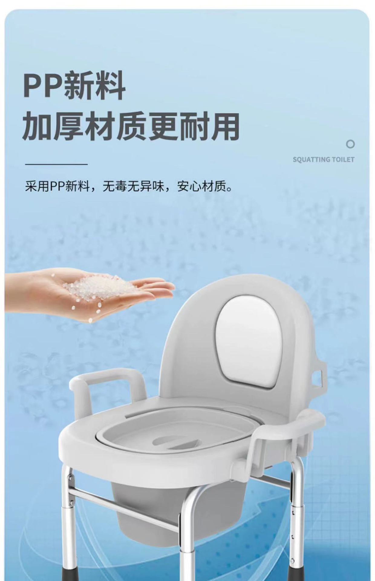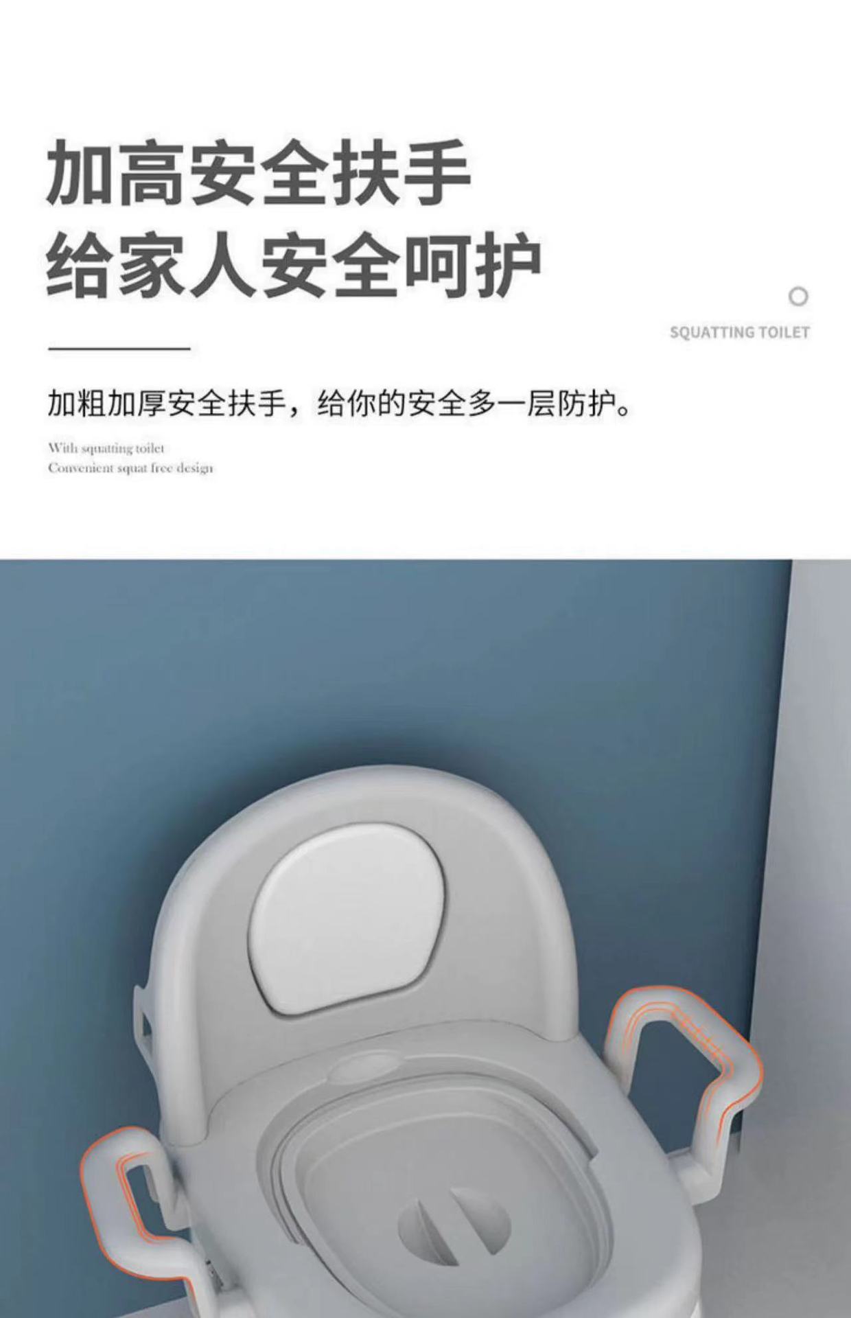 Adjustable for room use (solid bucket 1 + backrest), Can be raised and lowered for squatting pit (hollow bucke...