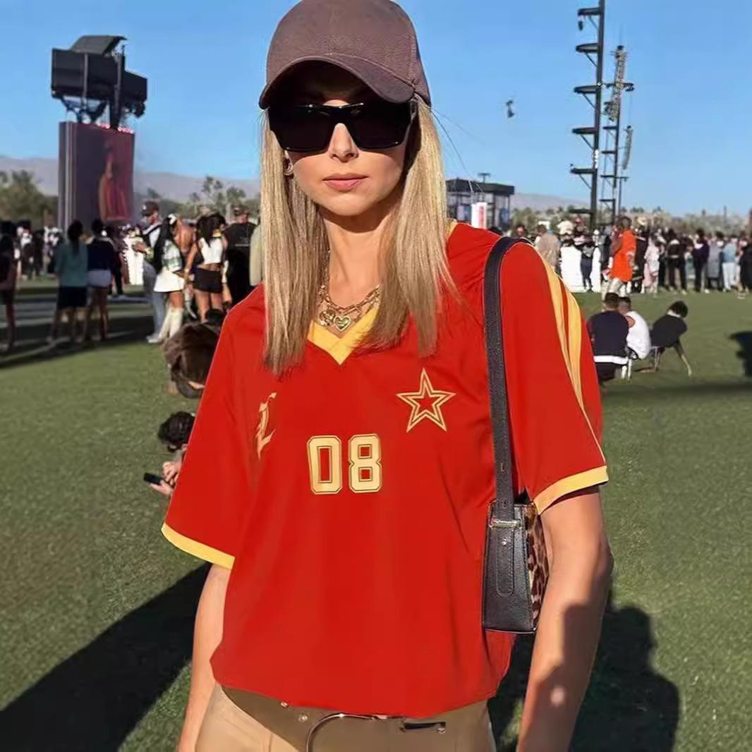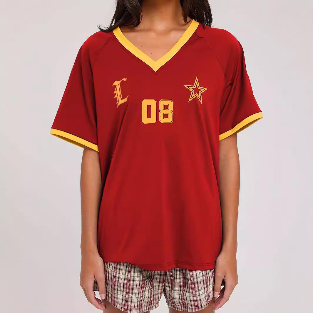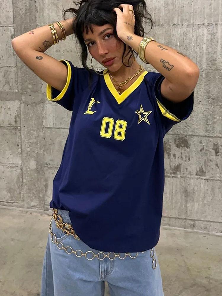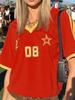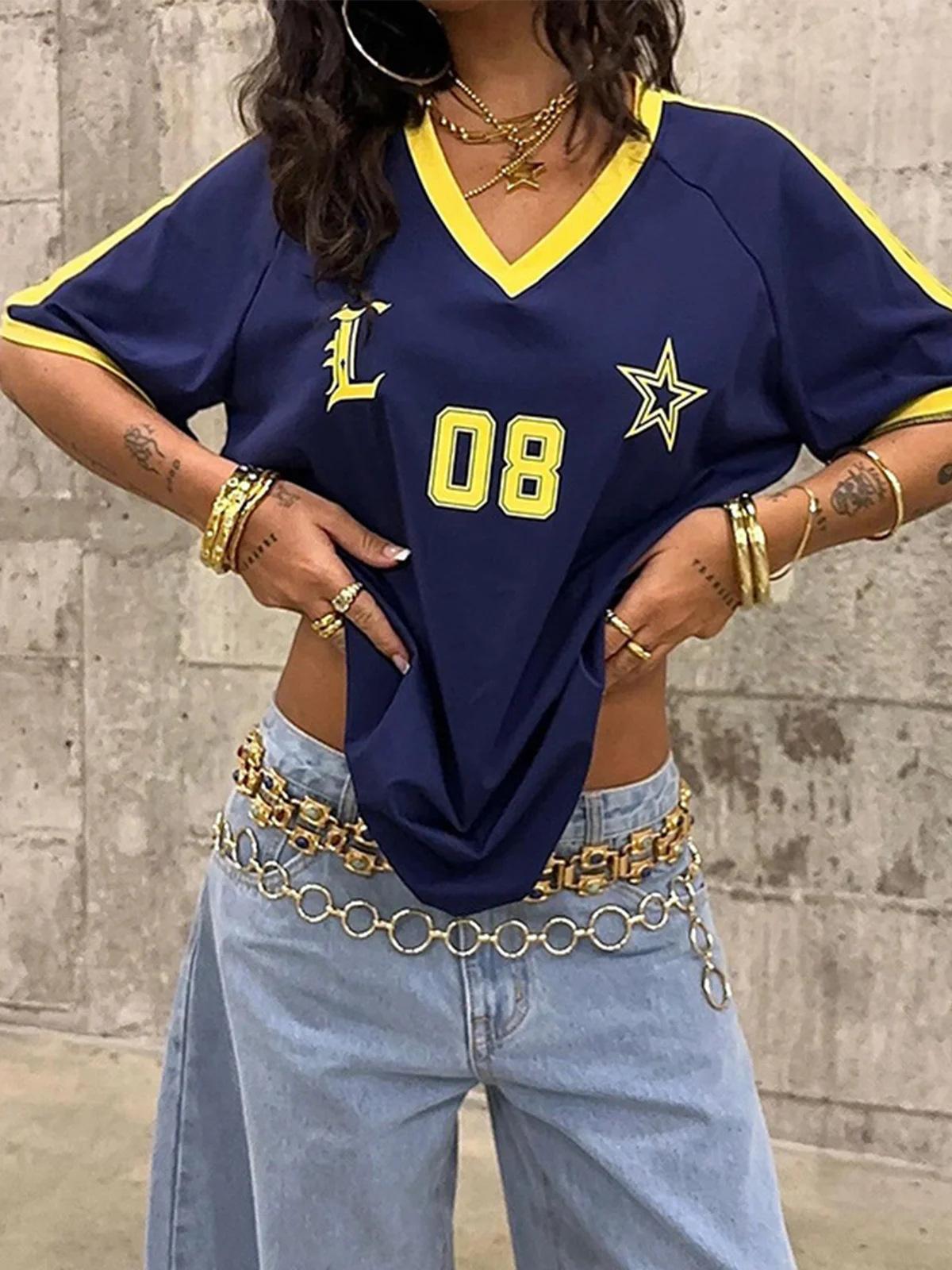 Europeu e americano Cross-border 2024 Primavera Festival Moda Feminina Nova manga comprida V-neck Carta Impresso Solto All-match T-shirt