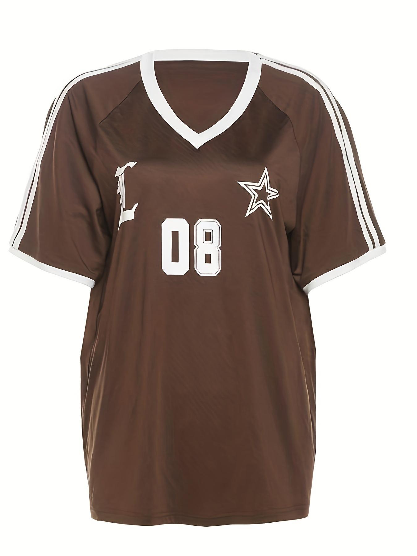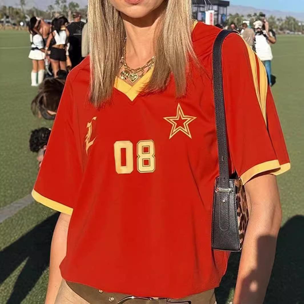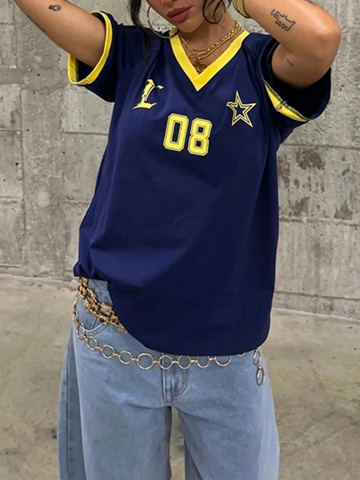 Europeu e americano Cross-border 2024 Primavera Festival Moda Feminina Nova manga comprida V-neck Carta Impresso Solto All-match T-shirt