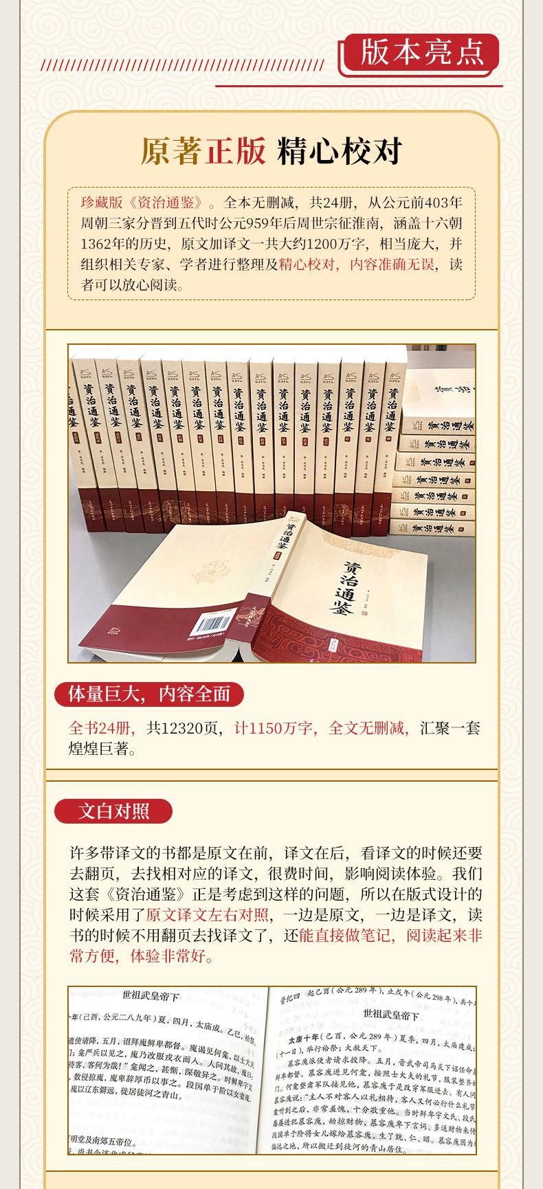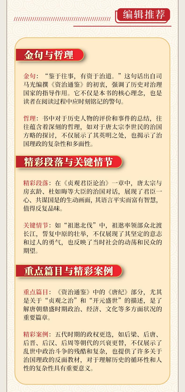 O Zizhi Tongjian é uma história cronológica (The Records of the Grand Historian é a primeira história biográfica, e os Spring and Autumn Annals são os primeiros livros de história cronológica existentes). Ele narra eventos históricos em ordem cronológica, frequentemente usando técnicas retrospectivas e de epílogo para explicar as causas e consequências de eventos históricos, o que torna fácil para as pessoas obterem uma impressão sistemática e clara. Seu conteúdo é principalmente fatos políticos e militares, e os usa para mostrar a governança, sucesso, fracasso, segurança e perigo de monarcas e ministros em dinastias sucessivas como uma referência para a história. Ele descreve as vidas e lutas de pessoas de todos os grupos étnicos.