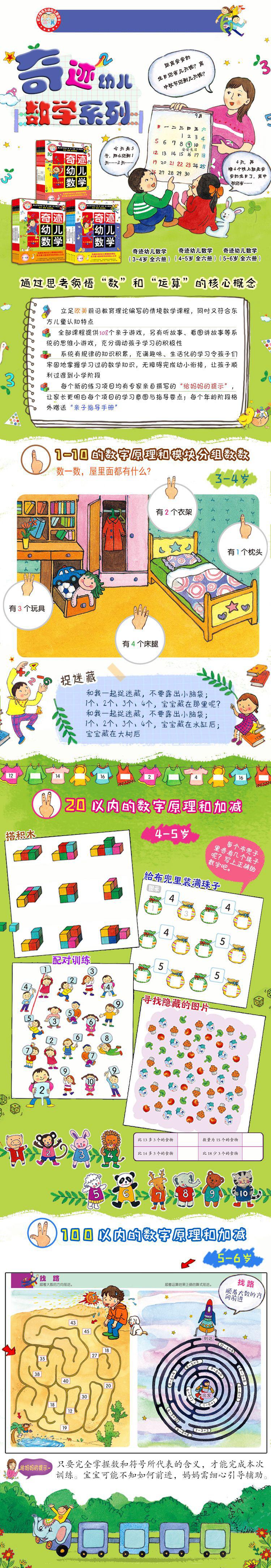 ? ? ? ? Começando pela vida diária, deixe as crianças entenderem fundamentalmente o conceito de números, estabeleça a base matemática das crianças por meio das coisas com as quais as crianças estão mais familiarizadas, aprenda matemática difícil como jogar jogos interessantes, cultive sistematicamente o pensamento matemático e o pensamento racional das crianças na primeira infância, de modo a cultivar a capacidade de resolver problemas de forma independente e restaurar a matemática em nossa vida mais adorável. ? Os pais são os melhores professores para as crianças. É o maior desejo de todos os pais deixar as crianças se apaixonarem pela matemática em jogos, consolidar o conhecimento por meio da prática sistemática e aplicá-lo de forma flexível. "Miracle Children's Mathematics" é dividido em 3 estágios de idade (3-4 anos, 4-5 anos, 5-6 anos), com 6 livros em cada estágio. Ele usa a vida como material e utiliza os cenários mais familiares para as crianças conduzirem o treinamento matemático, como parques de diversão, zoológicos, etc. Em todos os cursos, mais de 100 jogos fáceis de operar para pais e filhos e jogos práticos interessantes e estimulantes para o cérebro são fornecidos às crianças para estimular o interesse delas em aprender por meio de jogos.