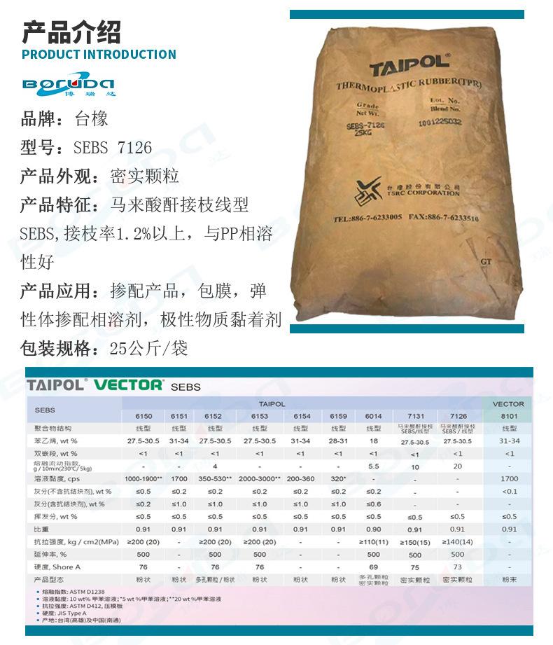 TAIPOL 7126 é um produto de copolímero de estireno-etileno-butileno-estireno (SEBS), SEBS enxertado com anidrido maleico, teor de enxerto de 0,8%, é uma versão atualizada do TAIPOL 7131, baixo odor, boa compatibilidade. Está disponível na região de Tai-Tai. TAIPOL 7126 é usado principalmente para revestimento de filme, modificador de plástico de engenharia, compatibilizador de mistura de elastômero, adesivo de material polar. As principais características incluem: alto teor de enxerto, excelente compatibilidade com plásticos de engenharia, excelente compatibilidade com substâncias polares.