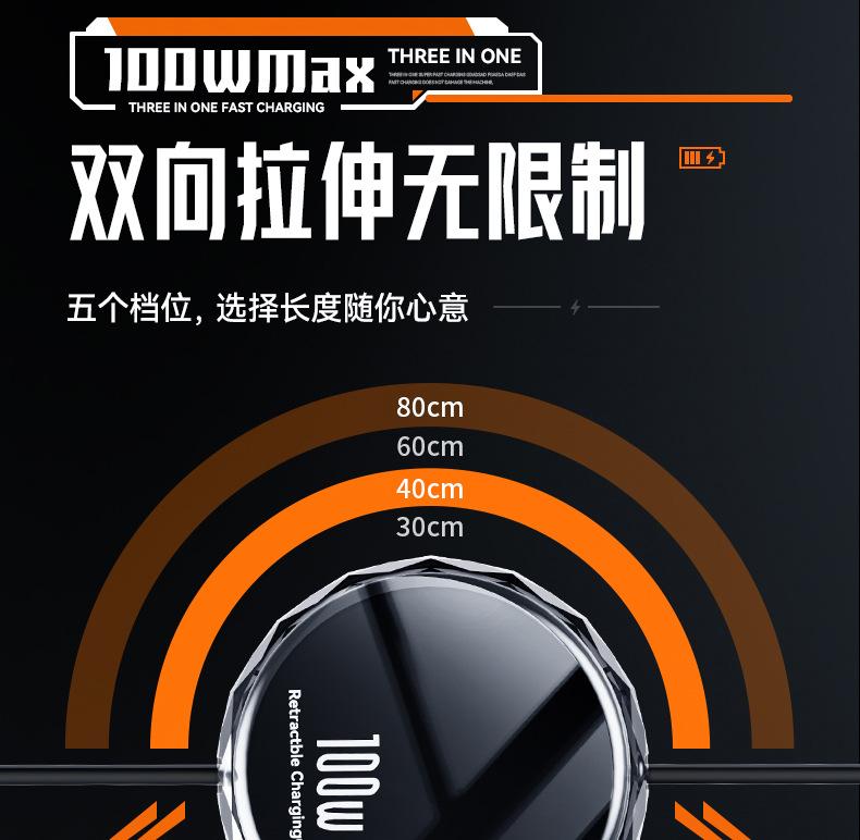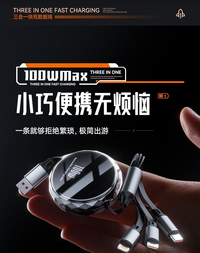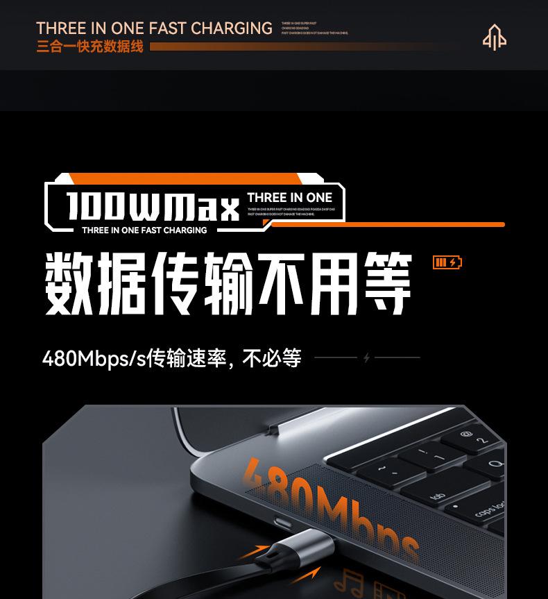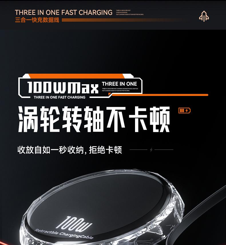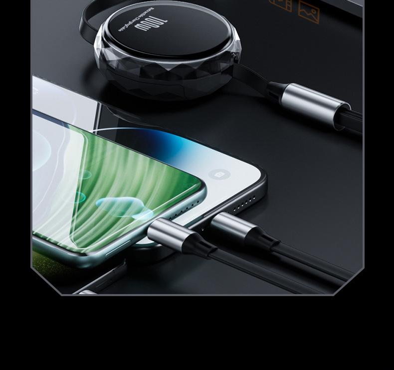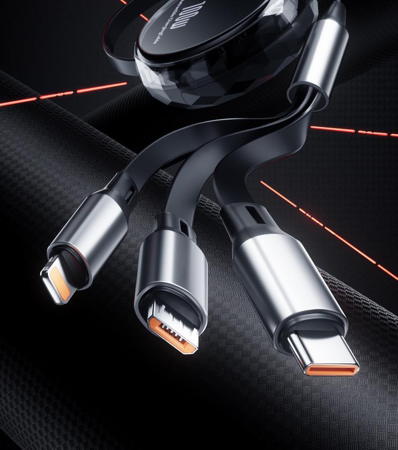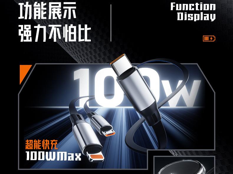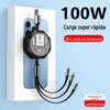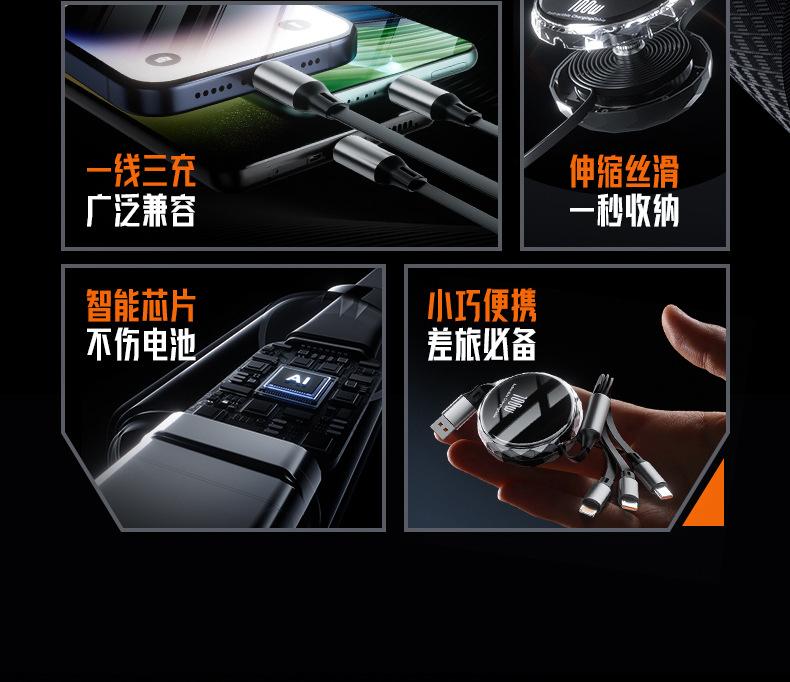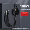 Cabo de dados telescópico de 100 W três em um cabo de carregamento rápido de um a três três cabeças para Apple Huawei Android carro