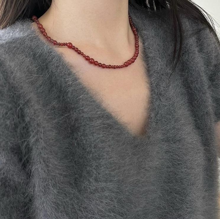 Compre Francês Retro Nicho Vermelho Ônix Colar Longo Outono e Inverno Novo Irregular Preto Ônix Bola Redonda Contas De Lã Corrente no atacado no Joom.pro