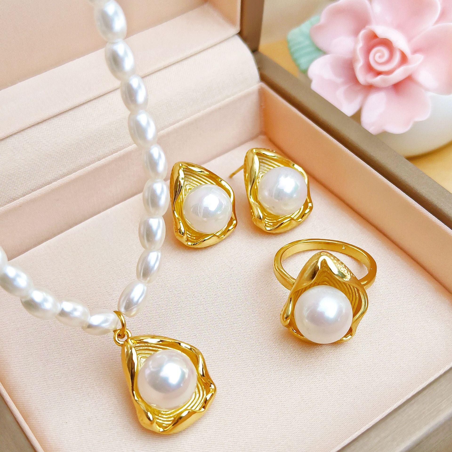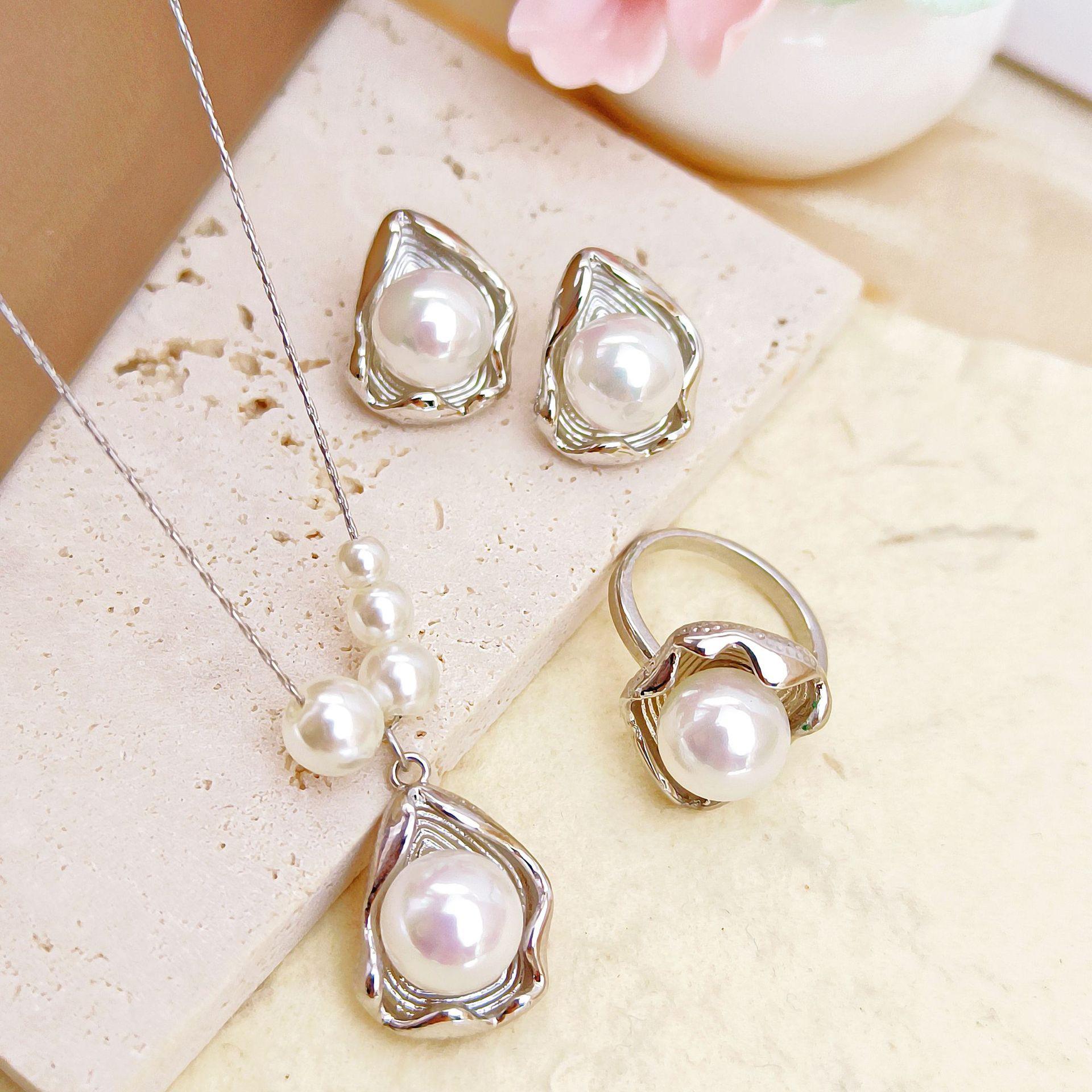 Conjunto de Joias Femininas de Alta Qualidade em Aço Titânio Novo com Zircônia e Flor, Não Desbota, Brincos de Pérola, Anel, Colar
