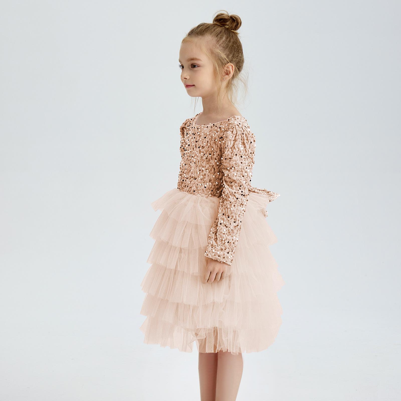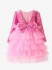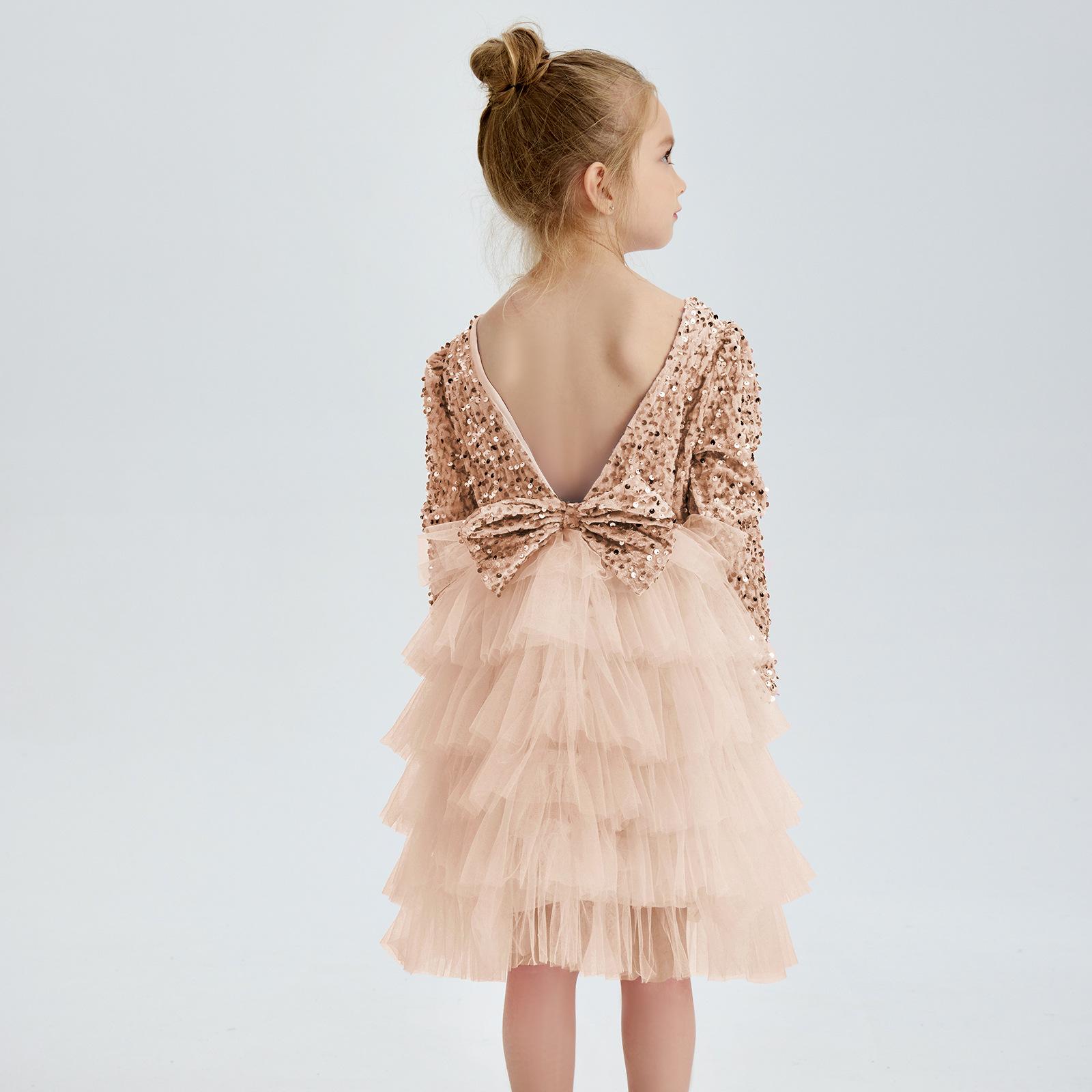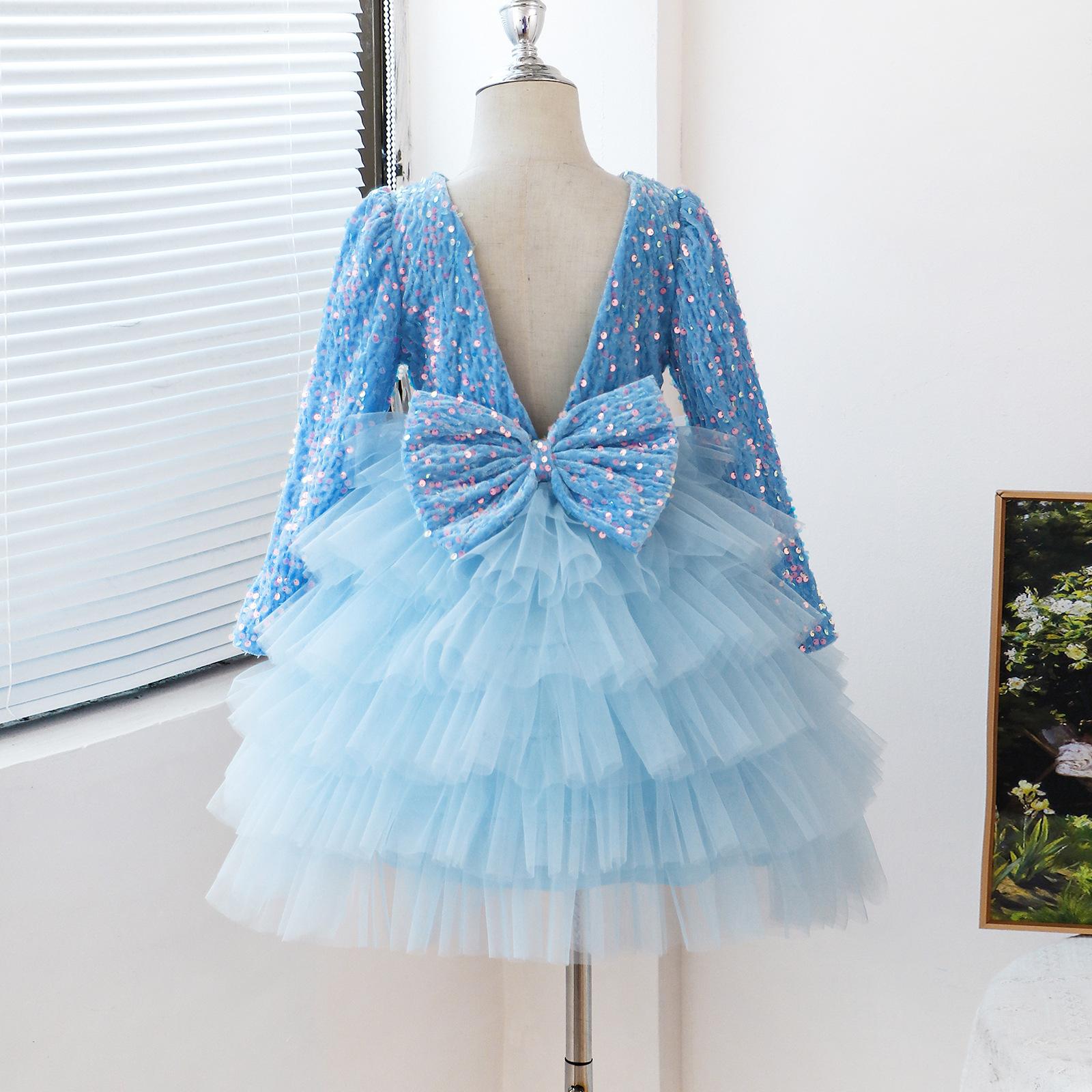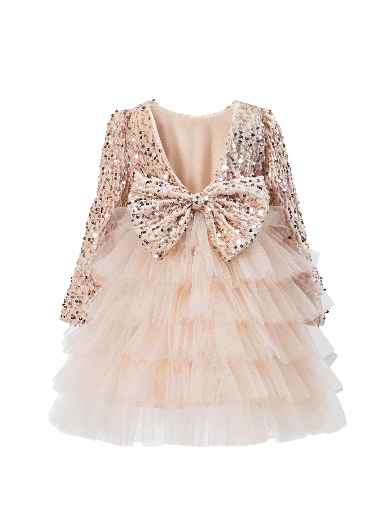 Vestido de Menina Sem Costas Laço Temu Primavera & Outono Saia Tutu Vestido de Manga Comprida com Lantejoulas Vestido de Princesa Infantil