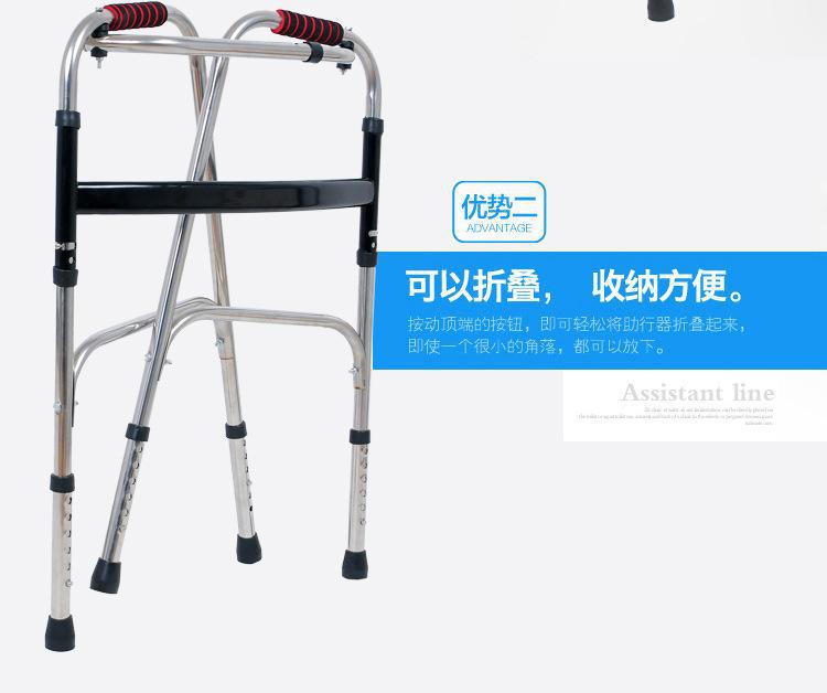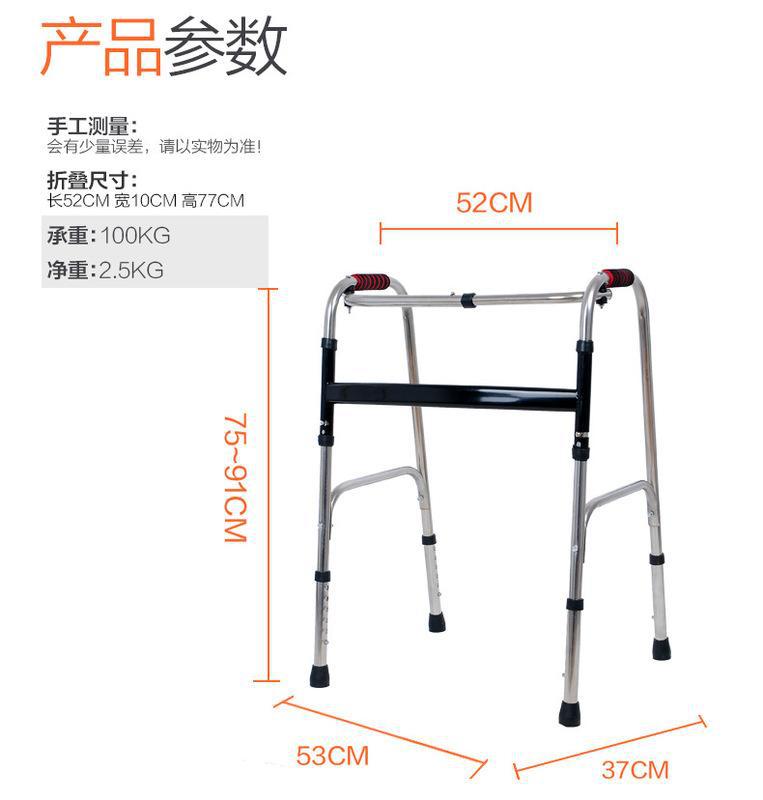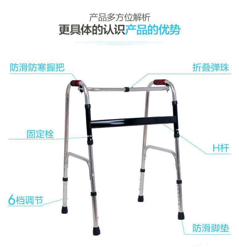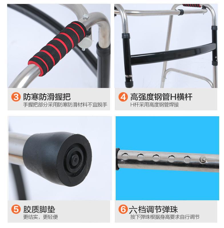Pode ser dobrado, fácil de guardar e transportar; a parte da empunhadura é coberta com material antiderrapante, que não escorrega facilmente das mãos; o pé é equipado com uma base de borracha para aumentar o atrito com o solo, tornando-o mais seguro de usar. É feito de aço inoxidável, que é leve e durável como um todo, pesando cerca de 2,5 kg (como o andador é uma estrutura de quadro, o peso real suportado por ambas as mãos é inferior a 2 kg, o que é muito leve!);