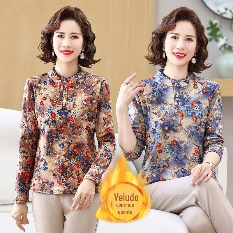2024 outono e inverno nova camiseta feminina manga longa moda temperamento floral forrado de lã camisa de fundo quente mãe top