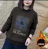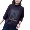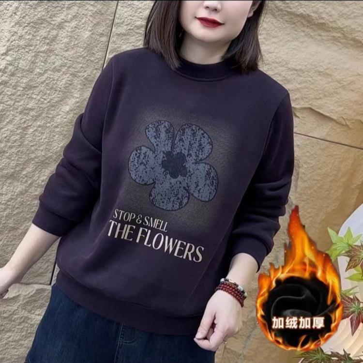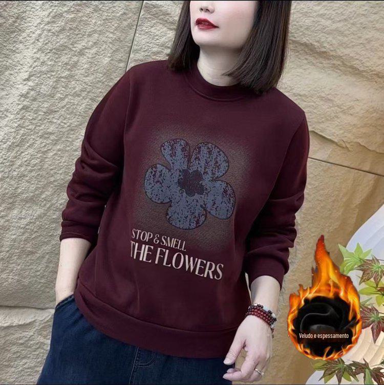 2024 Inverno Novo Gola Redonda Estampado Moletom Feminino Solto Casual All-match Moda Mãe Forrado de Lã Manga Comprida Top
