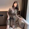Vestido feminino sexy com decote em V profundo e estampa de leopardo para boate, roupa de trabalho para bar