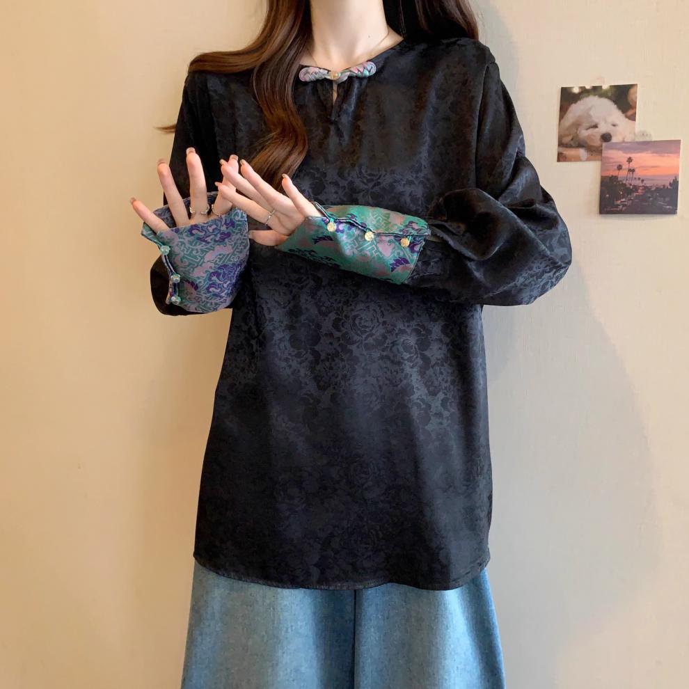 Compre [Original] Camisa de Manga Comprida Estilo Nacional Estilo Chinês Novo com Botão de Disco para Mulheres 2025 Outono Look Solto Emagrecedor Top de Cor Contrastante no atacado no Joom.pro