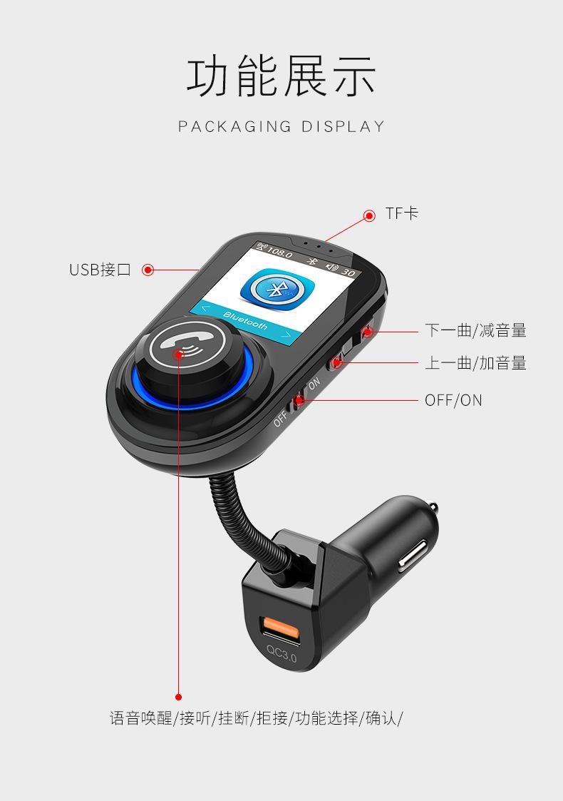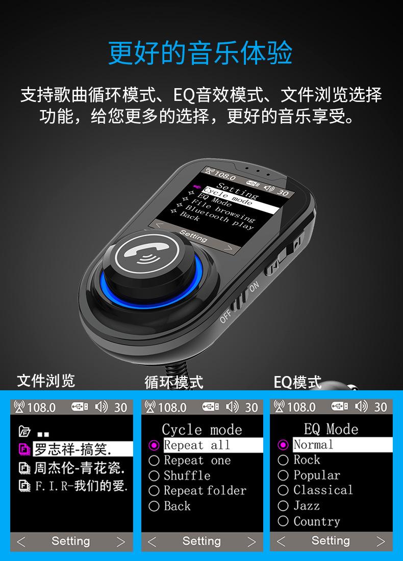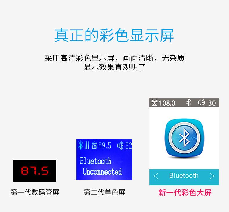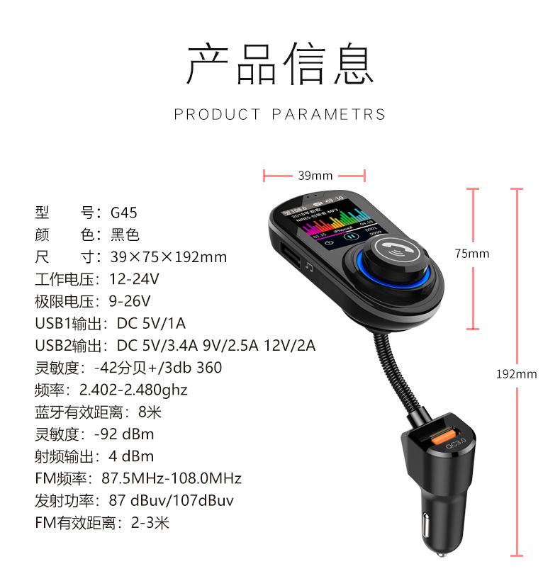 G45 é uma versão atualizada do MP3 player Bluetooth para carro, com uma tela colorida de alta definição de 1,8 polegadas, que pode exibir uma variedade de interfaces de trabalho e estados de operação, tornando a tela mais bonita e mais conveniente de usar. Ele usa um módulo Bluetooth de alto desempenho de nível profissional e chip de decodificação de áudio para lhe dar o melhor prazer musical.