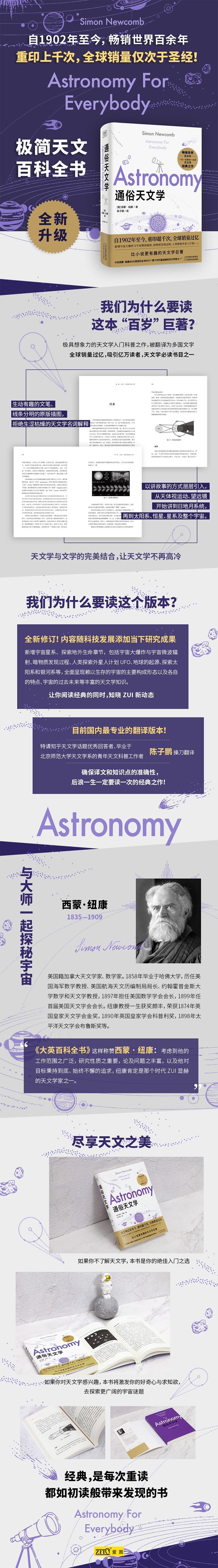 Um bom guia introdutório para entender o universo, tornando a astronomia fácil de entender e usar! A obra-prima clássica de astronomia do astrônomo americano Simon Newcomb é um leitor de ciência popular que varreu o mundo. Começando com a estrutura do universo, este livro apresenta a operação de corpos celestes, incluindo o sistema solar, como determinar a posição dos corpos celestes, o movimento anual da Terra, etc., e então conta o desenvolvimento e as mudanças da ferramenta para observar corpos celestes - telescópios, dos telescópios refratores iniciais aos telescópios refletores e, então, aos telescópios catadióptricos, e adiciona os atuais telescópios ópticos, radiotelescópios, telescópios espaciais e outros conteúdos. O livro também apresenta em detalhes as estrelas, planetas, aglomerados estelares, galáxias, bem como vários corpos celestes, como cometas, meteoros e asteroides, e finalmente adiciona capítulos sobre o universo e as galáxias, e a exploração da vida extraterrestre, incluindo OVNIs, a origem da Terra, a exploração do sistema solar e da Via Láctea, etc., que apresenta completamente os principais componentes do universo dos quais dependemos para sobreviver e suas respectivas características, o passado e o futuro do universo e outros ricos conhecimentos astronômicos.