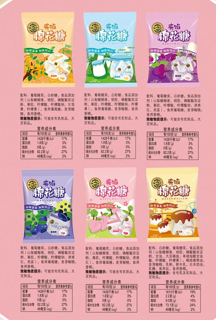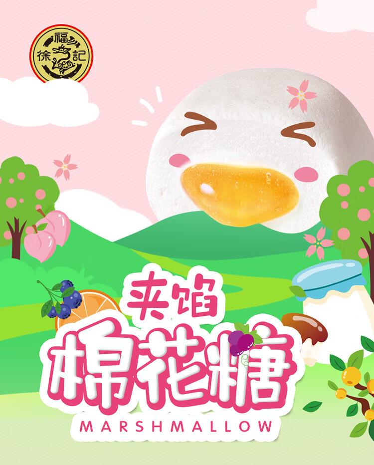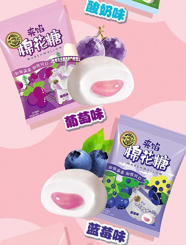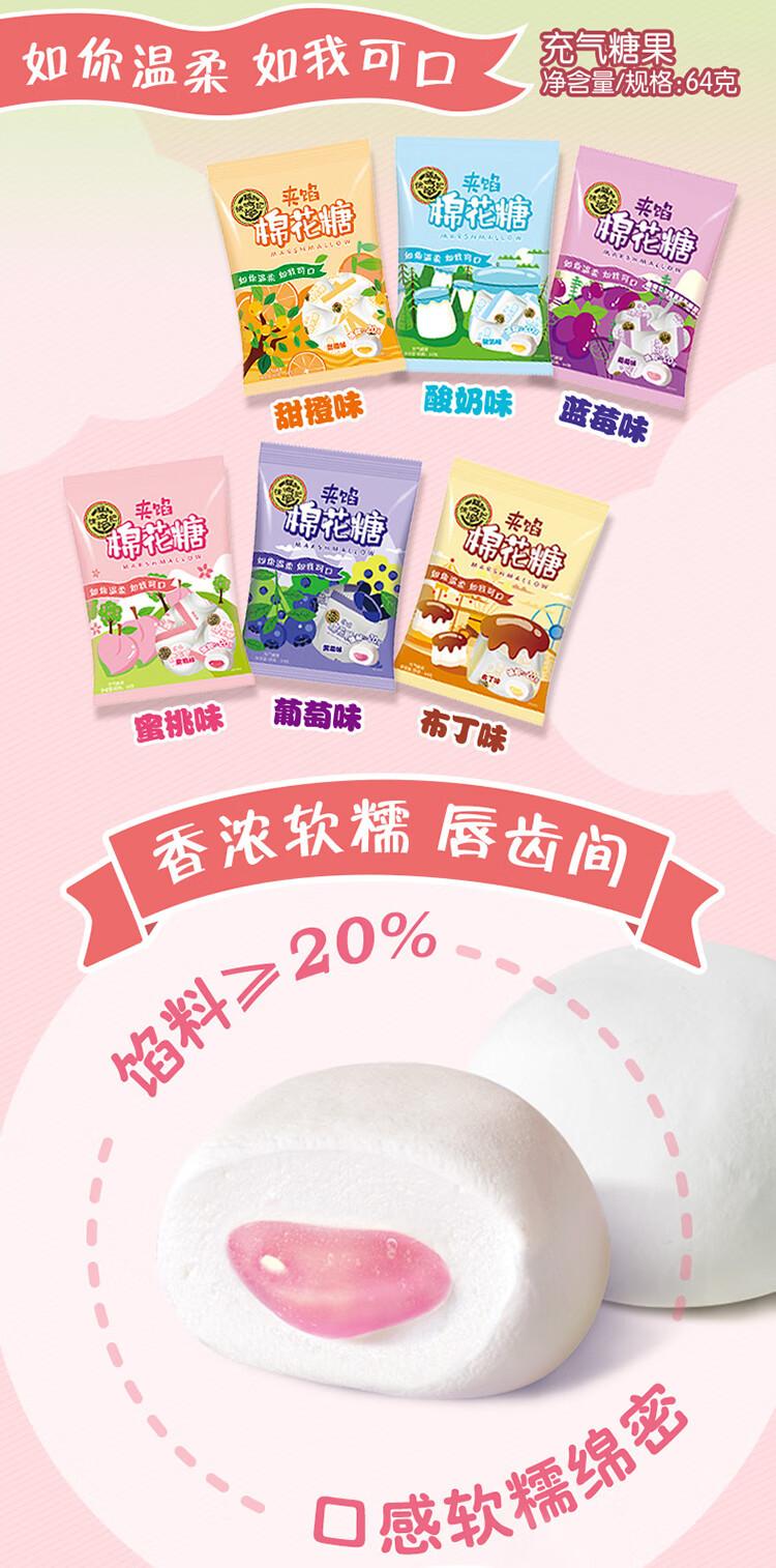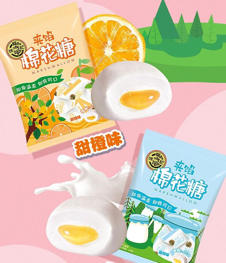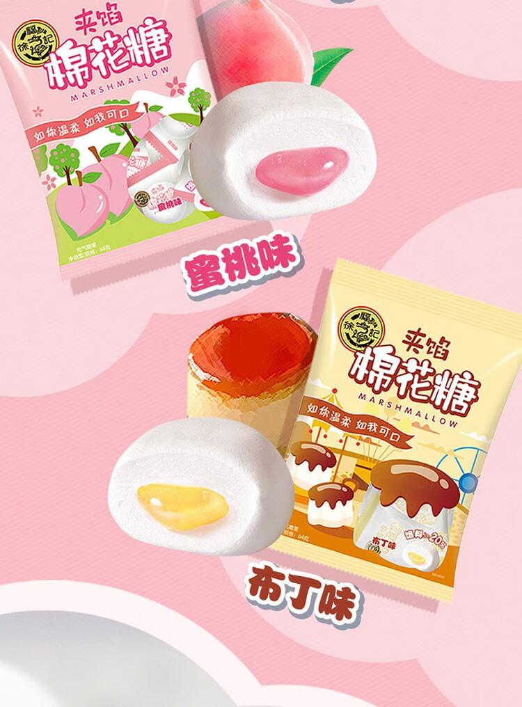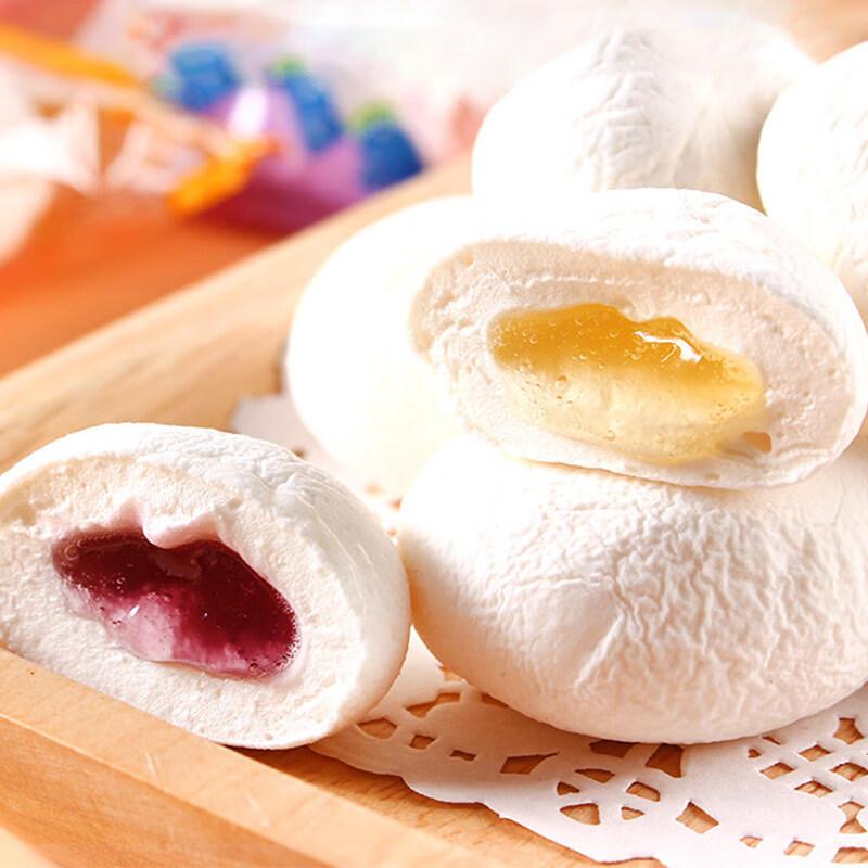 Compre Hsu Fuji Marshmallow Recheado 64g Suco de Frutas Goma Doce Sabor Laranja Uva Sanduíche Estourando Doces Variados Doces de Casamento no atacado no Joom.pro