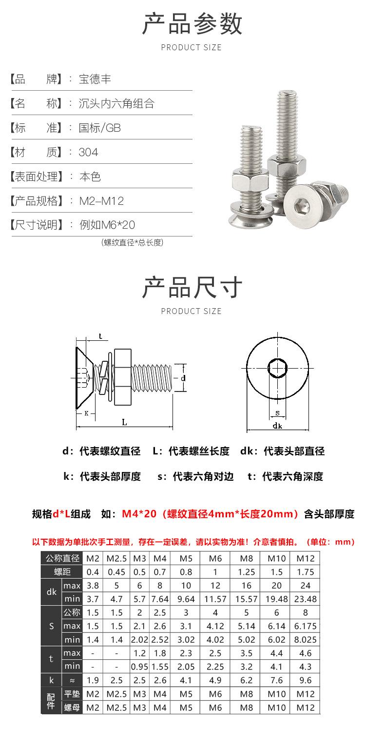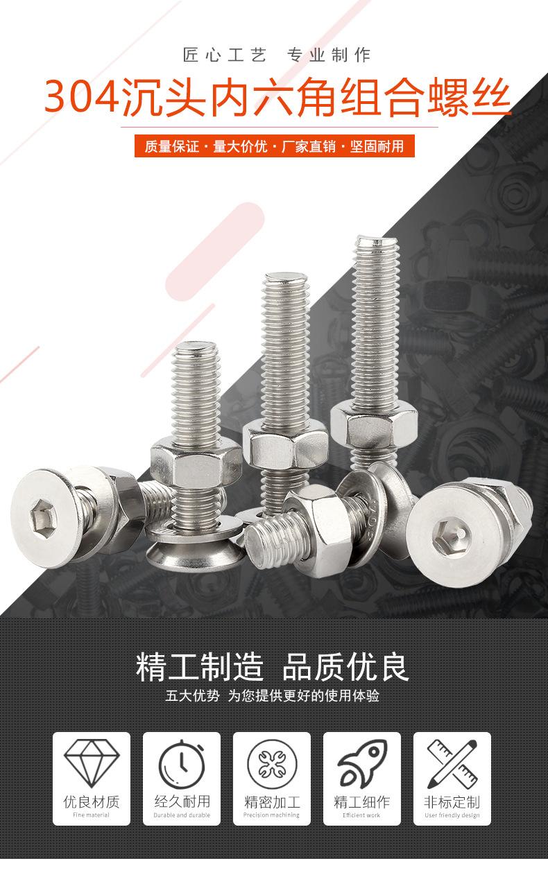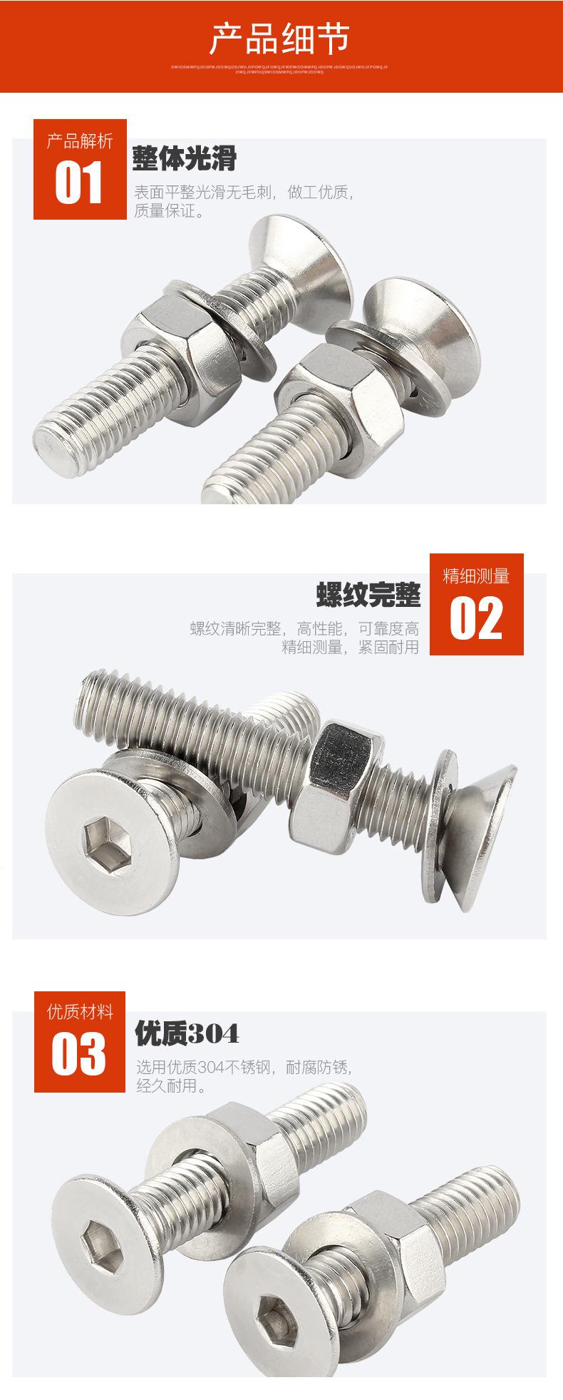Conjunto Completo de Parafuso Sextavado de Cabeça Cônica de Aço Inoxidável 304 com Porca Combinação de Parafuso de Cabeça Chata M2M3M4M5M6M8