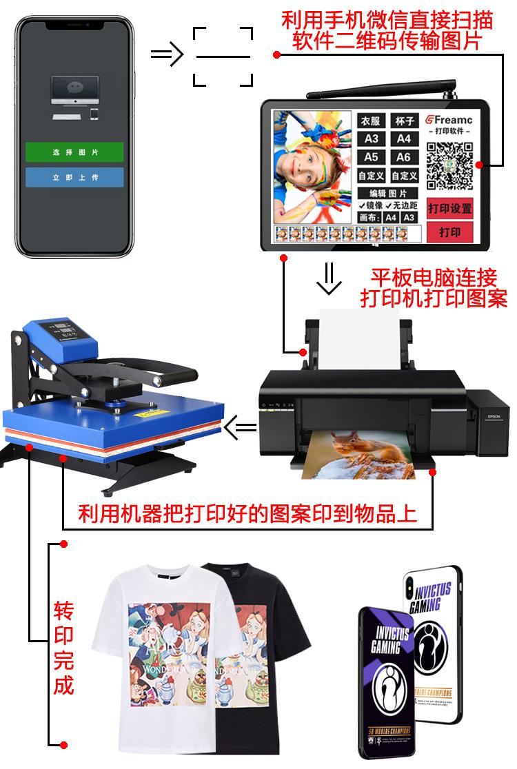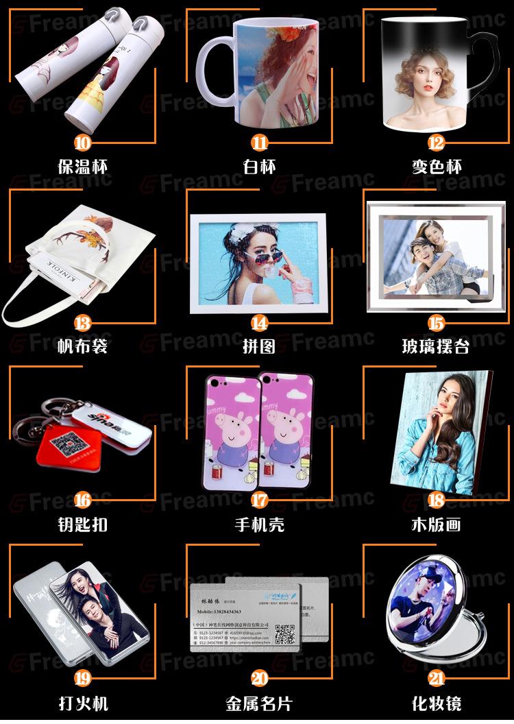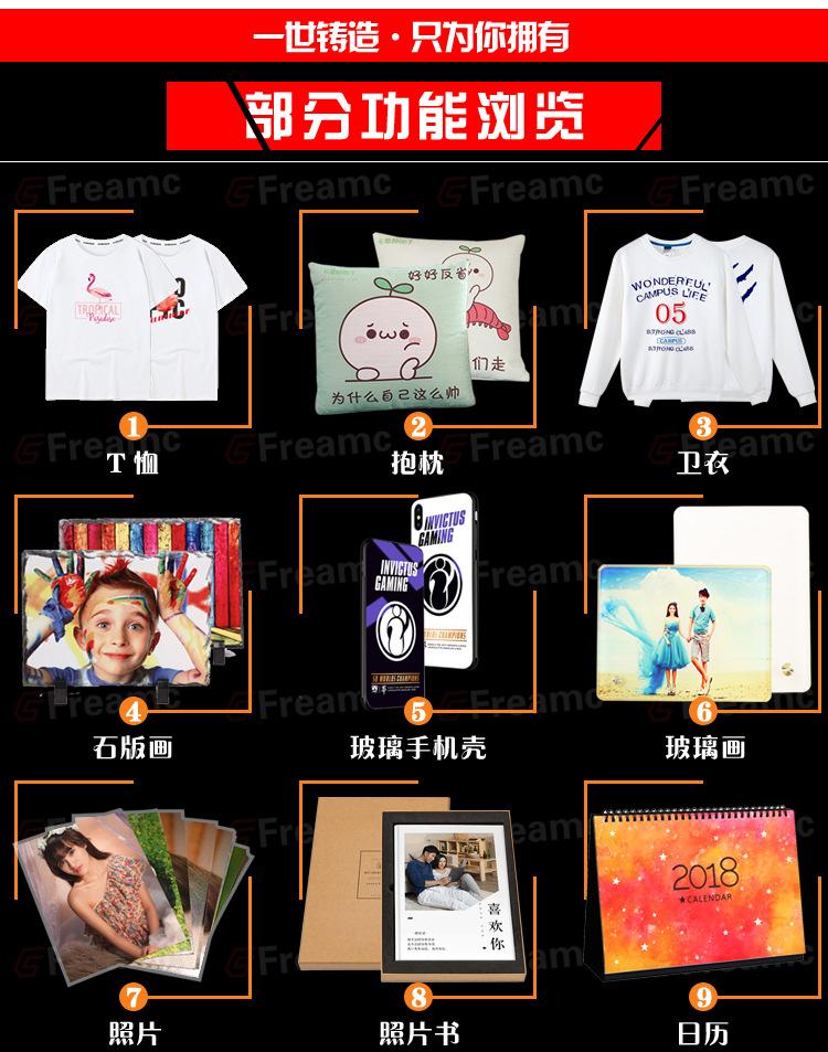 Esta máquina pode transferir por calor os padrões de cores e textos de tintas de sublimação e solventes para algodão, linho, tecidos químicos e outros tecidos. Também pode assar etiquetas coloridas, retratos, padrões de paisagens, etc. em travesseiros, mouse pads, pratos de porcelana e pratos de metal. É especialmente adequada para fazer medalhas, certificados comemorativos, camisas culturais, etc. É econômica e prática.