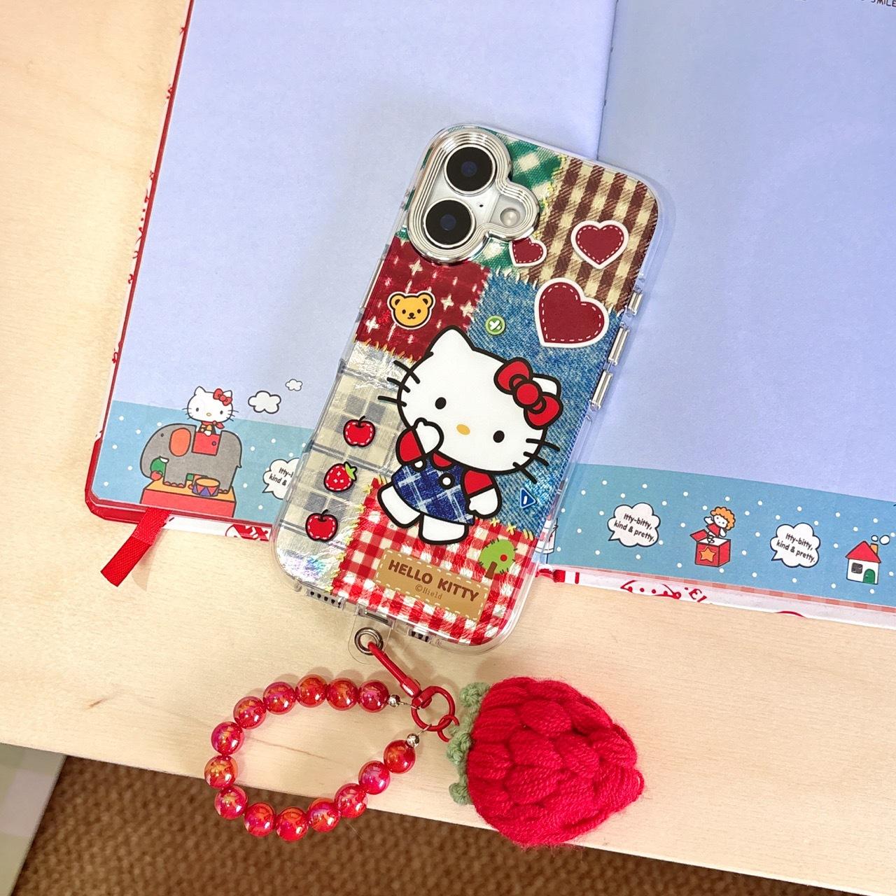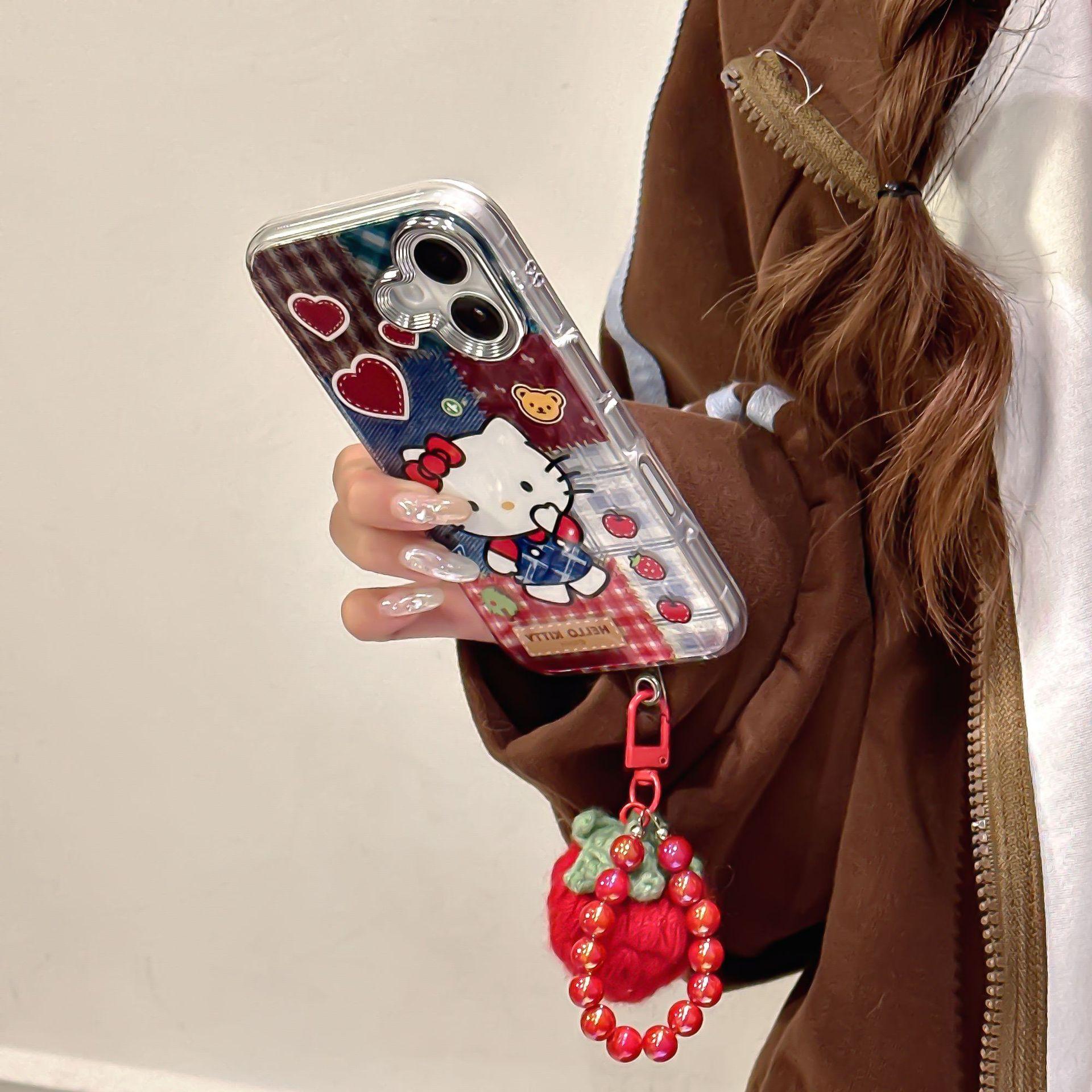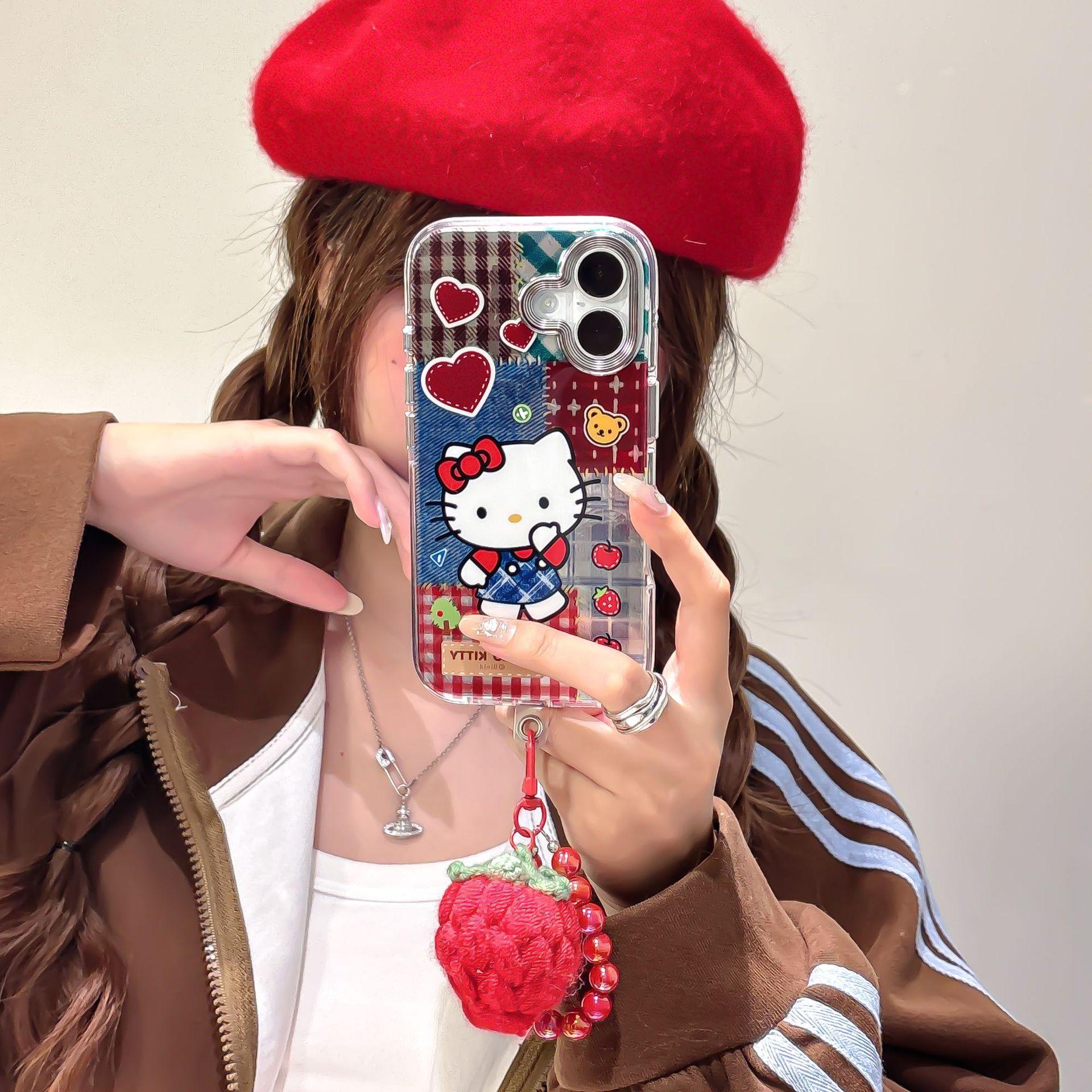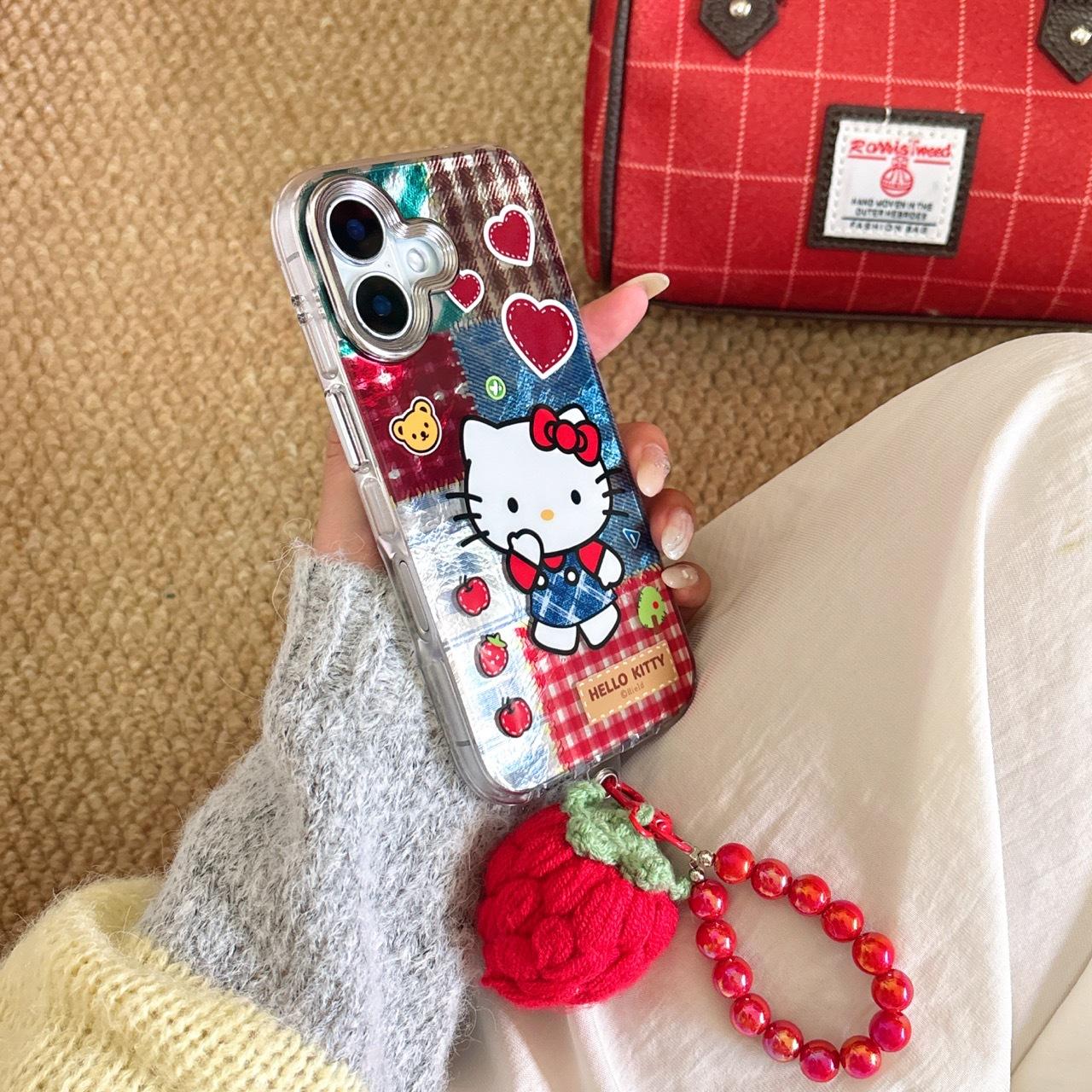 Capa de celular fofa patchwork KT Cat para Apple 16promax iPhone15 desenho animado 14 morango portátil 13