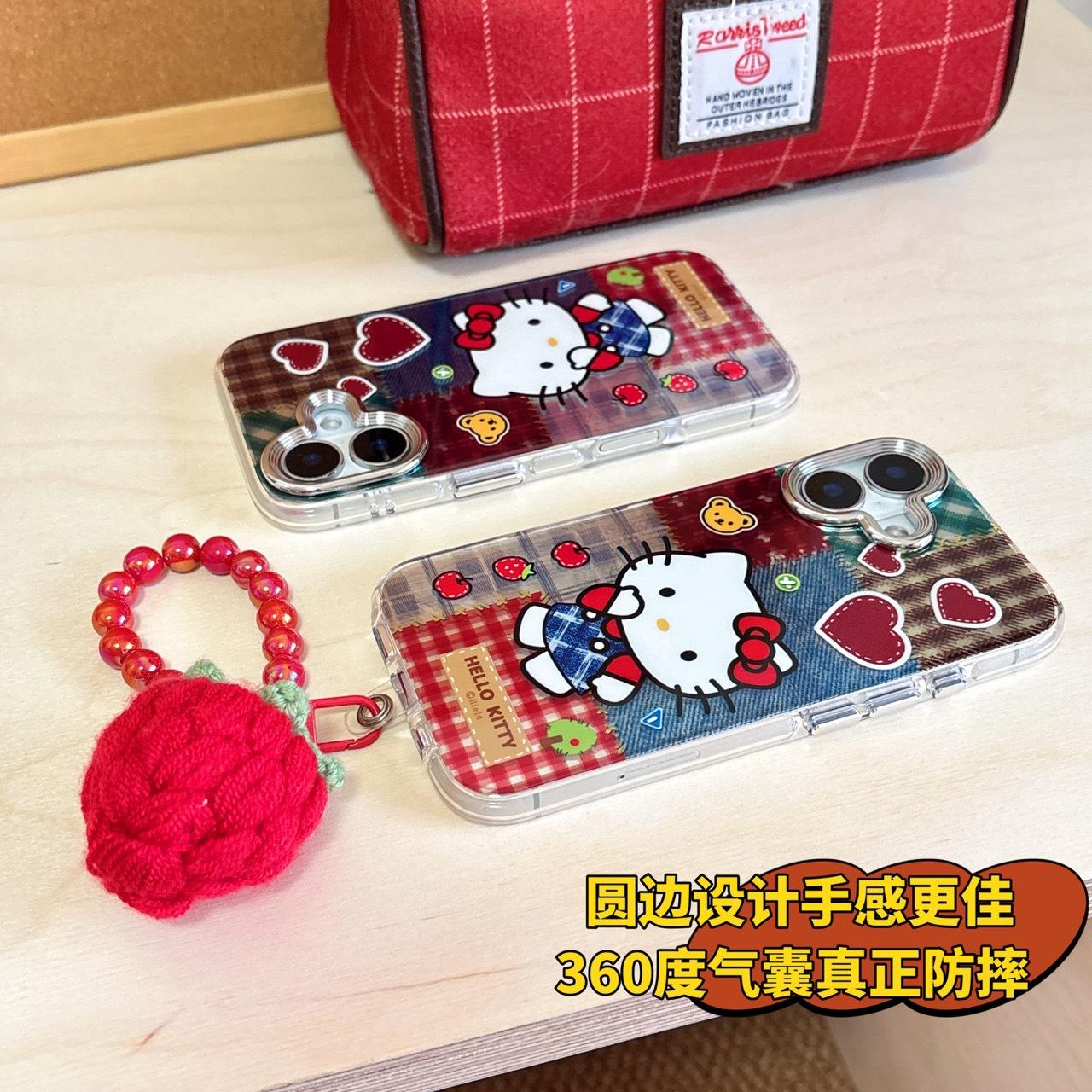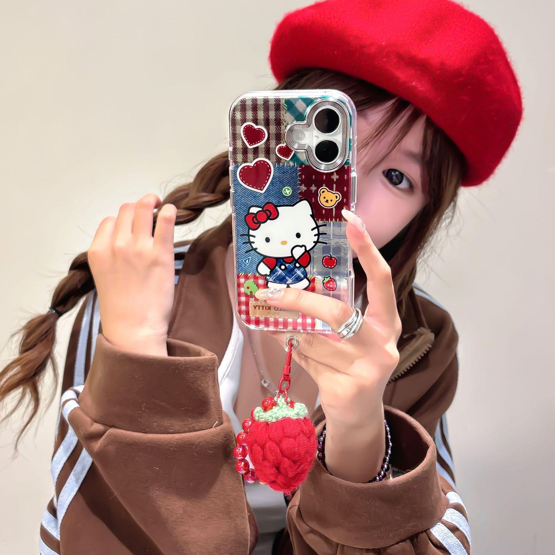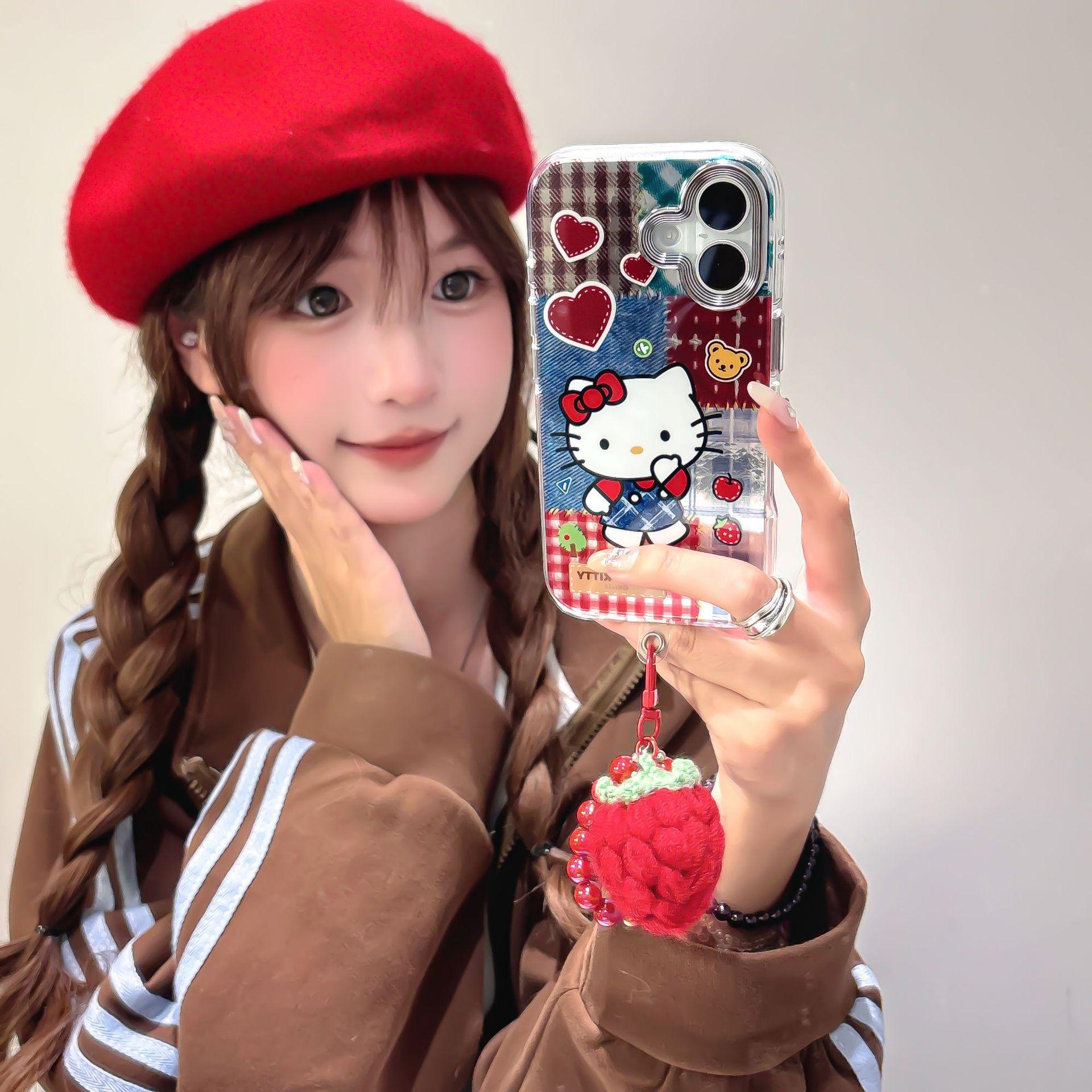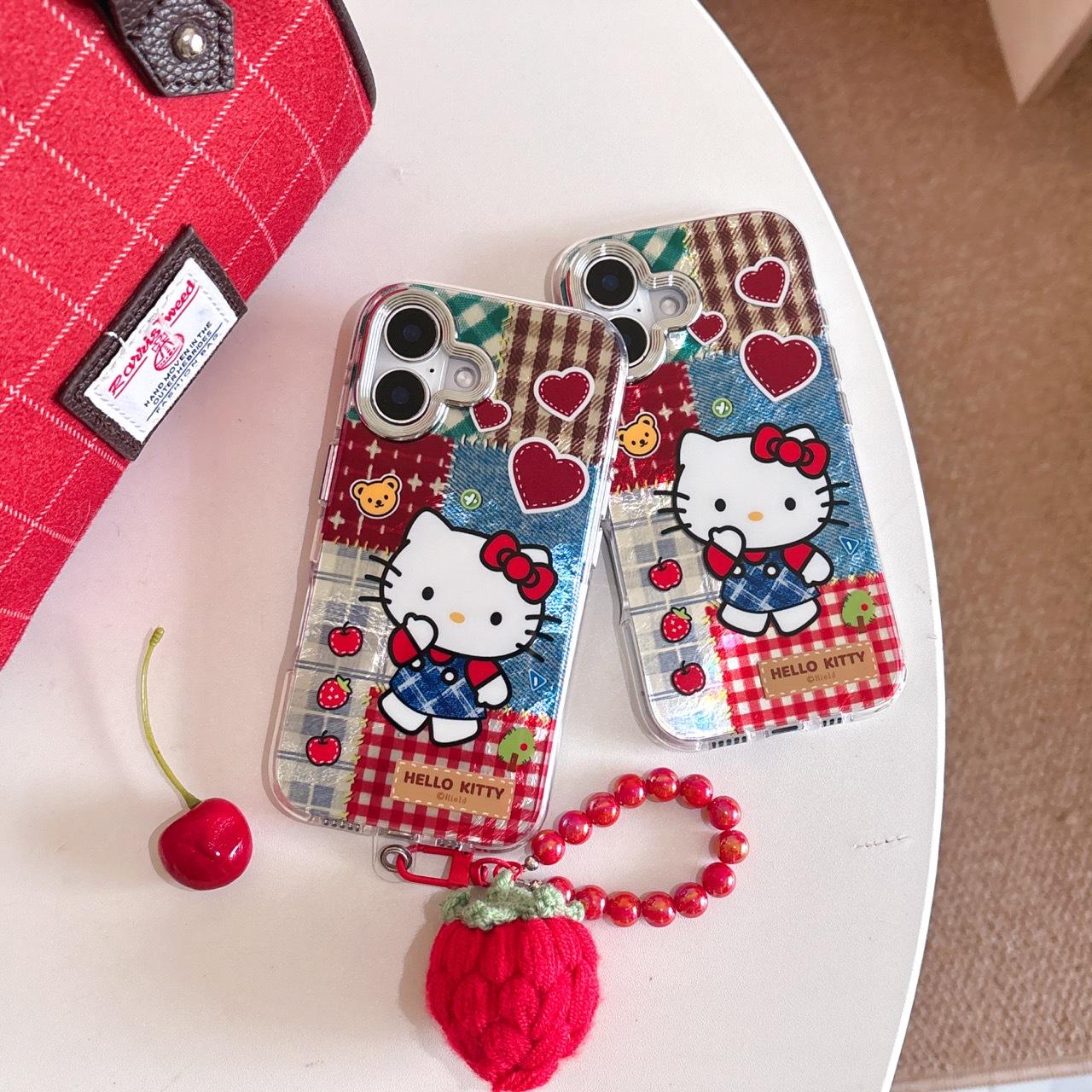 Capa de celular fofa patchwork KT Cat para Apple 16promax iPhone15 desenho animado 14 morango portátil 13