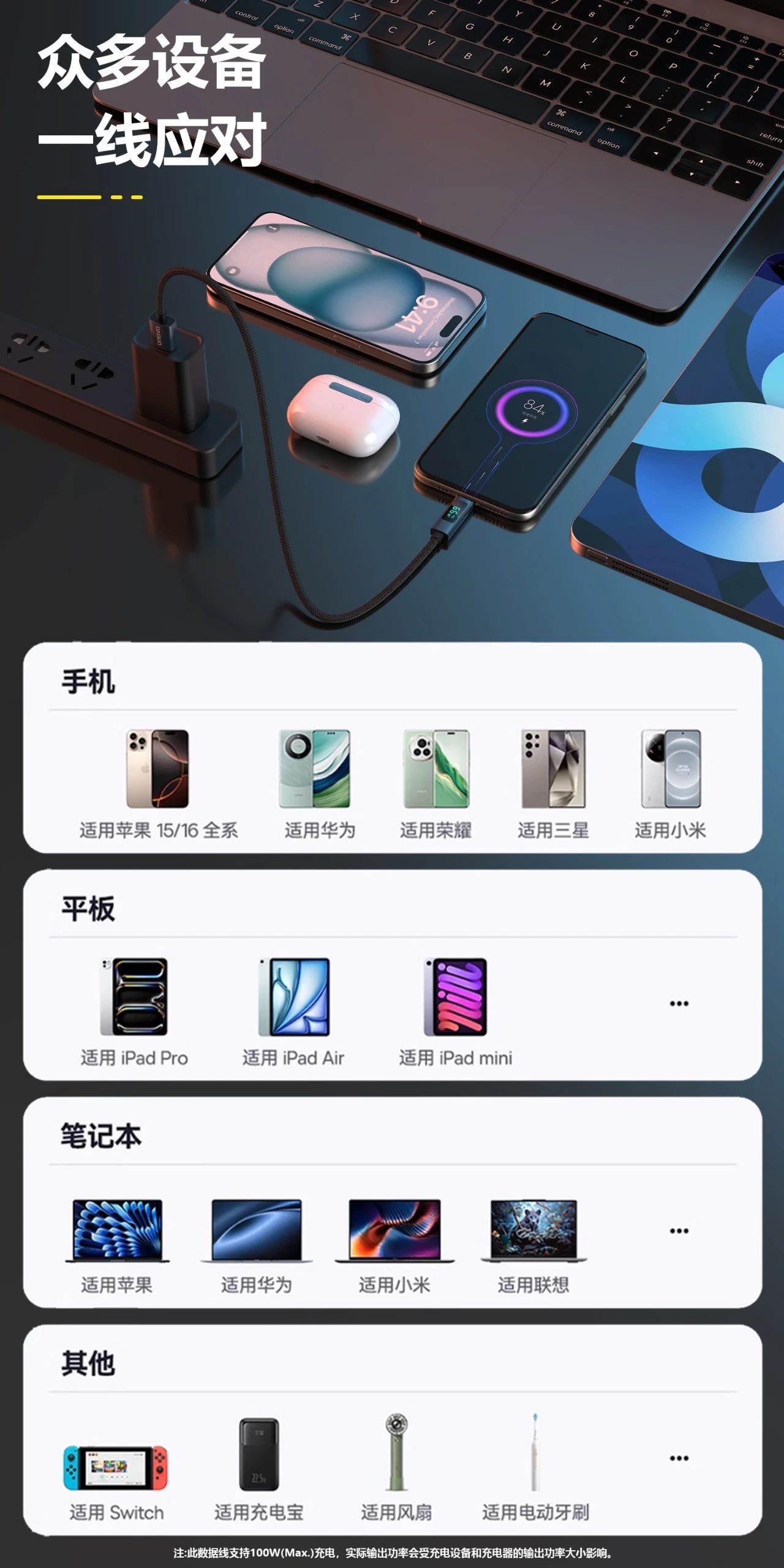 ·Saída de Carregamento Super Rápido de 100W/66W, totalmente compatível com protocolos de carregamento rápido.